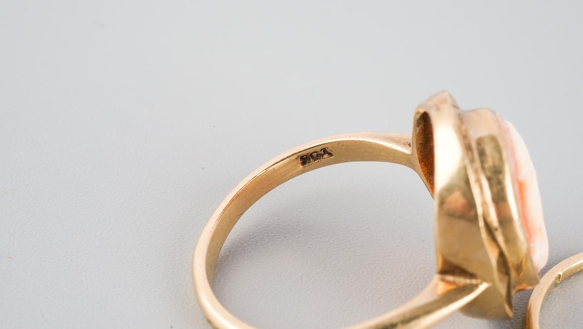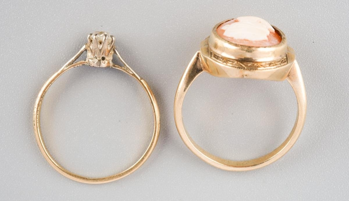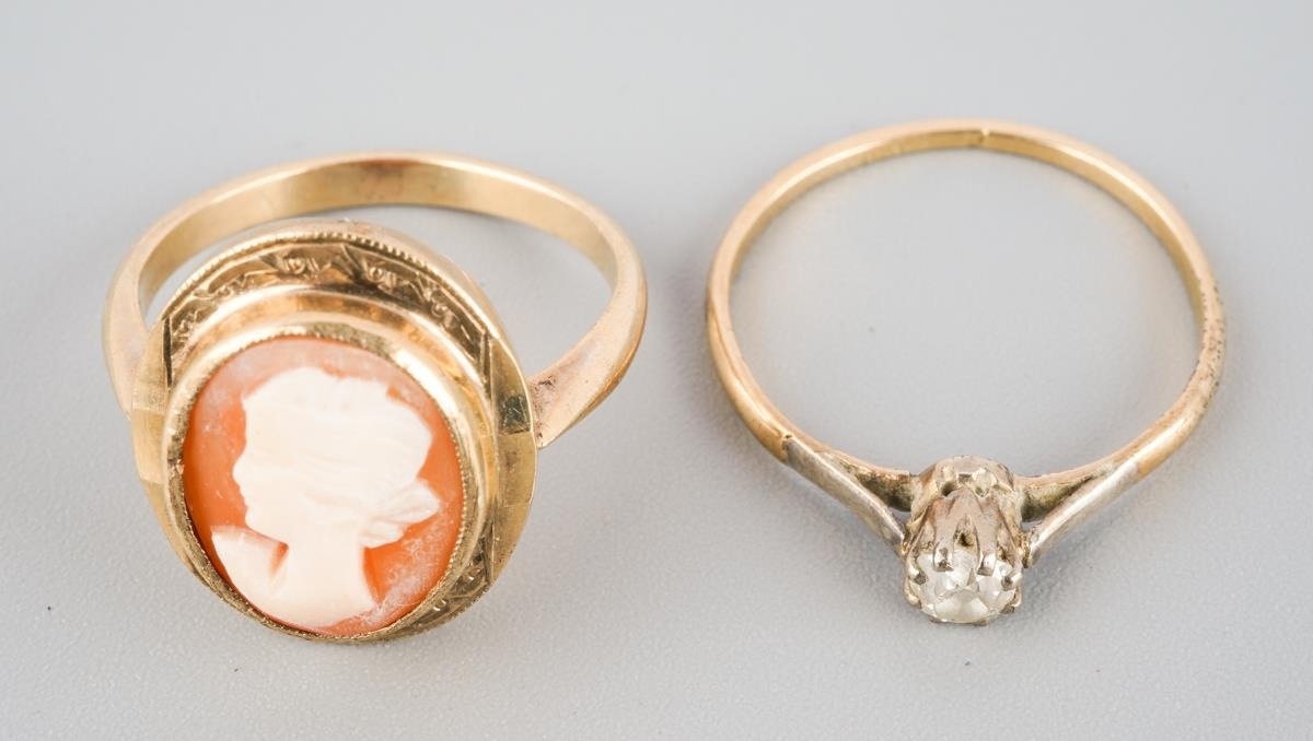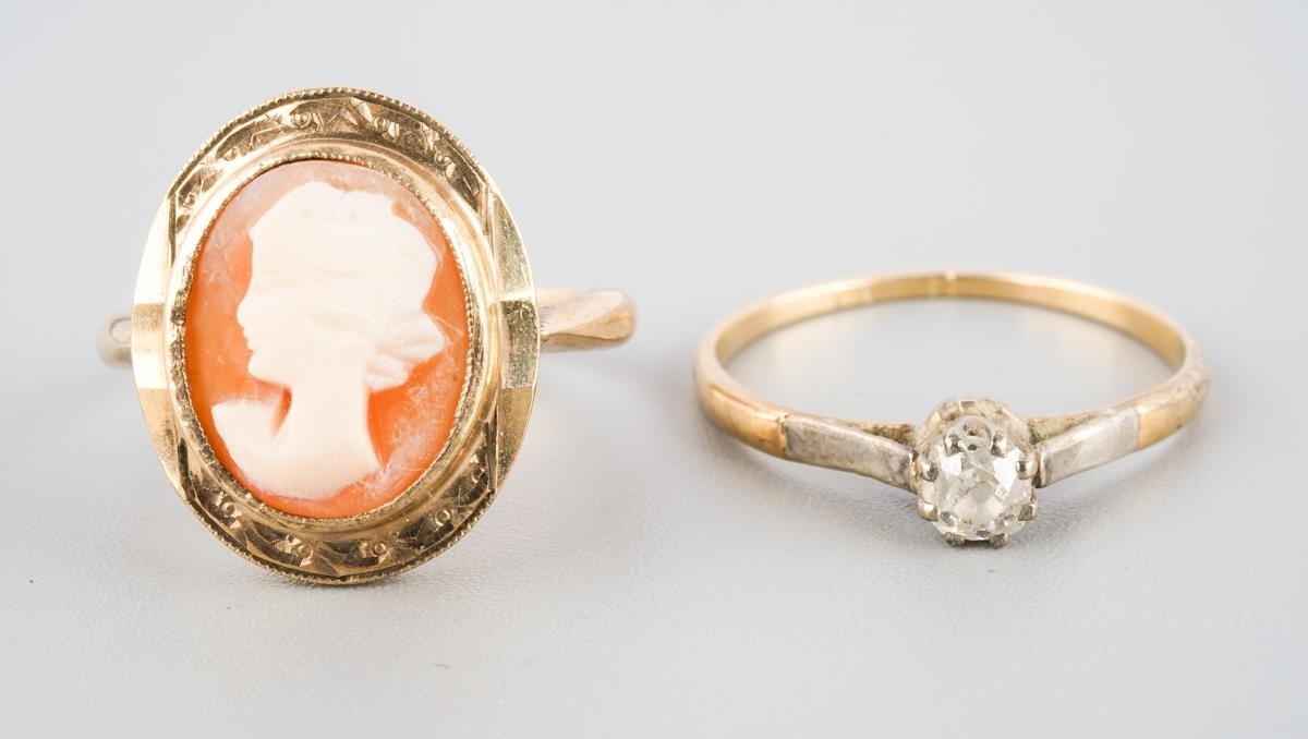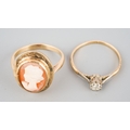 A diamond single stone ring and a cameo ring. The diamond ring set with an old cut diamond (ring stamped 18ct), together with a shell cameo ring (stamped 9ct), approx ring size M and N, approx gross weight 4.8 grams.