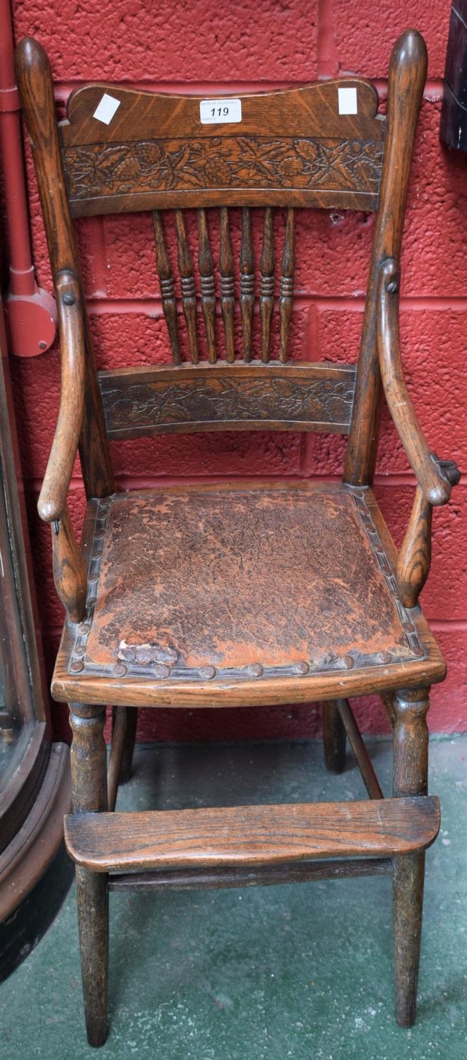 A 19th century oak child's high chair, shaped cresting rail carved with a fruiting branch, above an arrangement of seven turned spindles, bentwood arms, stuffed over seat, turned tapered forelegs, cylindrical stretchers, 98cm high