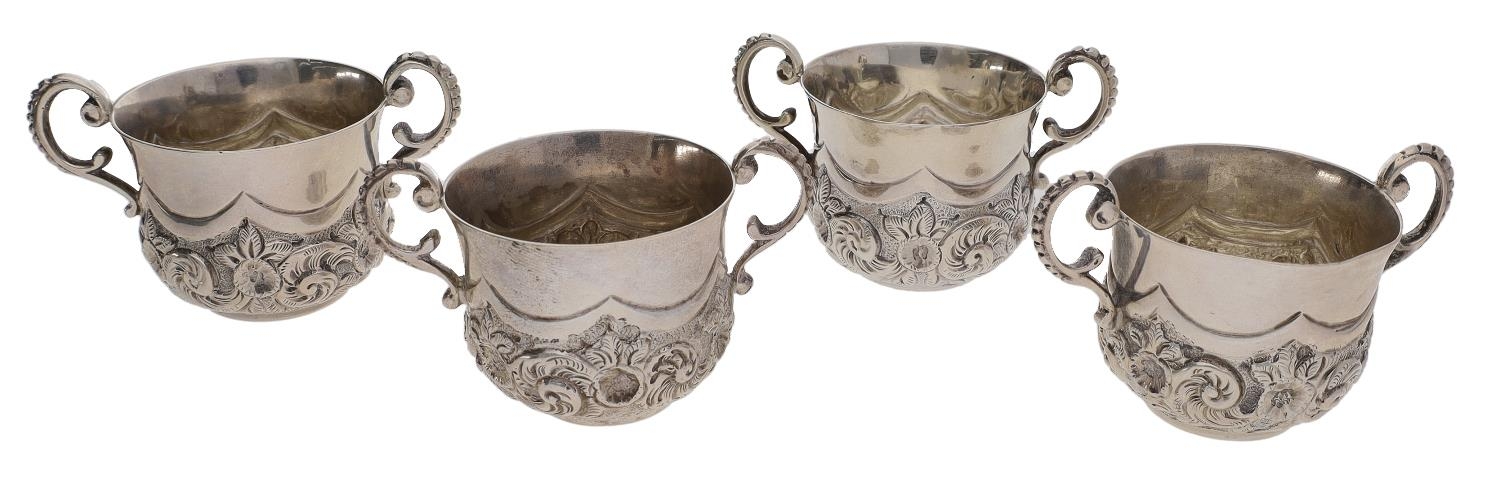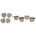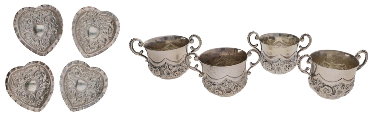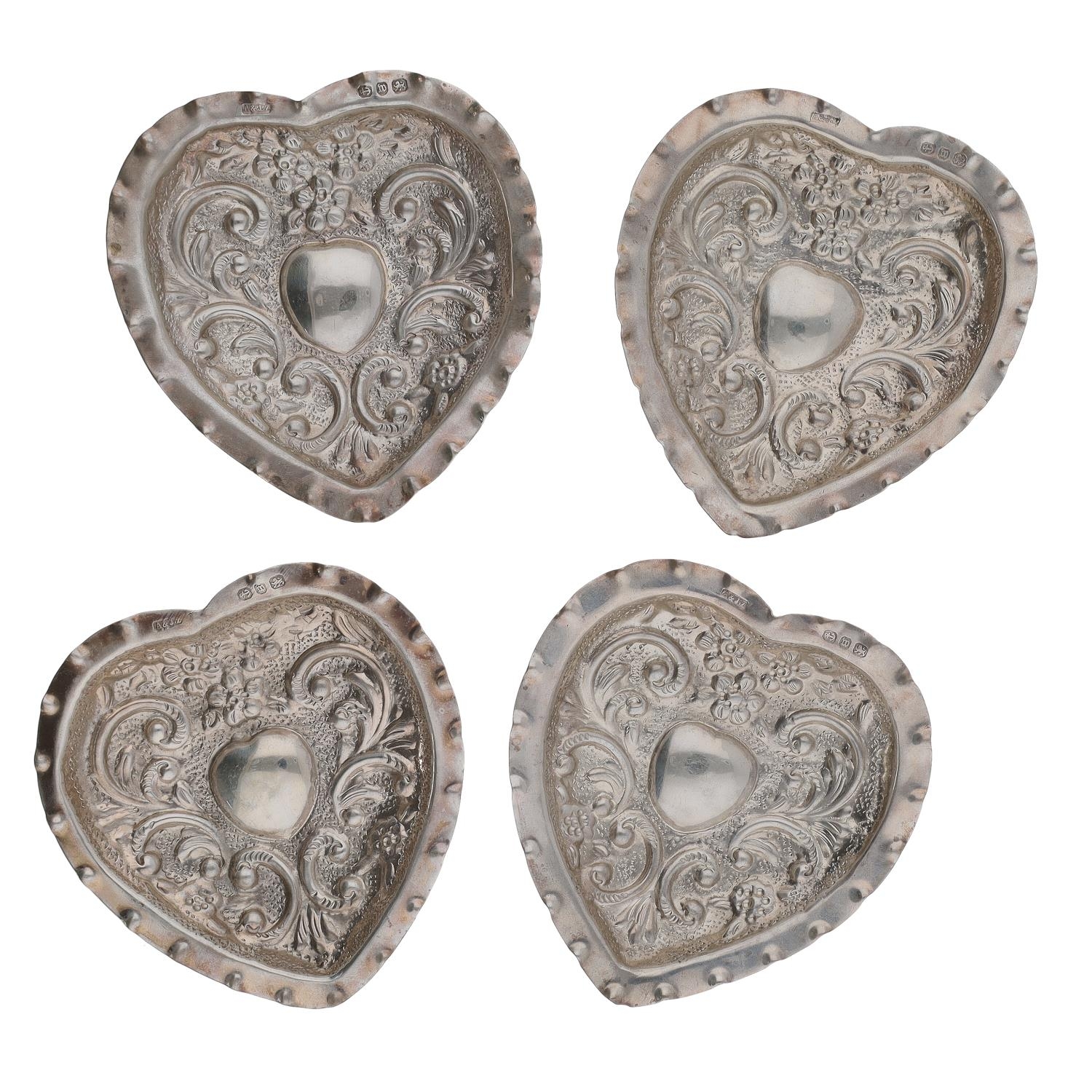 Group of four late Victorian heart shaped small silver dishes, with ornate decoration, Birmingham 1896; together with a set of four miniature porringers, 175gm total (8)
