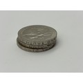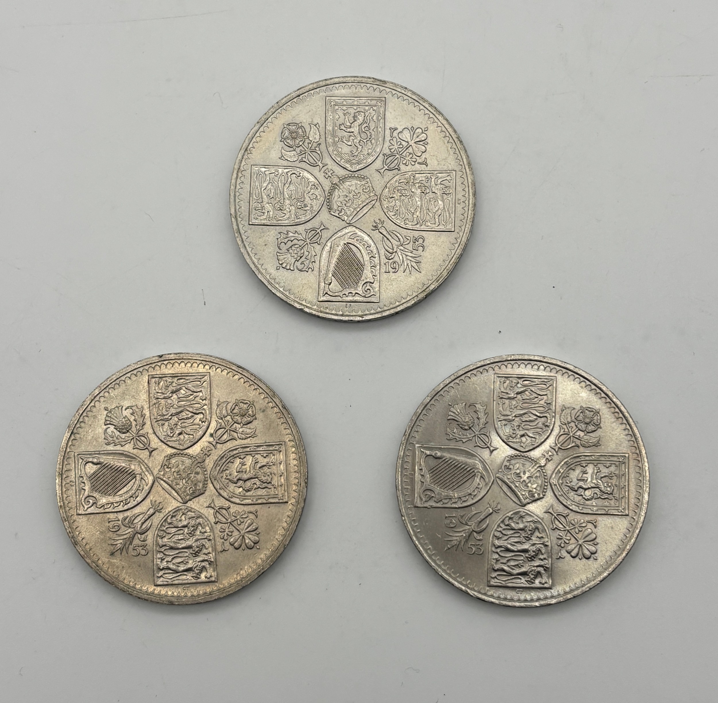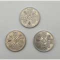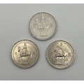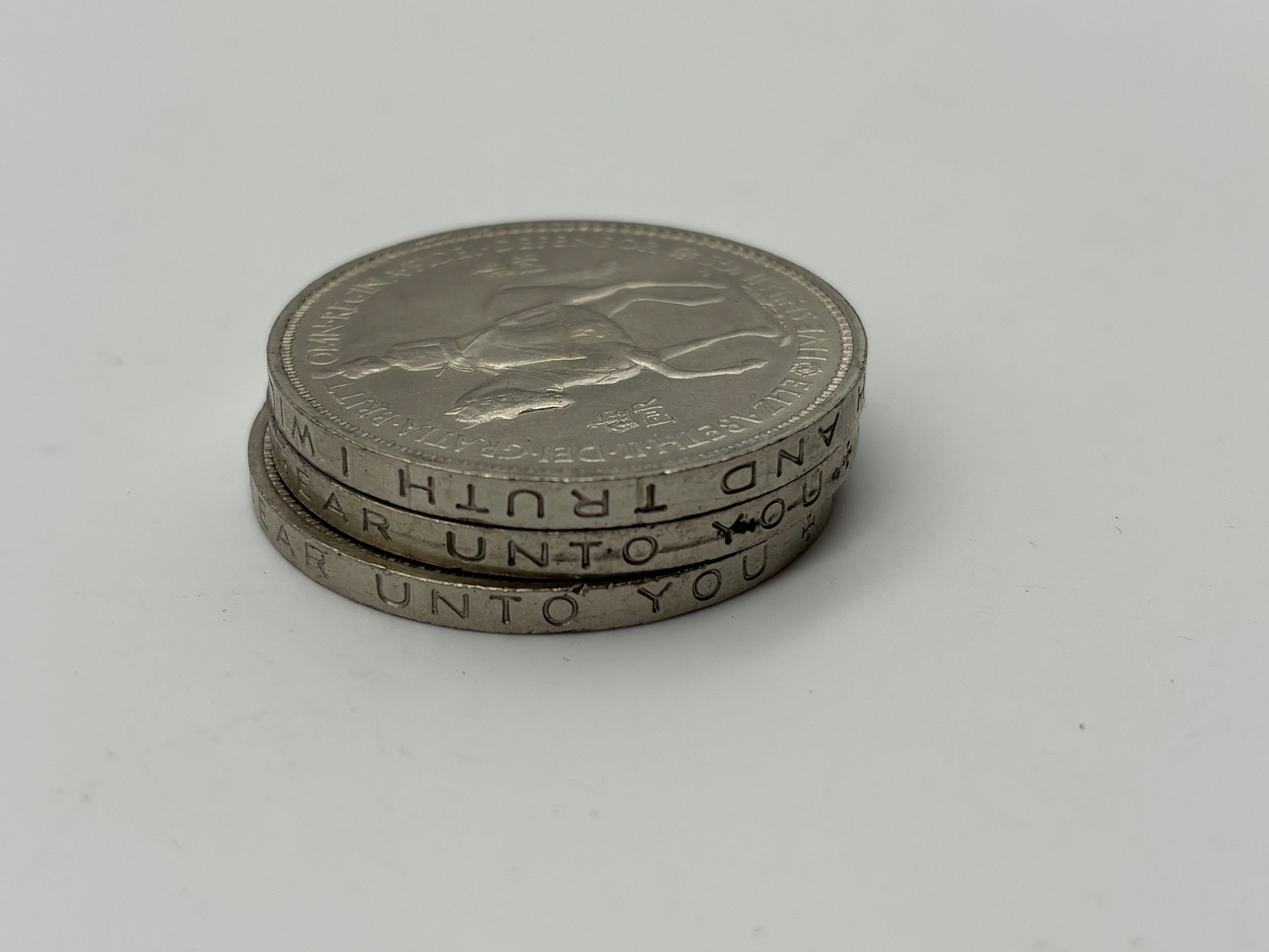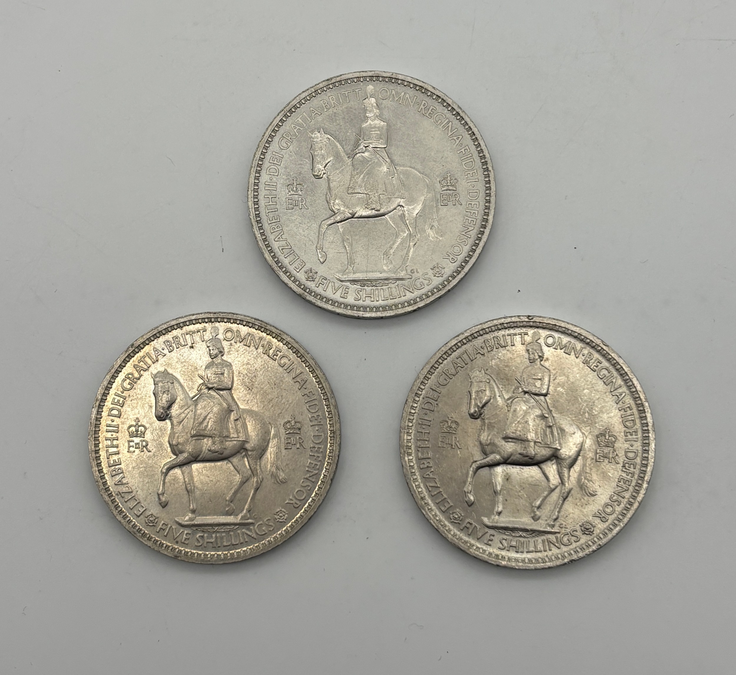 THREE QUEEN ELIZABETH II FIVE SHILLING COINS (ONE WITH SCRIPT AROUND THE RIM ERROR)