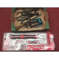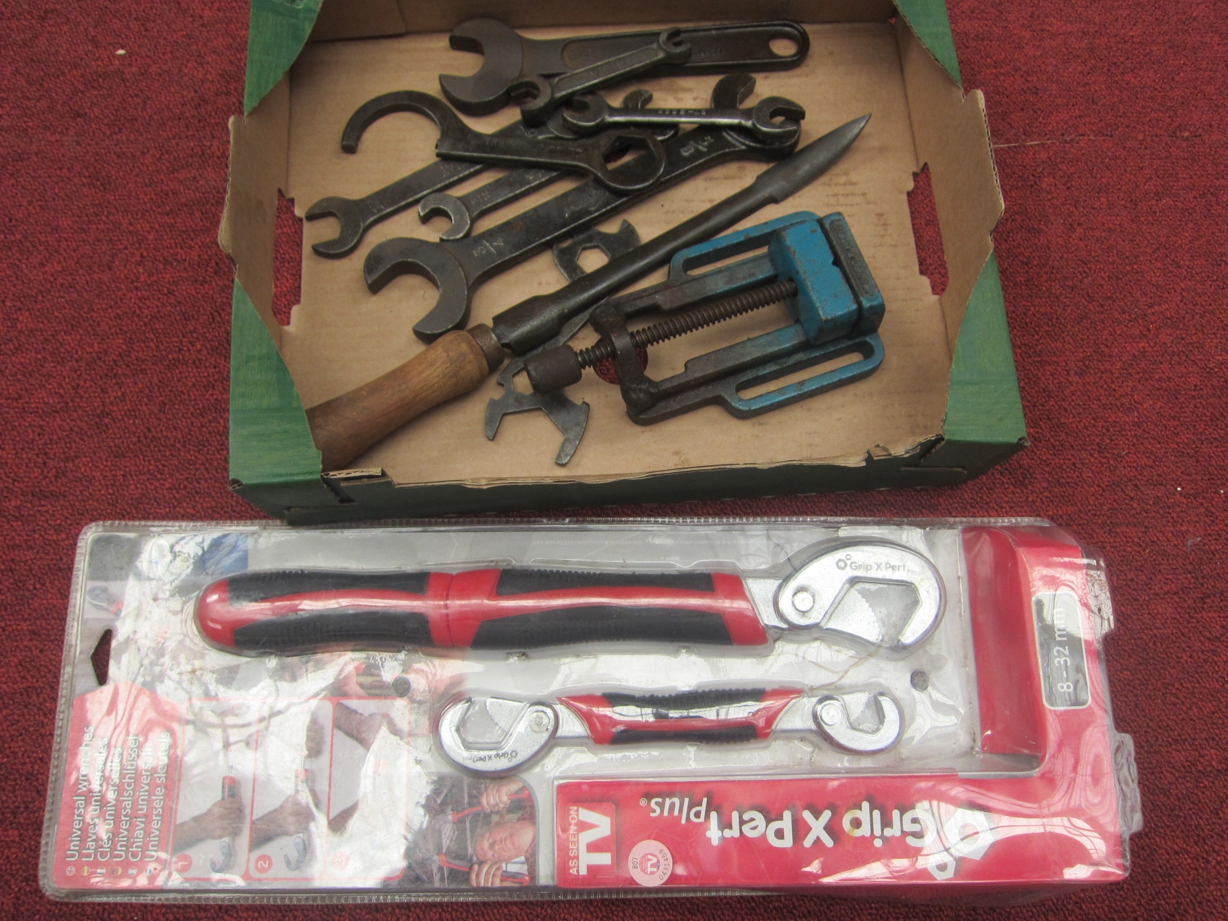 A box of tools including various spanners such as Austin, Triumph and B.S.A, a bearing scraper and a mini vice etc