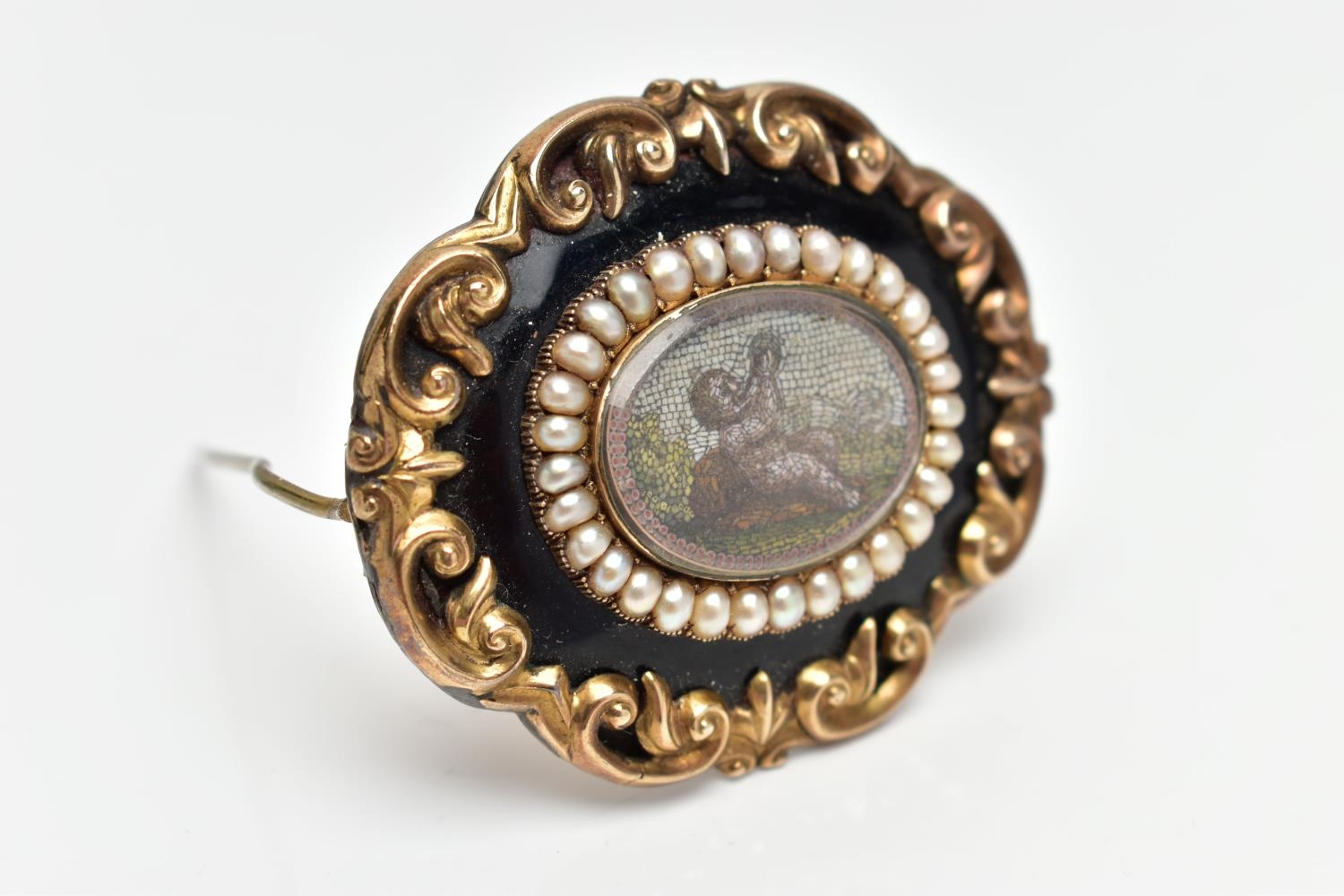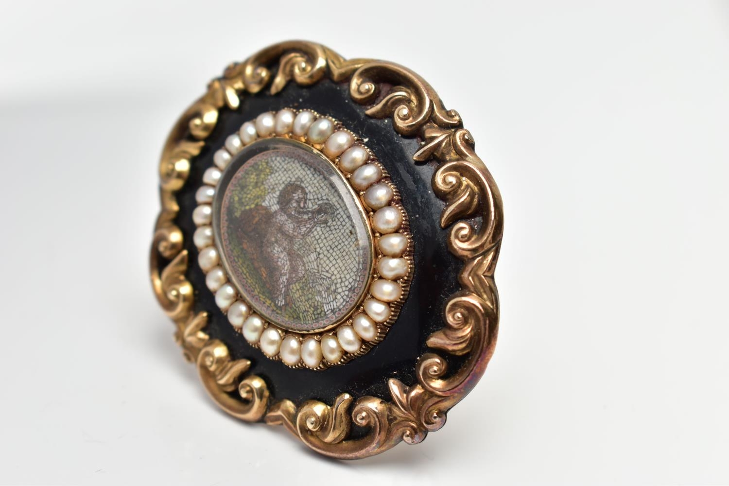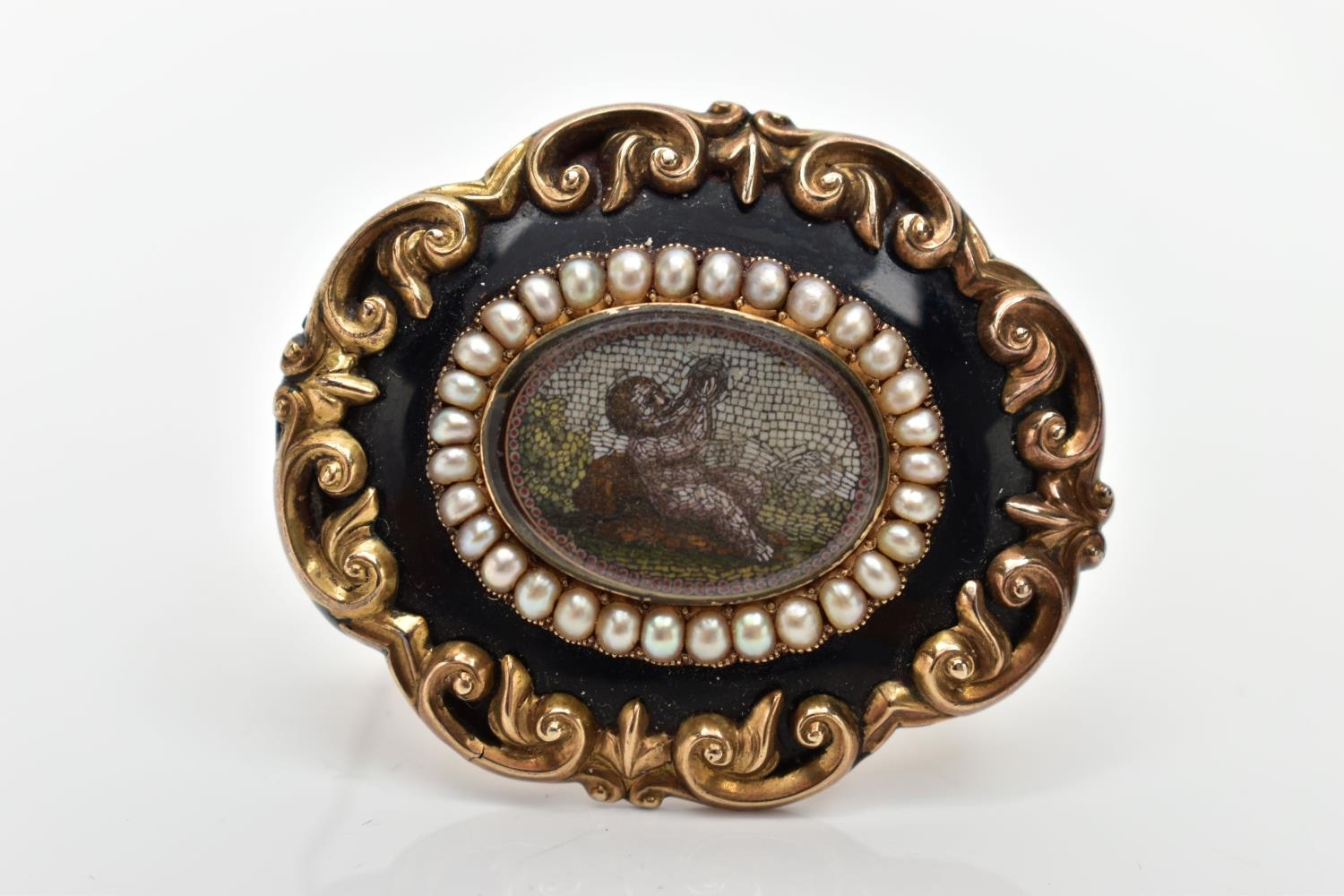 A VICTORIAN YELLOW METAL MICRO MOSAIC MOURNING BROOCH, the central micro mosaic panel depicting a cherub, with a split pearl border, black enamel and scrolling surround, personal engraving to reverse reading 'Elizabeth Boosey Ob 2nd May 1860 Aged 64', approximate length 47mms, approximate gross weight 24.57 grams (condition report: overall condition good, light scratches and nicks to glass panel of micro mosaic, a minor light dent to reverse of brooch, some surface wear visible to the side of the brooch)