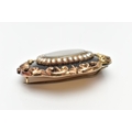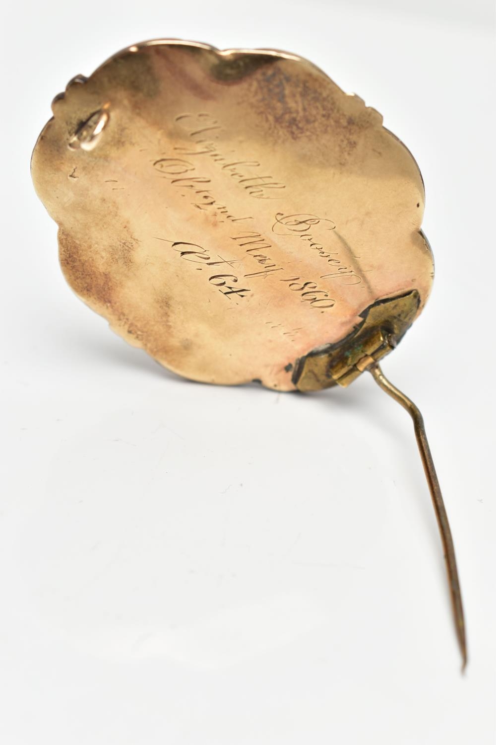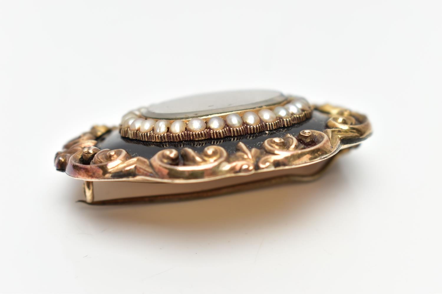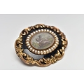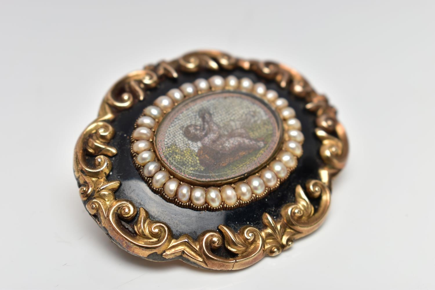 A VICTORIAN YELLOW METAL MICRO MOSAIC MOURNING BROOCH, the central micro mosaic panel depicting a cherub, with a split pearl border, black enamel and scrolling surround, personal engraving to reverse reading 'Elizabeth Boosey Ob 2nd May 1860 Aged 64', approximate length 47mms, approximate gross weight 24.57 grams (condition report: overall condition good, light scratches and nicks to glass panel of micro mosaic, a minor light dent to reverse of brooch, some surface wear visible to the side of the brooch)