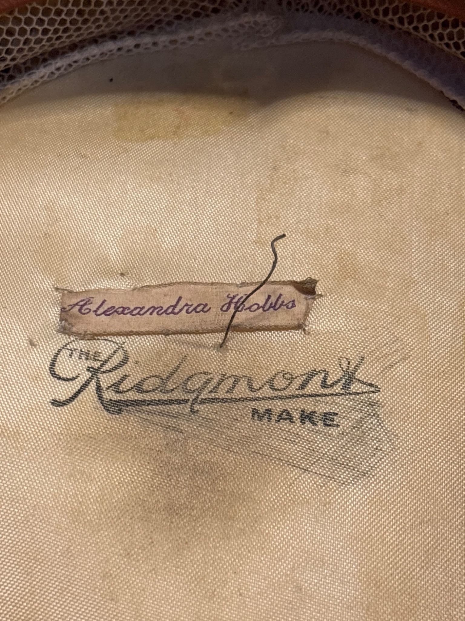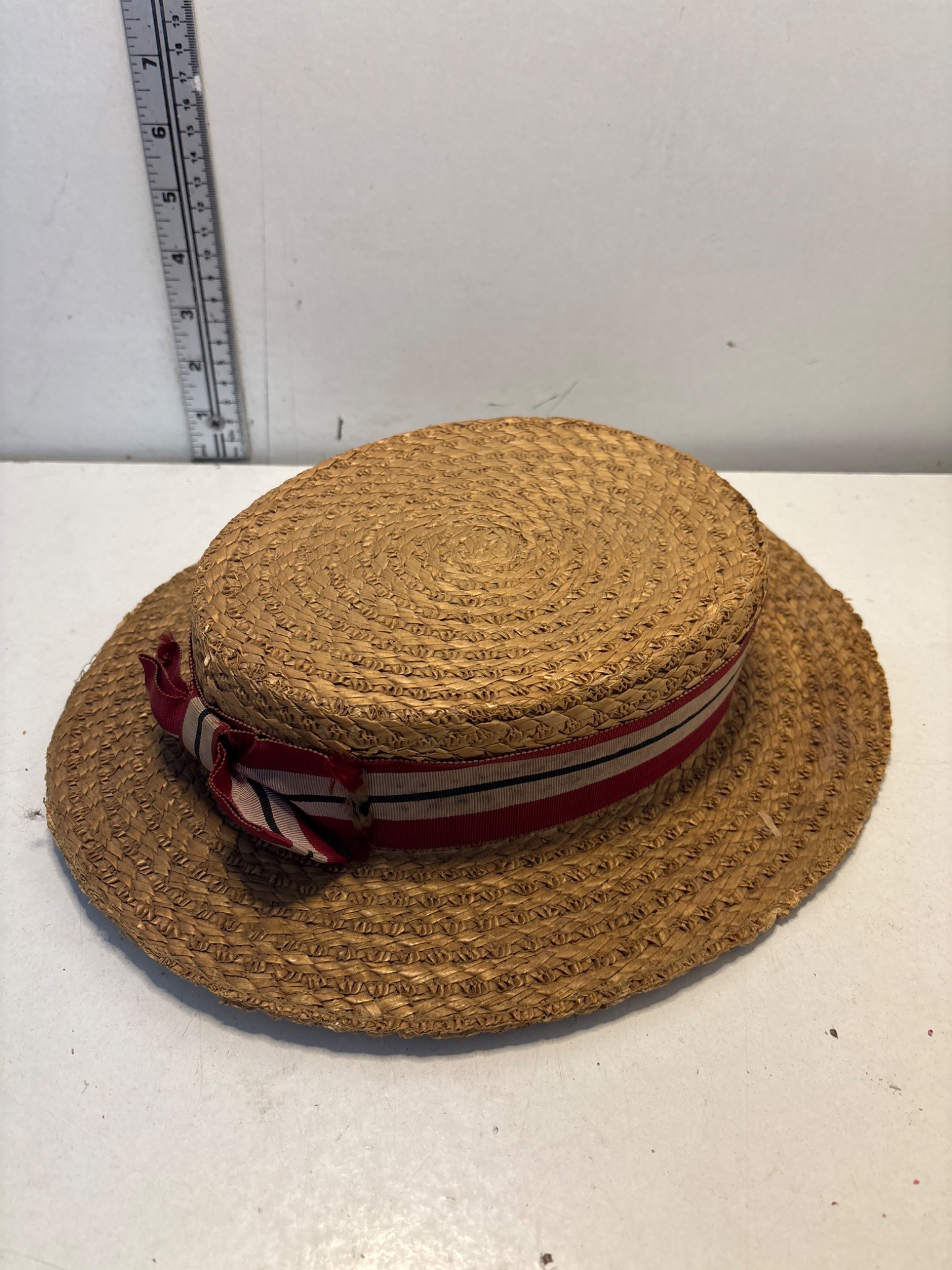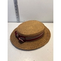 Ridgmont straw boater hat with striped ribbon, labeled Alexandra Hobbs.