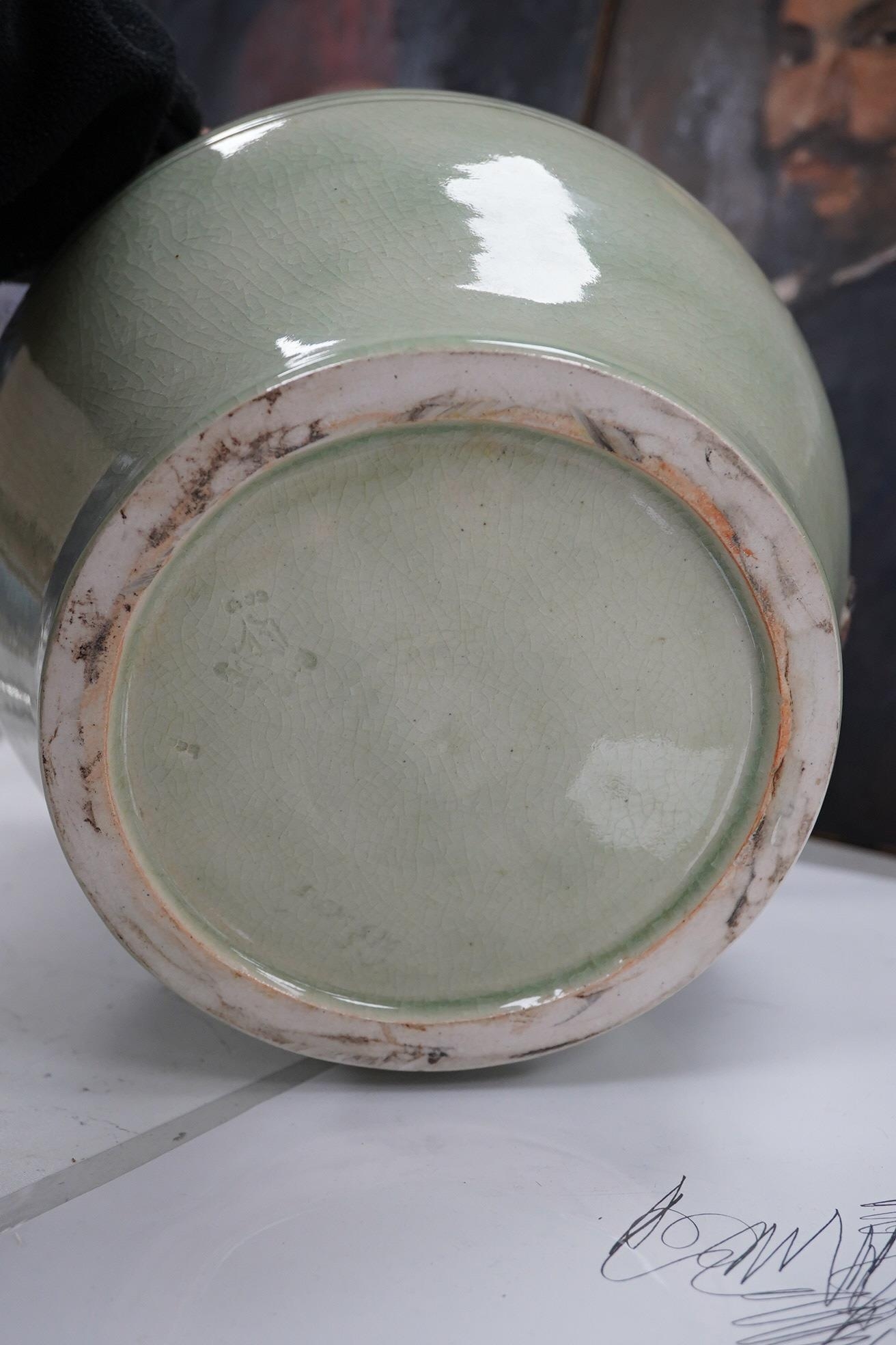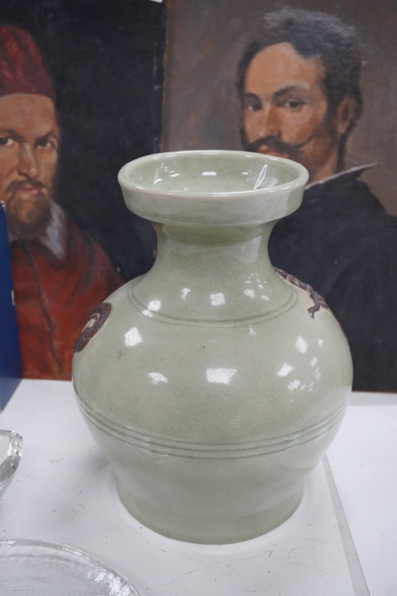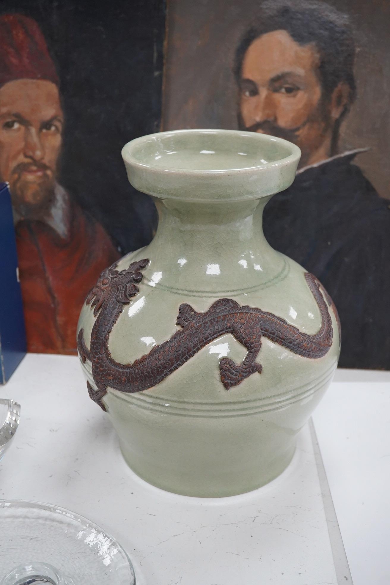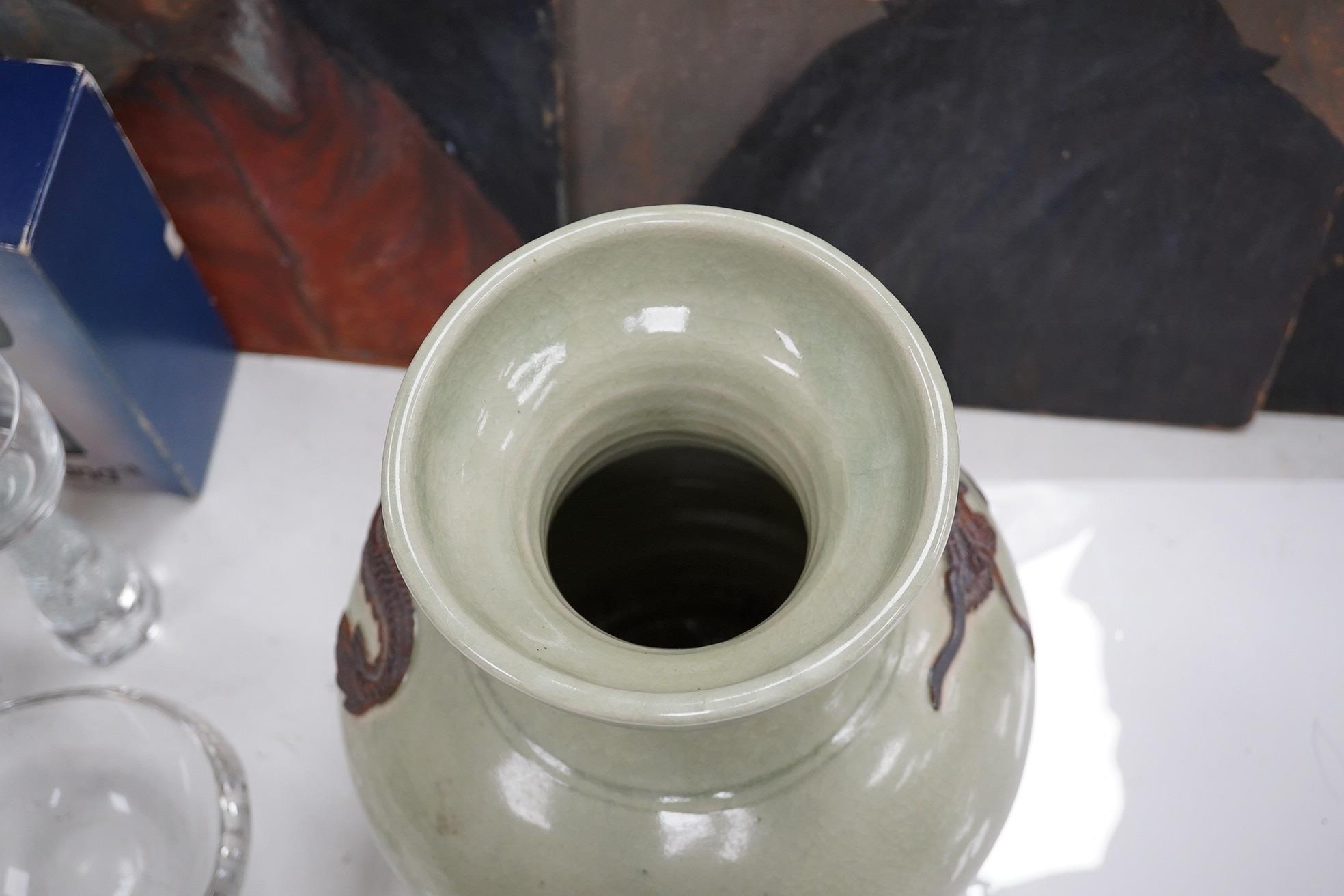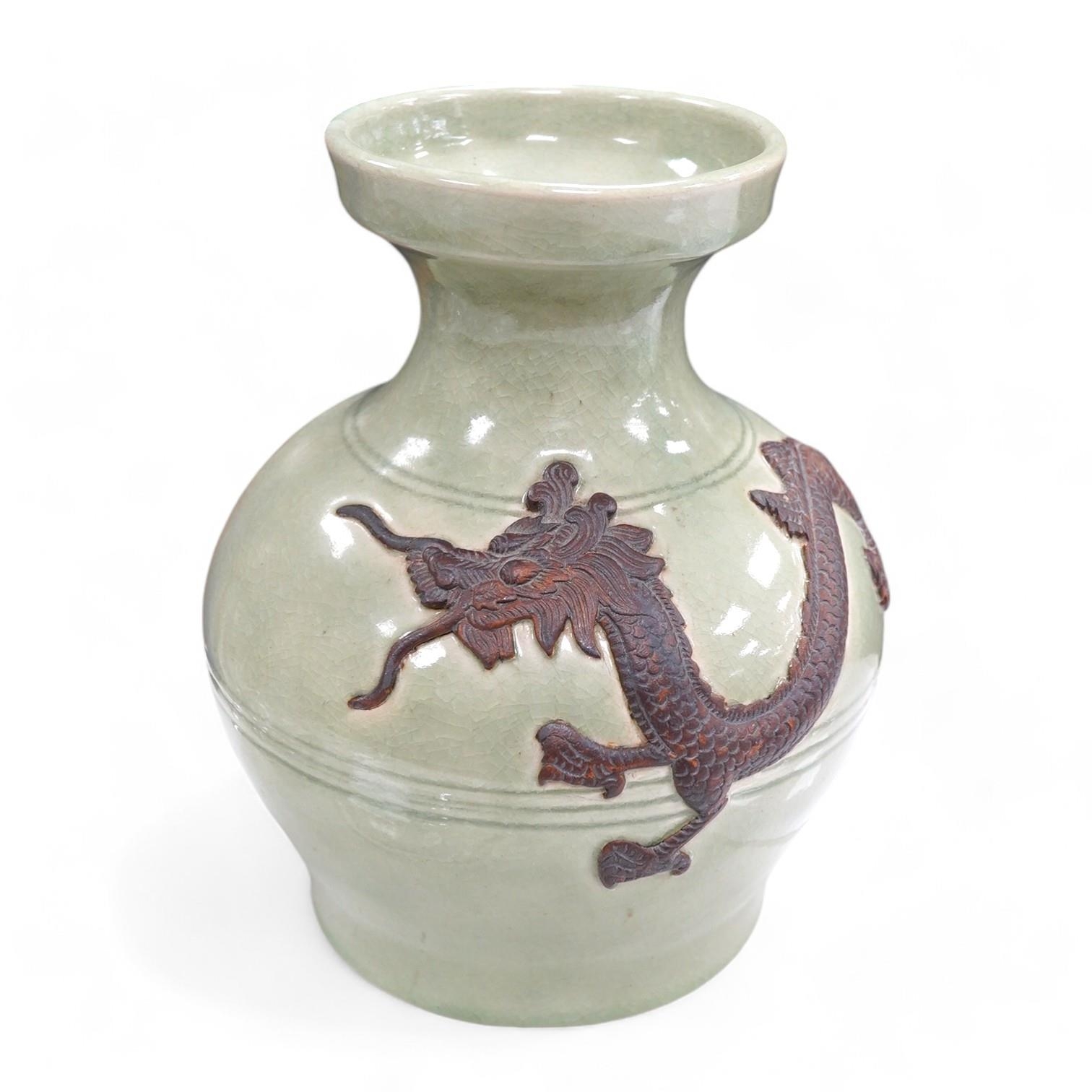 A Chinese celadon glazed dragon vase, 30.5cm high. Condition - good