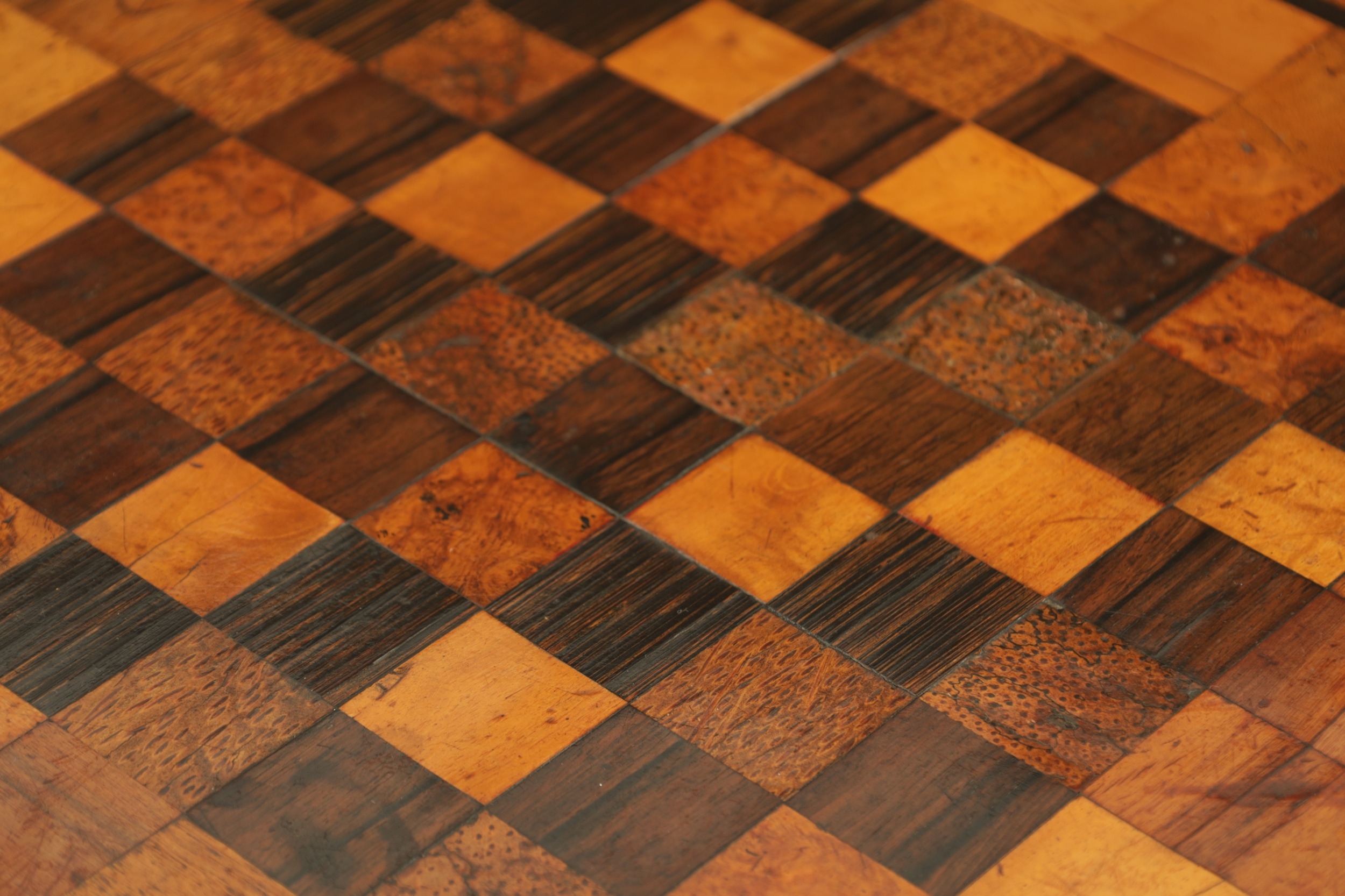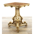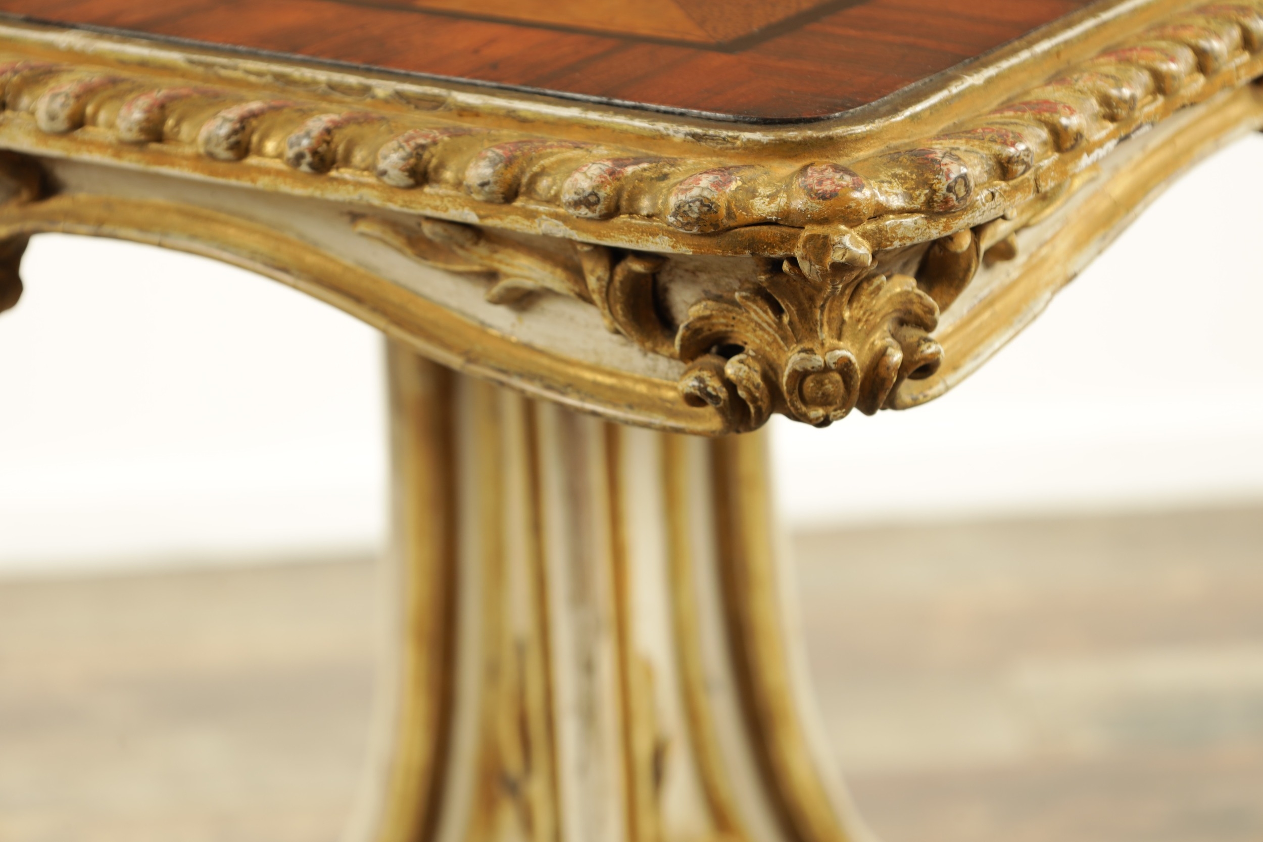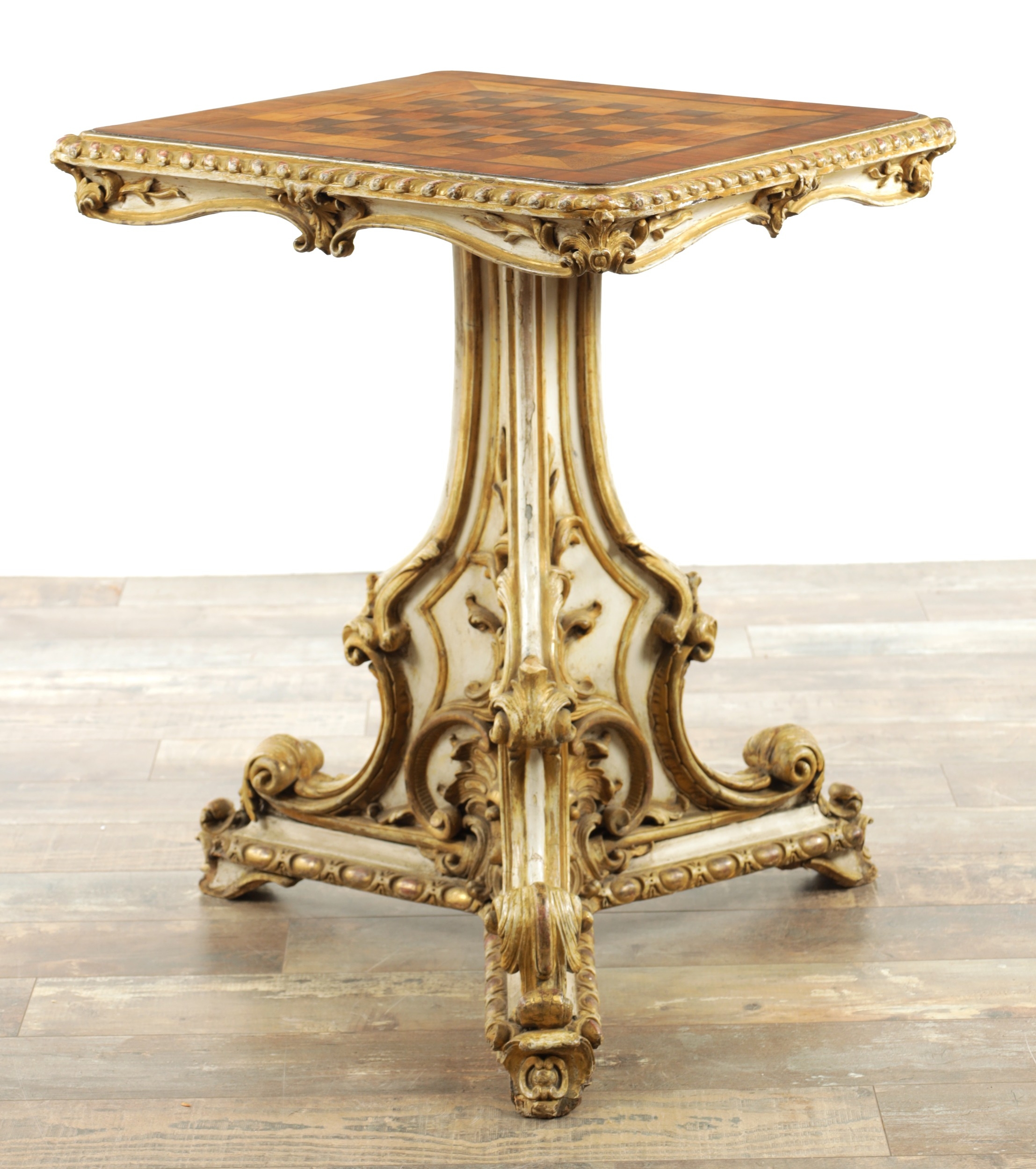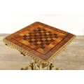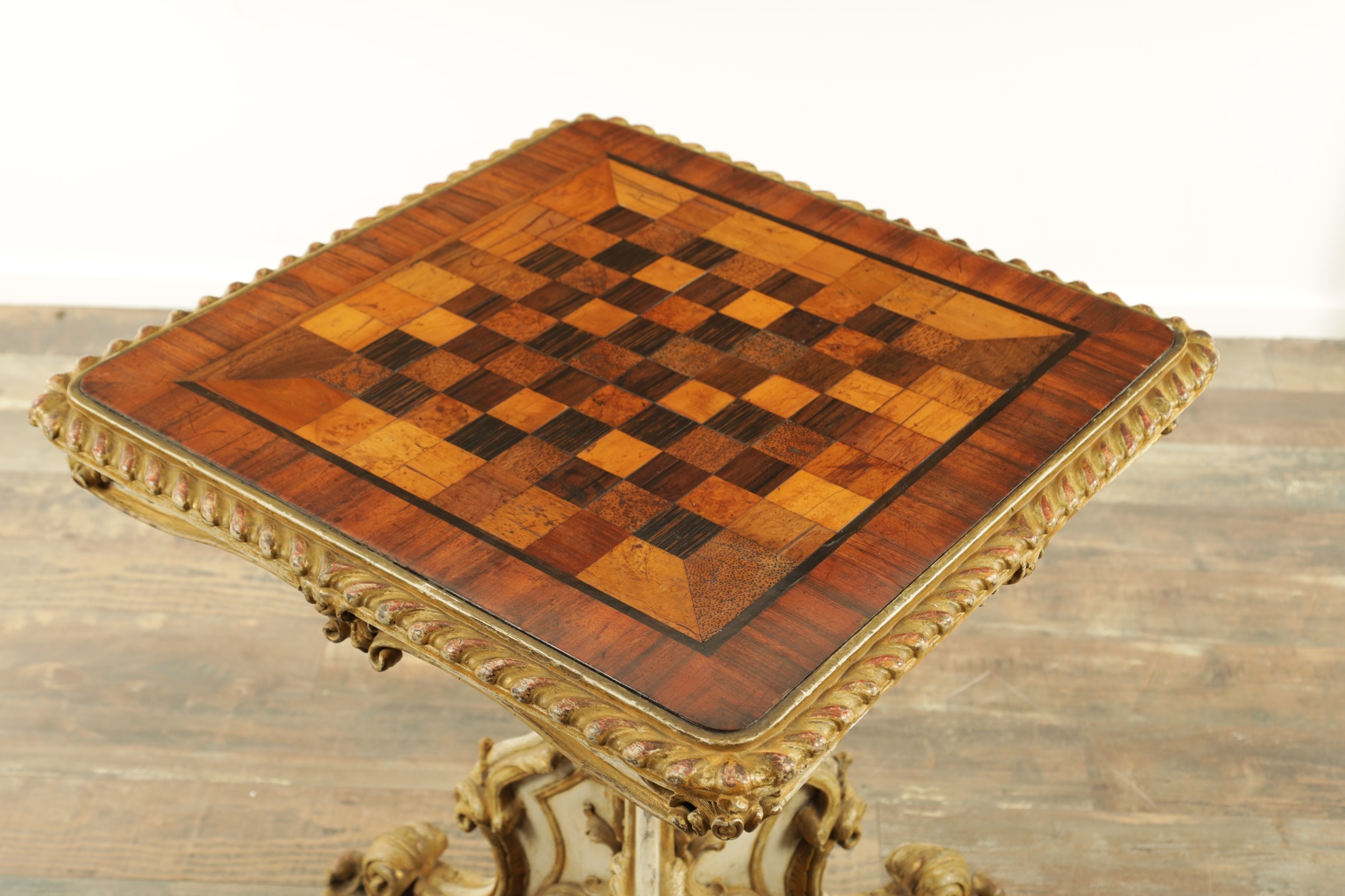 A GOOD REGENCY PAINTED, CARVED WOOD AND PARQUETRY INLAID GAMES TABLE IN THE MANNER OF HENRY HOLLAND with chessboard specimen wood top above an elaborate carved gilt highlighted base (60cm square 76cm high)