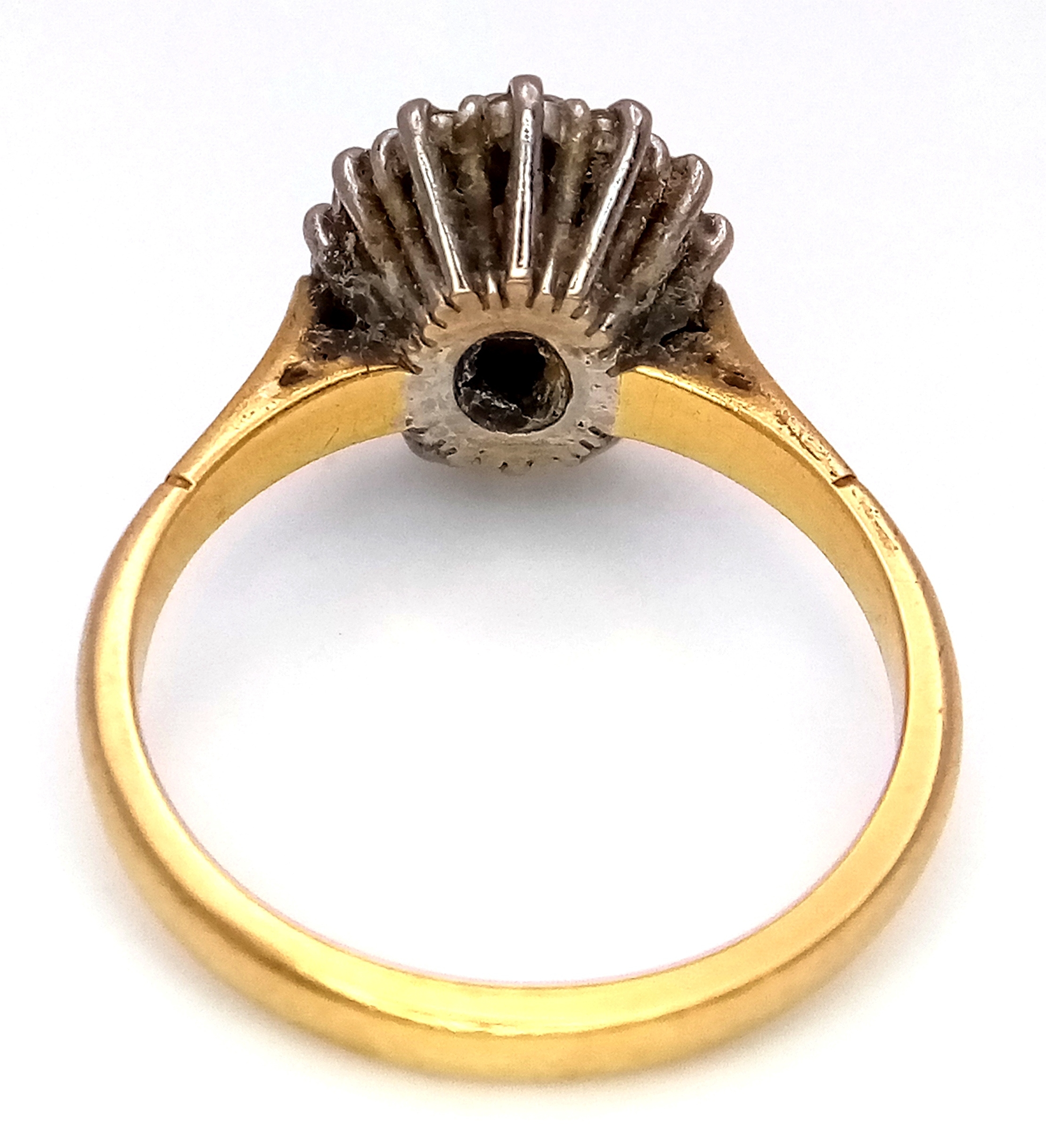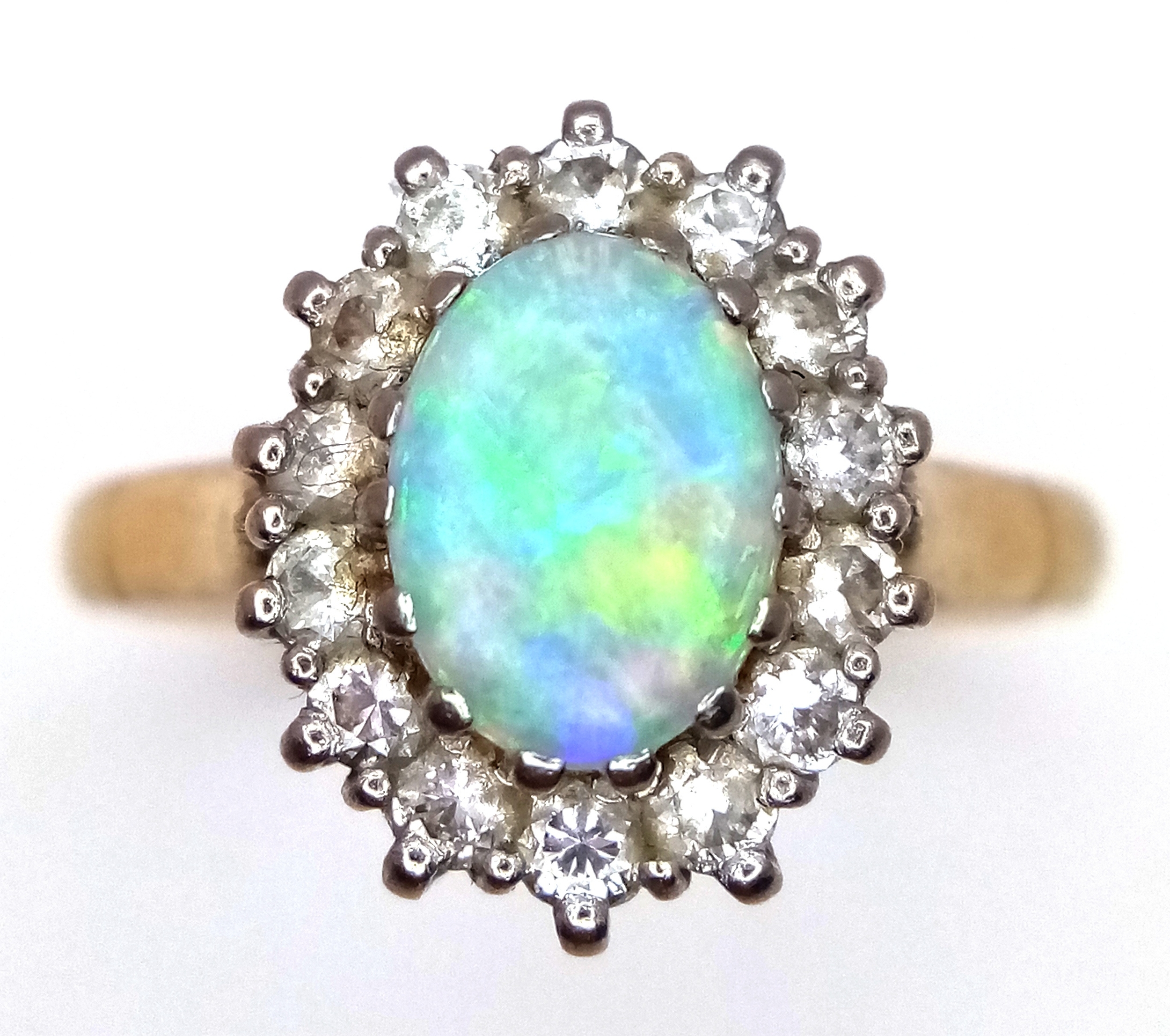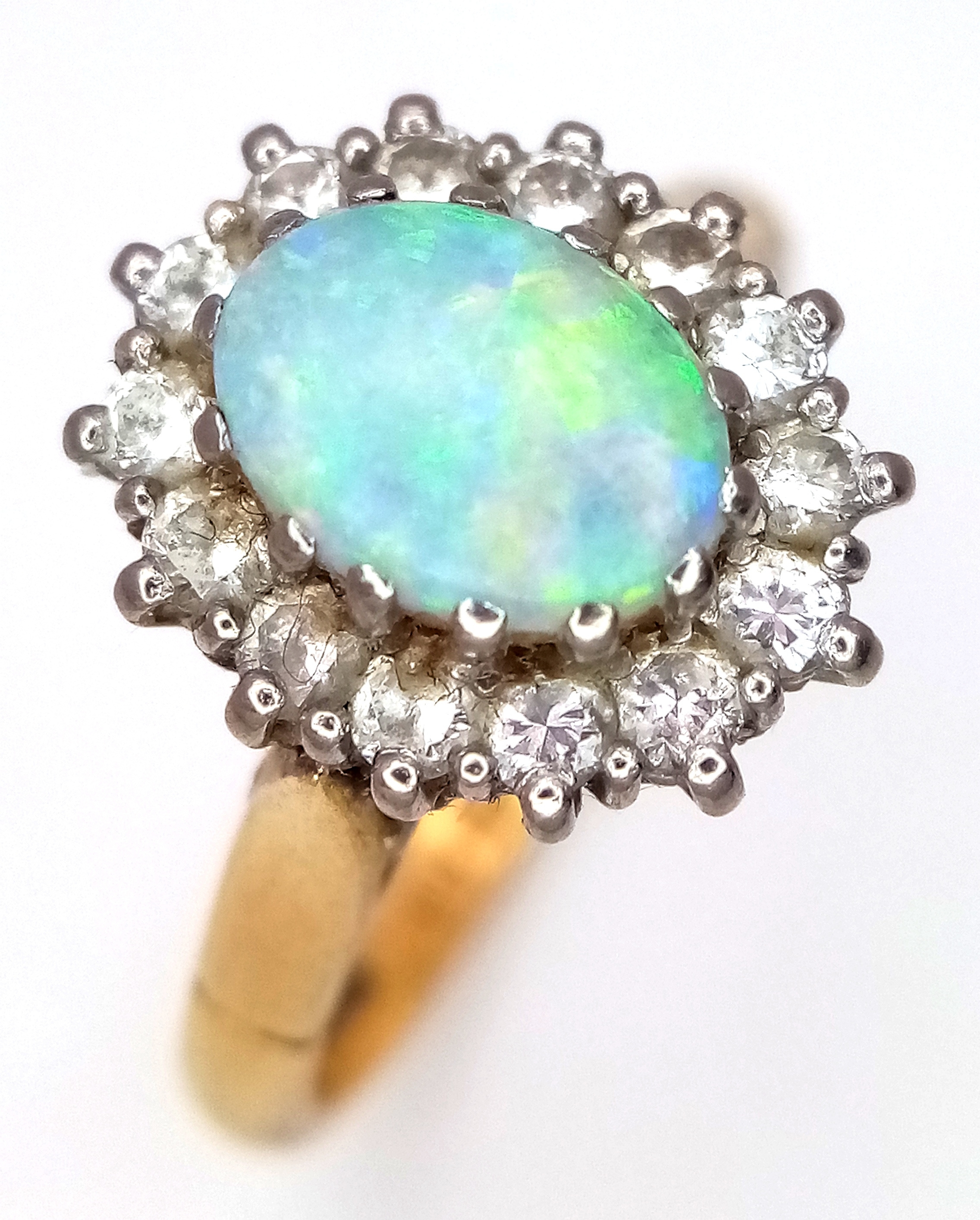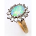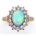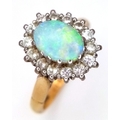 An 18K Yellow Gold Opal and Diamond Ring. A 1ct central opal with a 0.52ctw diamond surround. Size N 1/2. 4.6g.