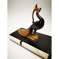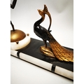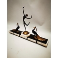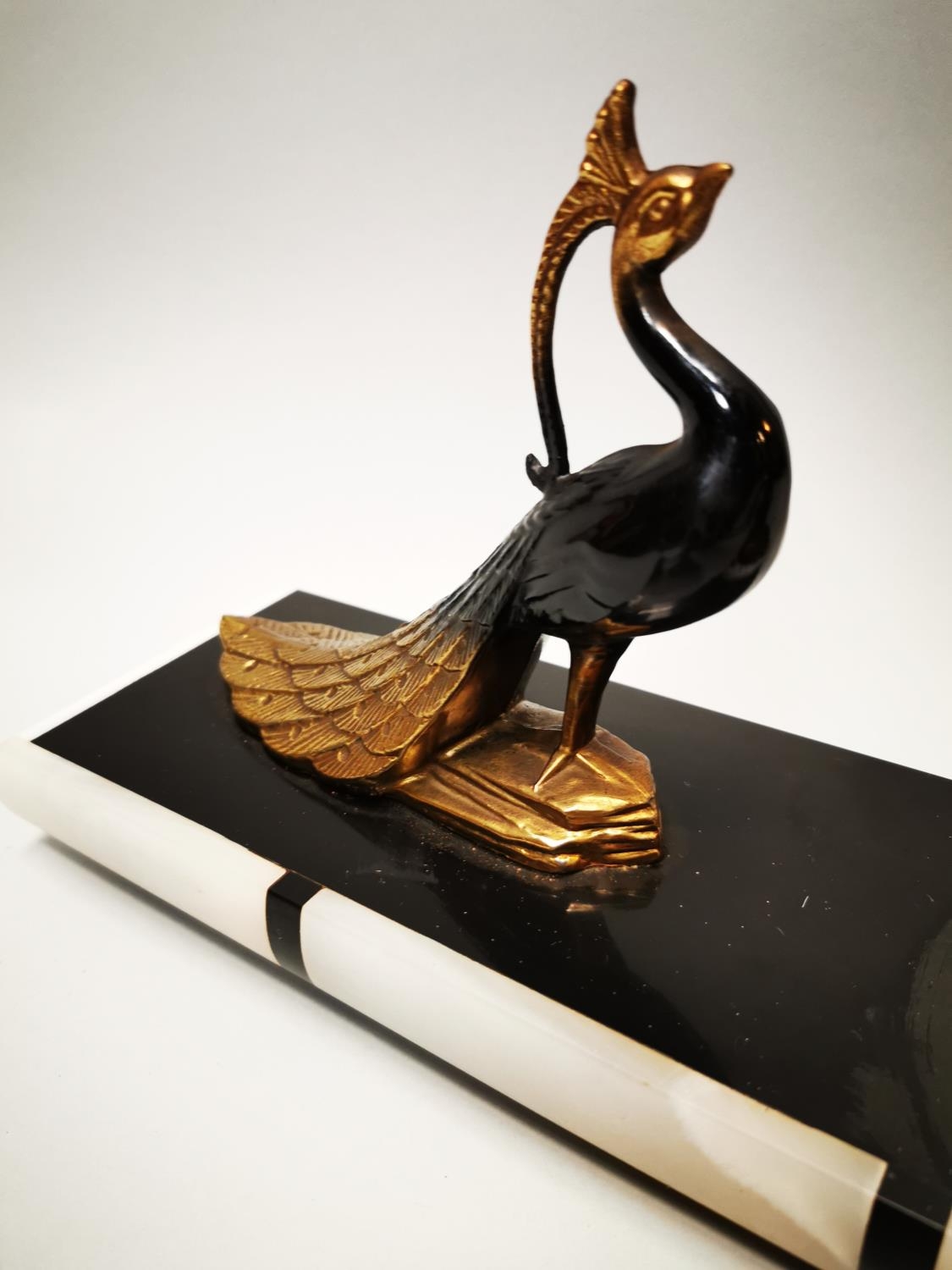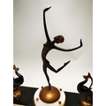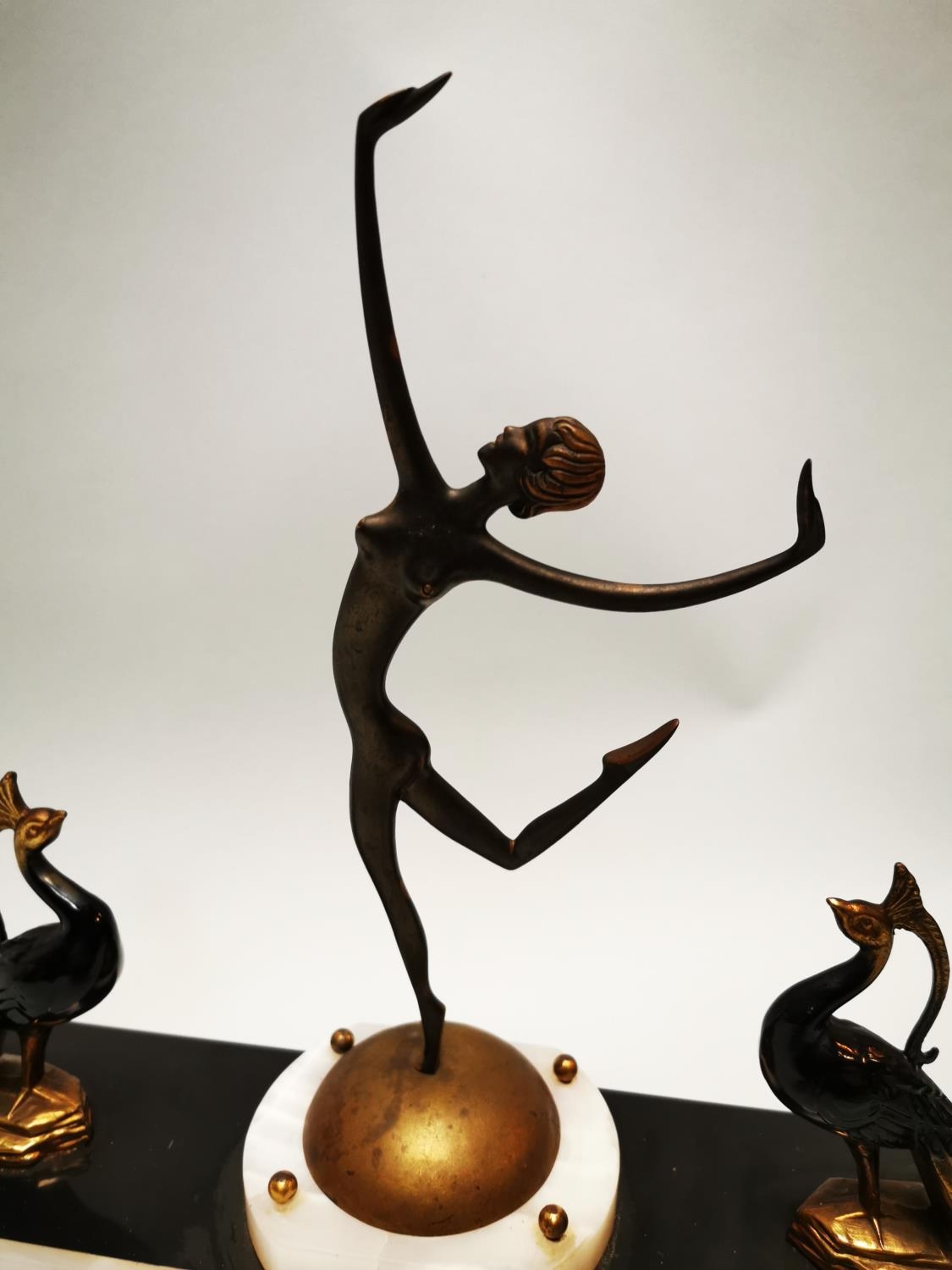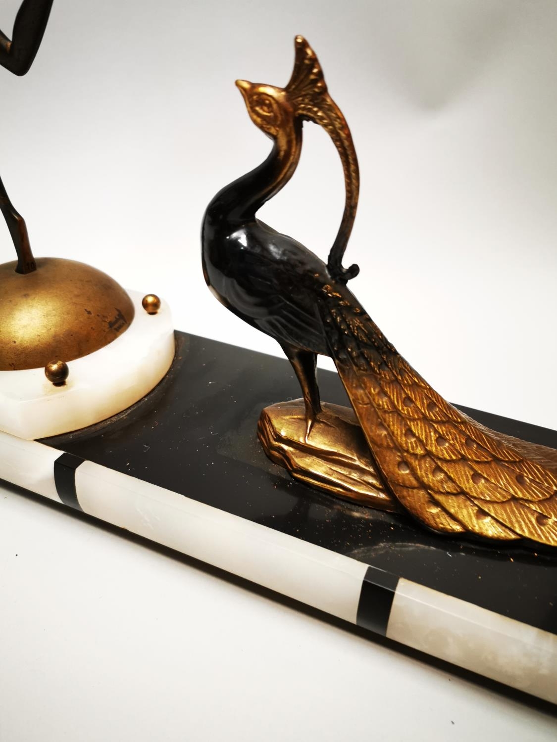 Gilded metal and bronze centre piece decorated with peacocks and dancing lady in the Art Deco style {39 cm H x 61 cm W x 12 cm D}.