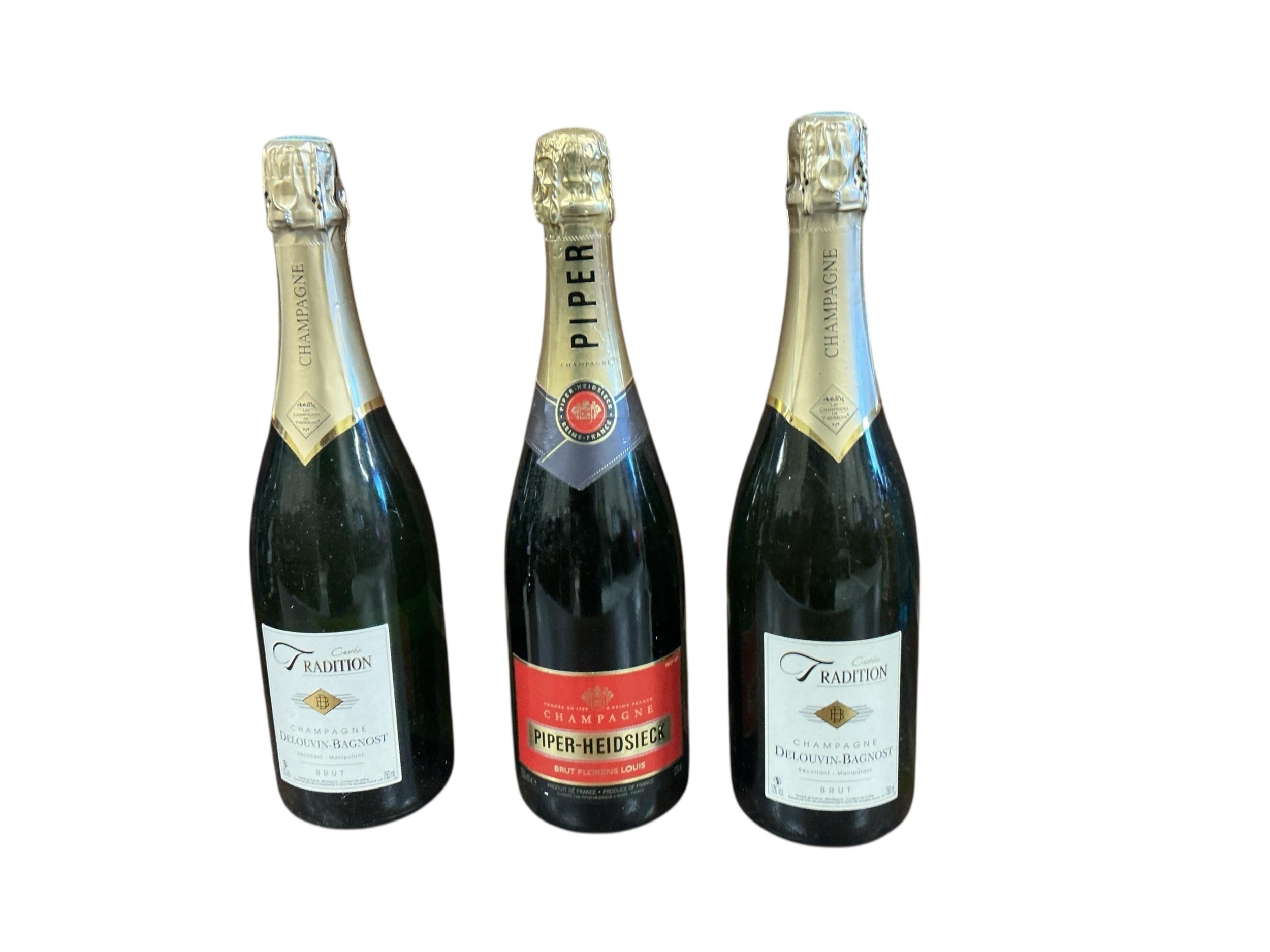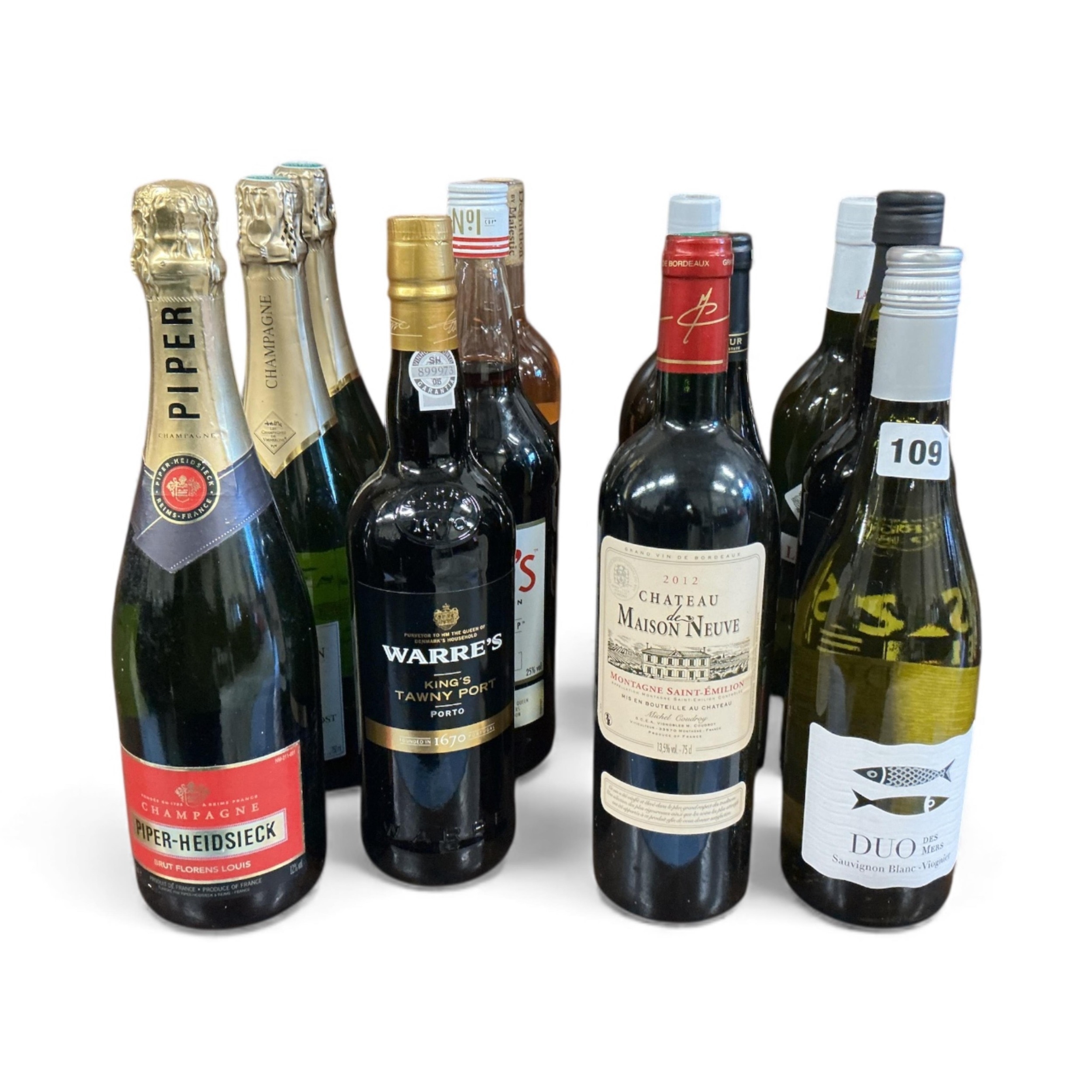 Twelve bottles of assorted champagne, port and wine, to include Piper Heidsieck, Warre's Kings Tawny Port, Chateau de Maison Neuve, St. Emilion 2012, Balfour Chardonnay etc.