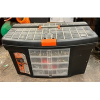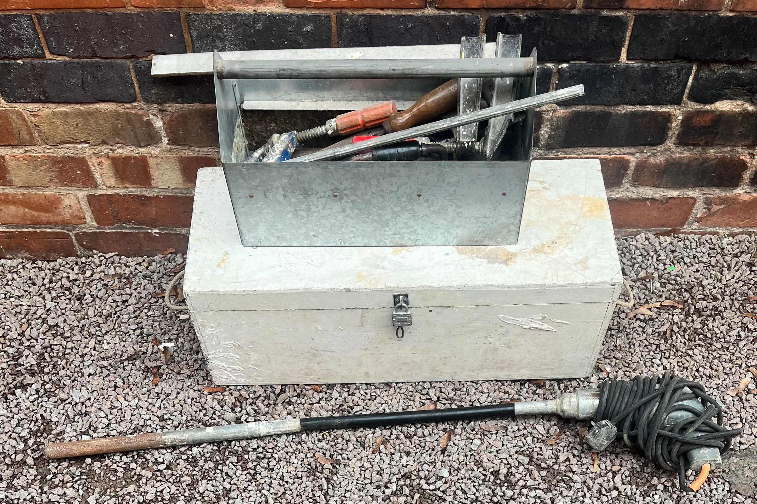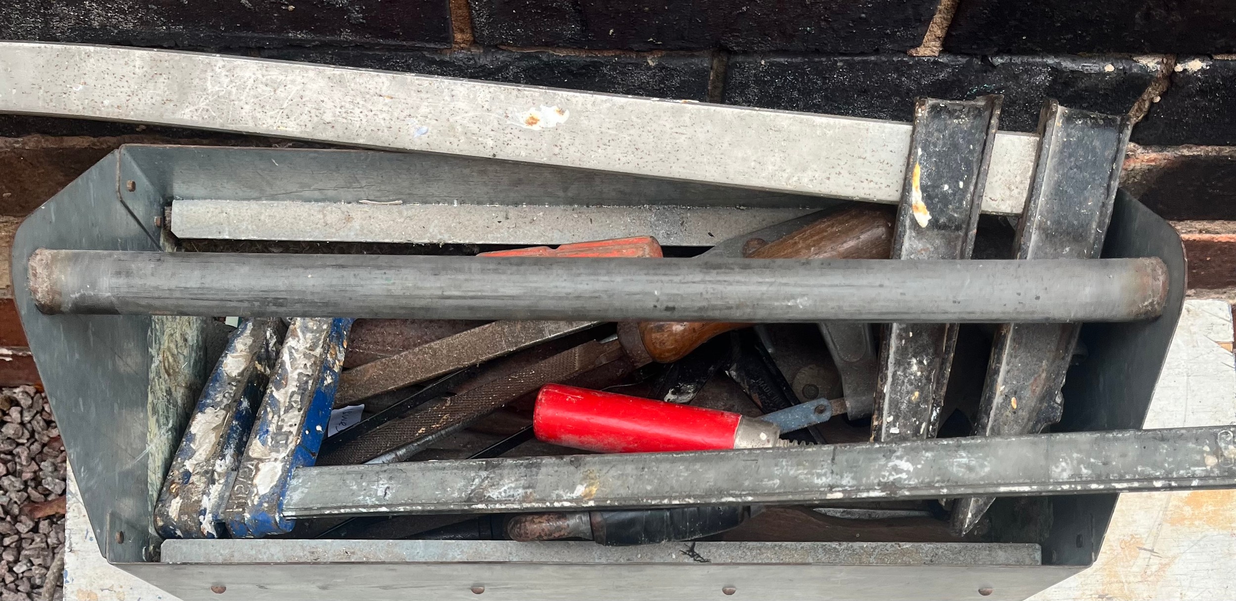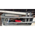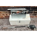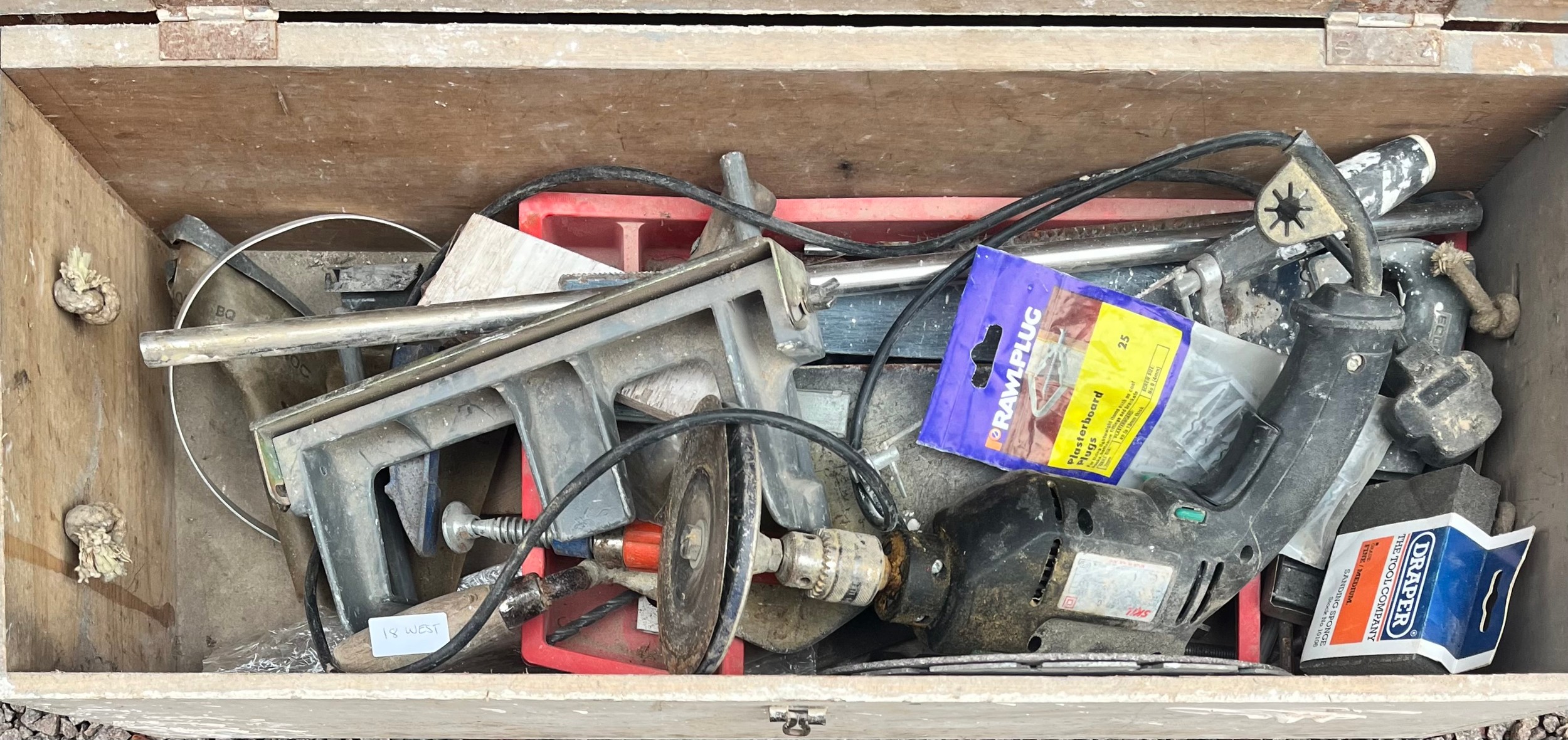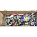 WOODEN BOX OF VARIOUS TOOLS, SAWS AND BLADES