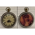 A brass cased top winding pocket watch with beaded detail to surround front and back. Reverse has printed design of a lady. Watch face approx. 4.5cm diameter.