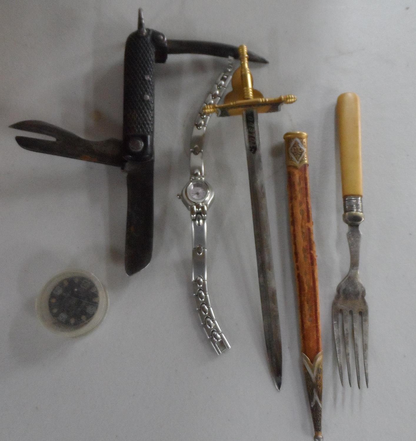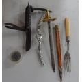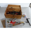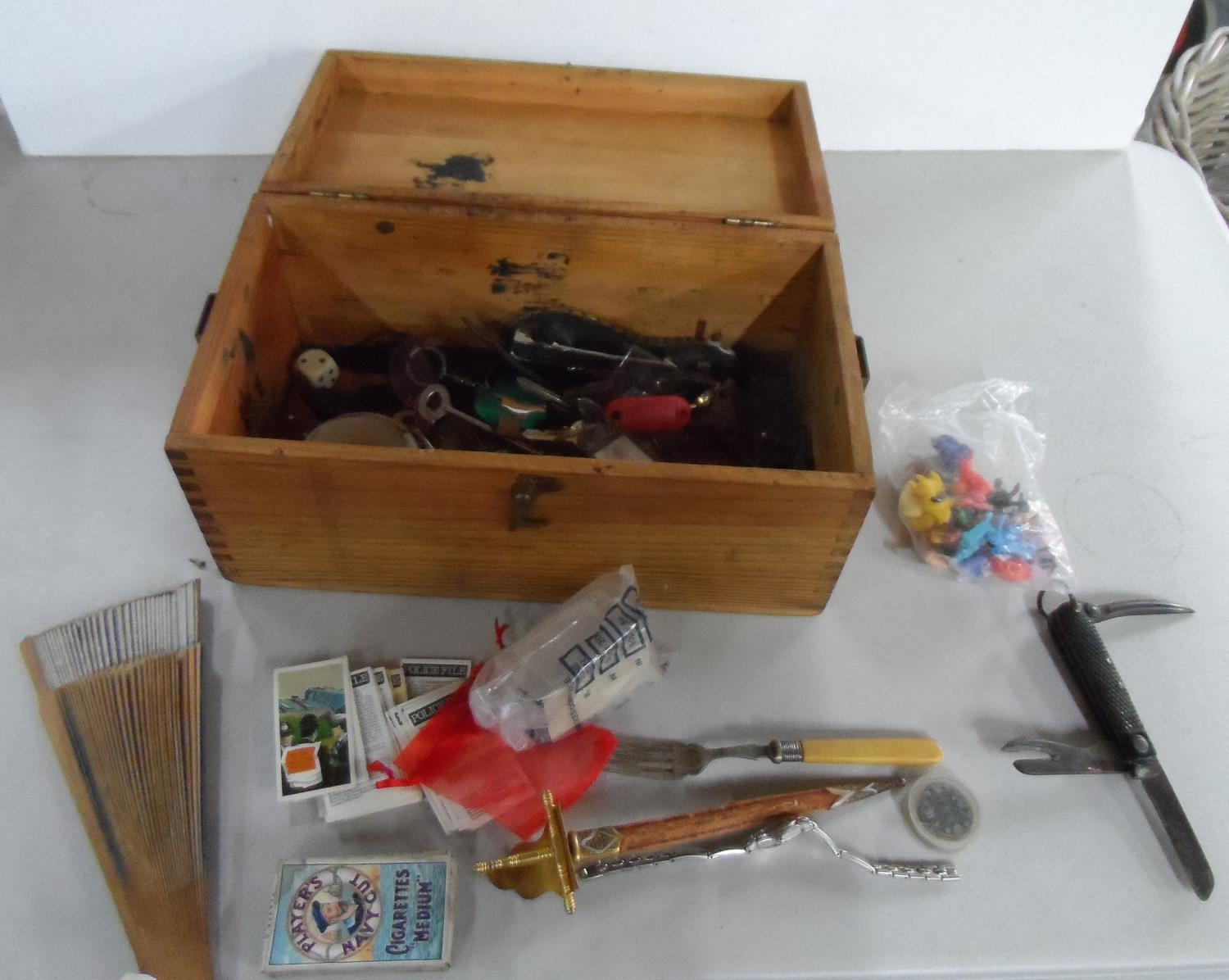 Quantity of small collectables including an old, multi-purpose pen knife with an old wood box