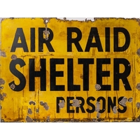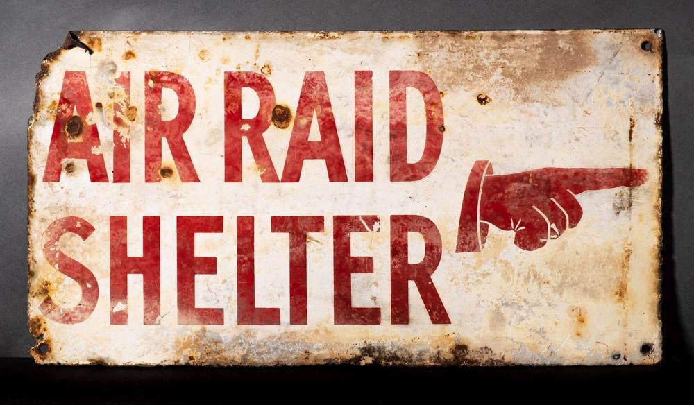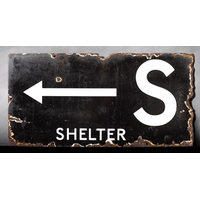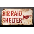 A WWII enamel 'Air Raid Shelter' sign: with pointing hand, red on white ground, 25.5 x 48cm