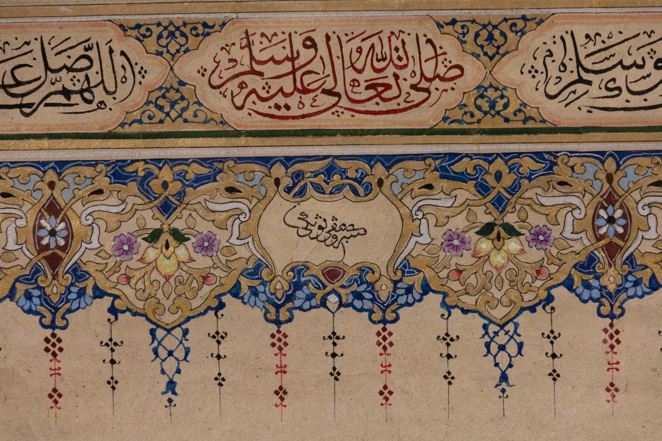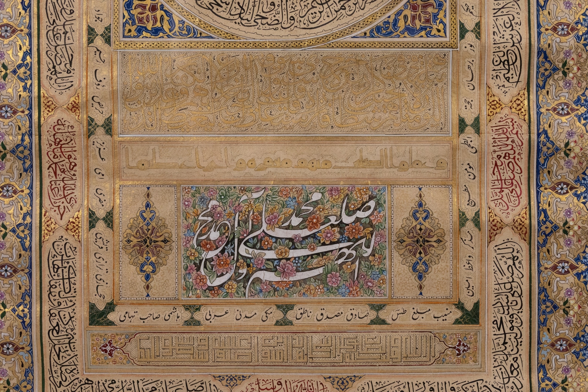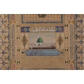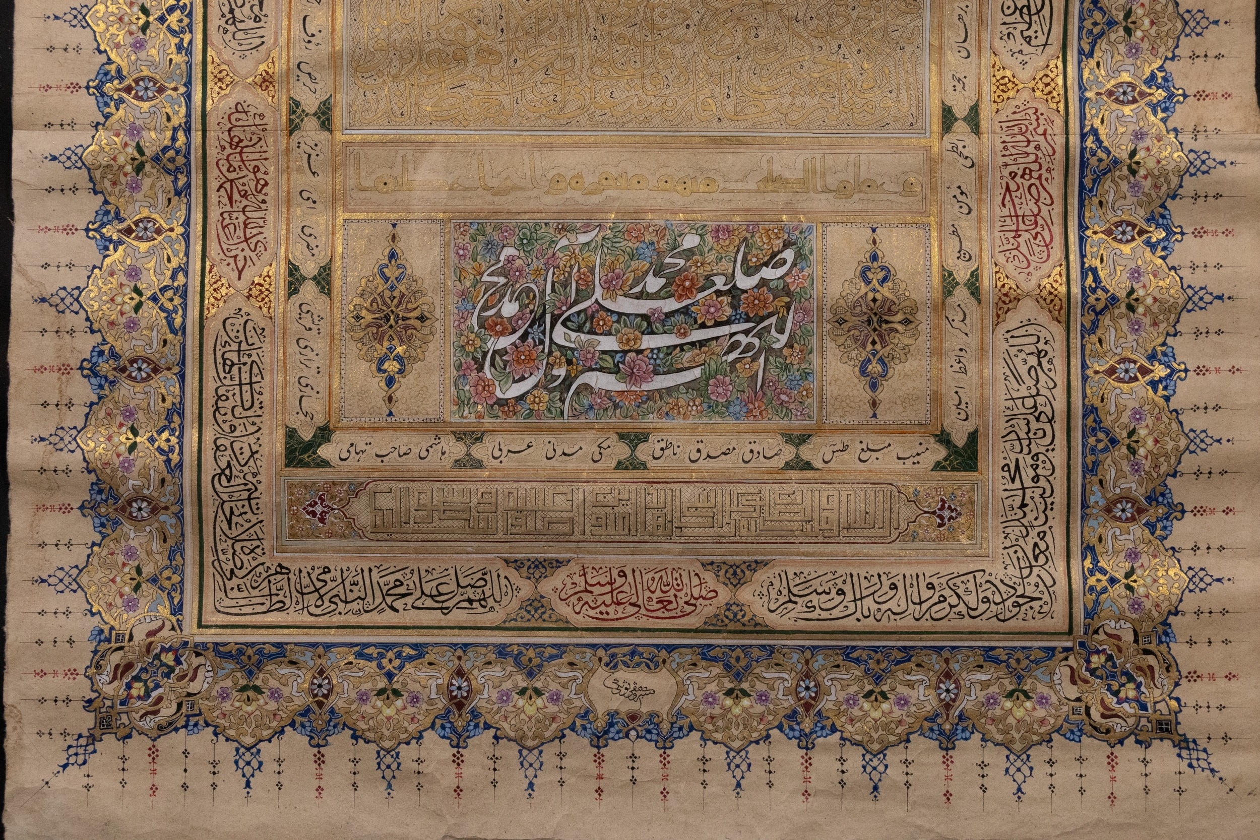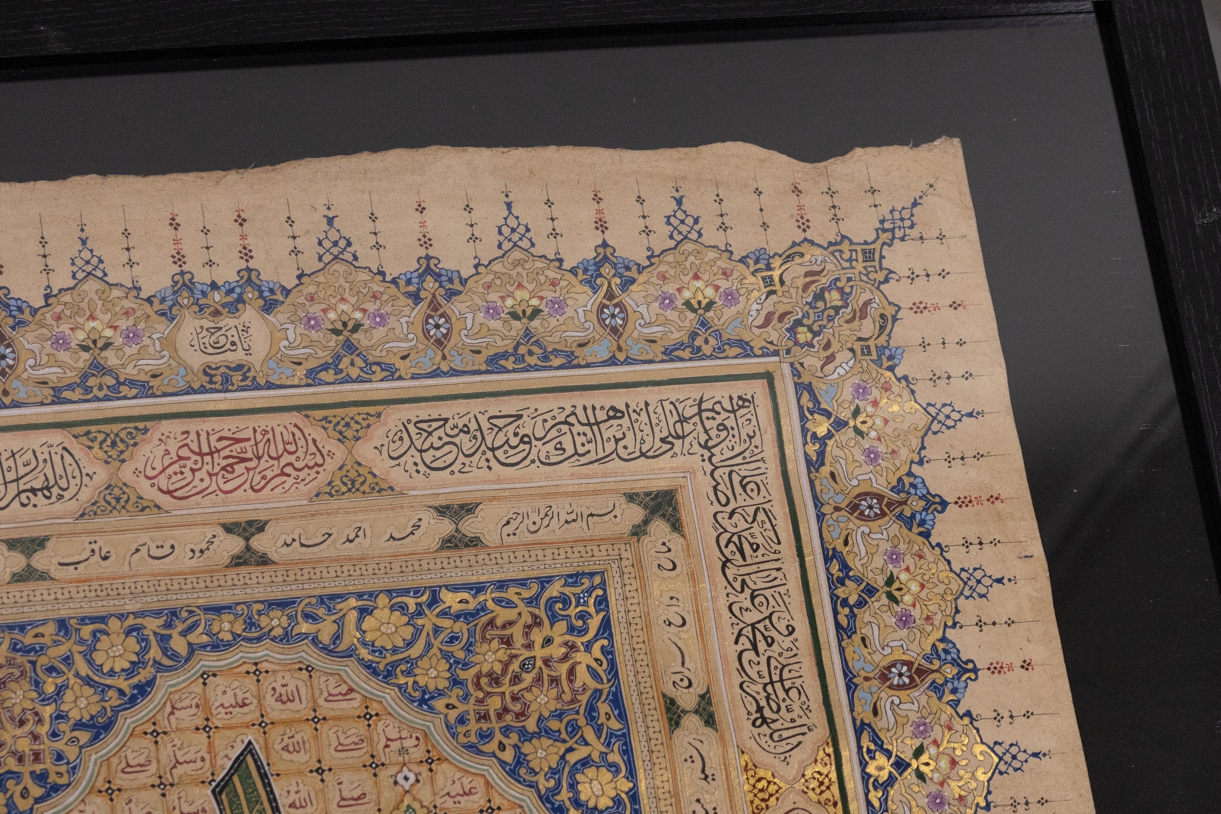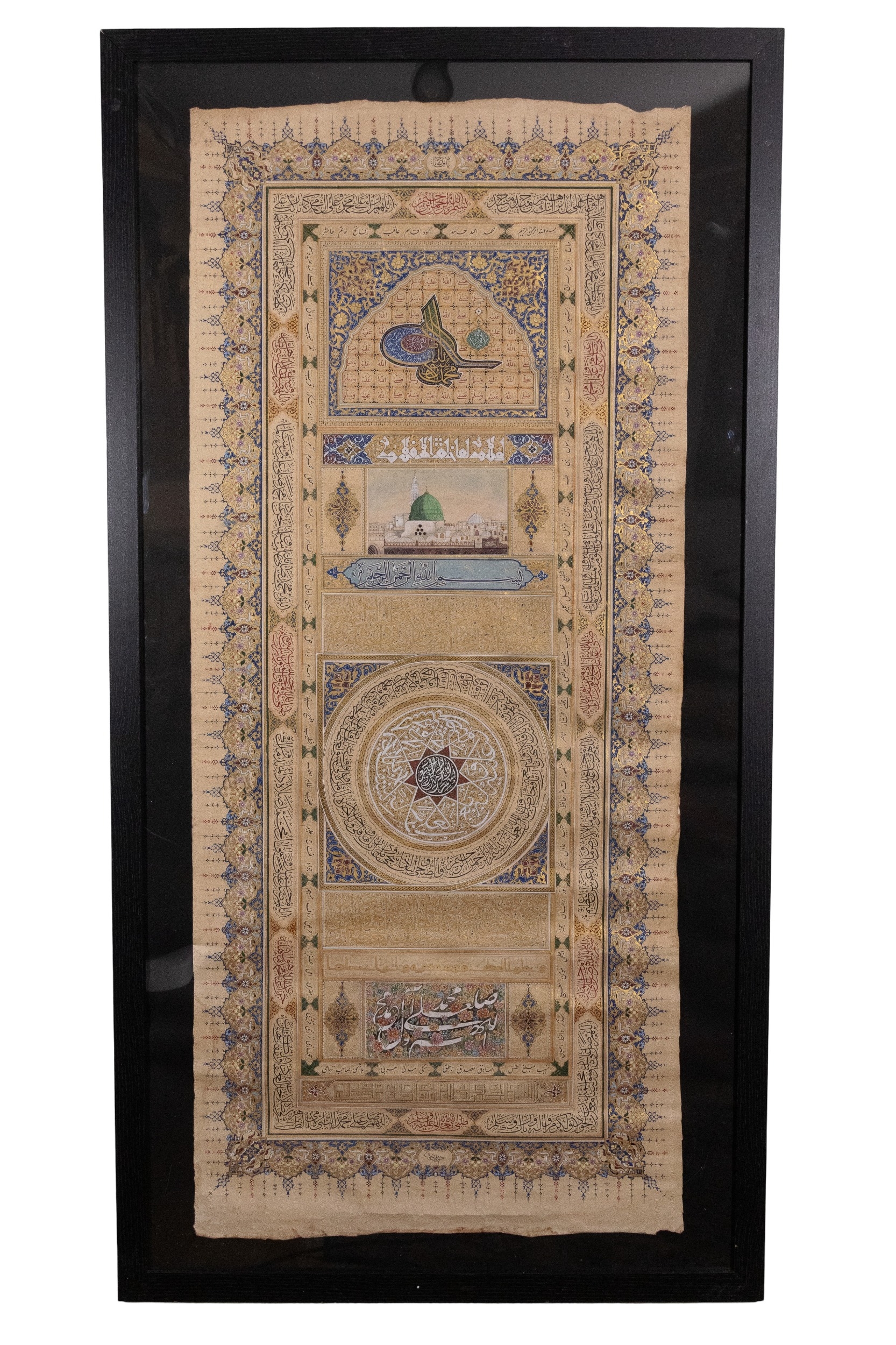 A Large Ottoman Calligraphic Devotional Panel Featuring the Prophet’s Mosque and Tughra.
