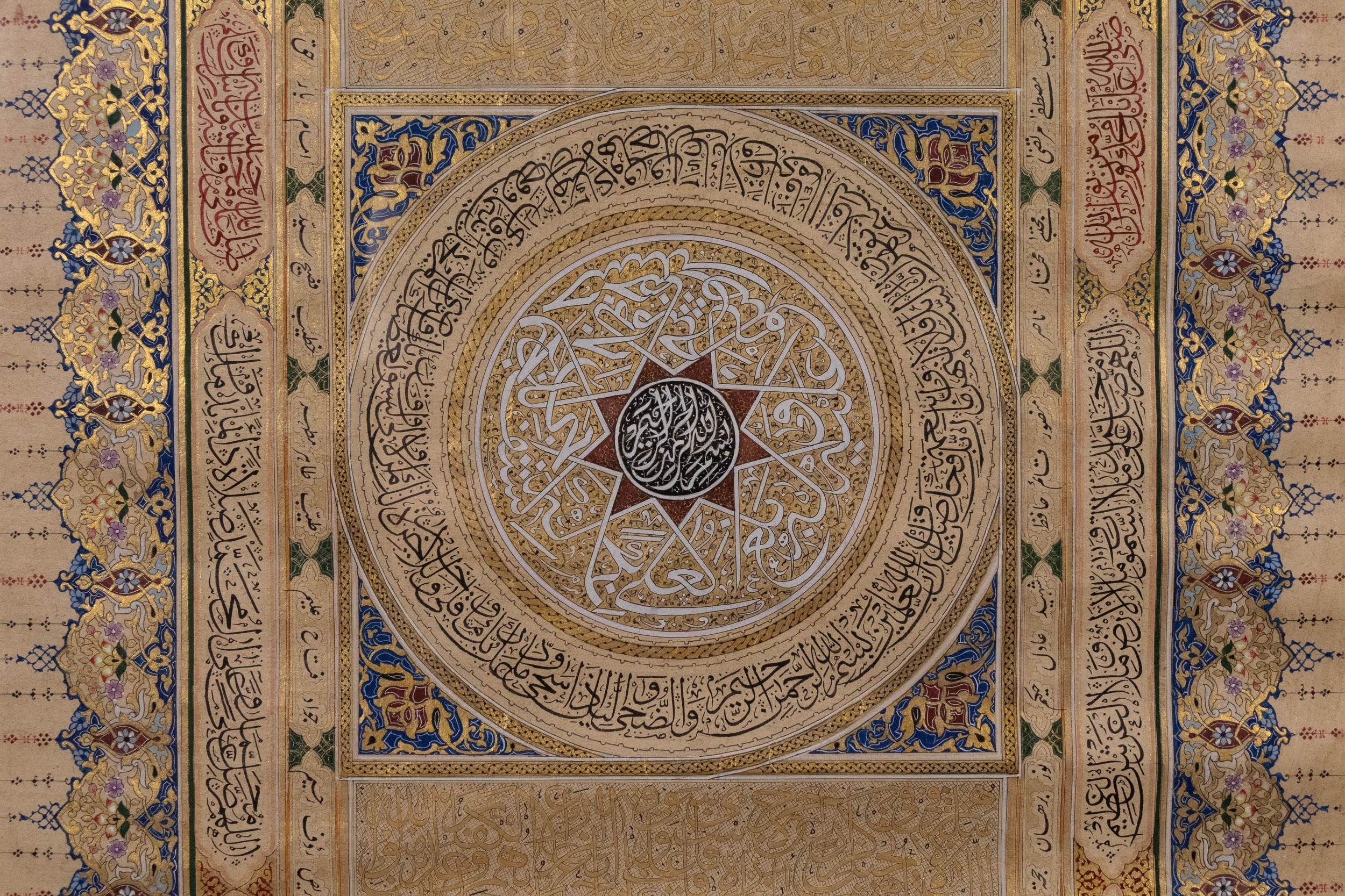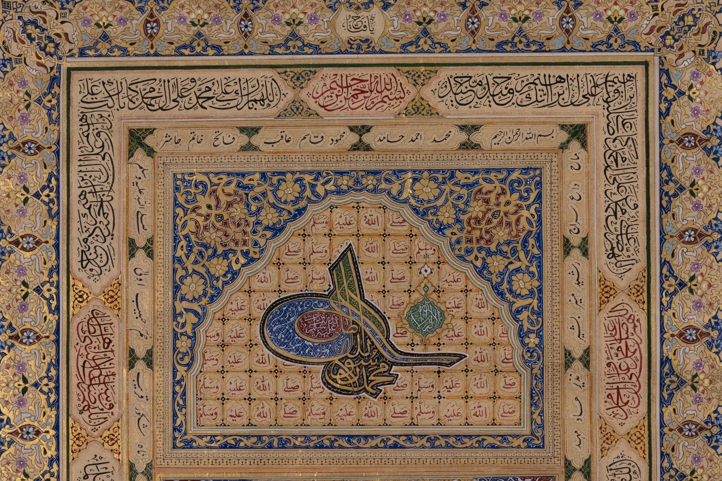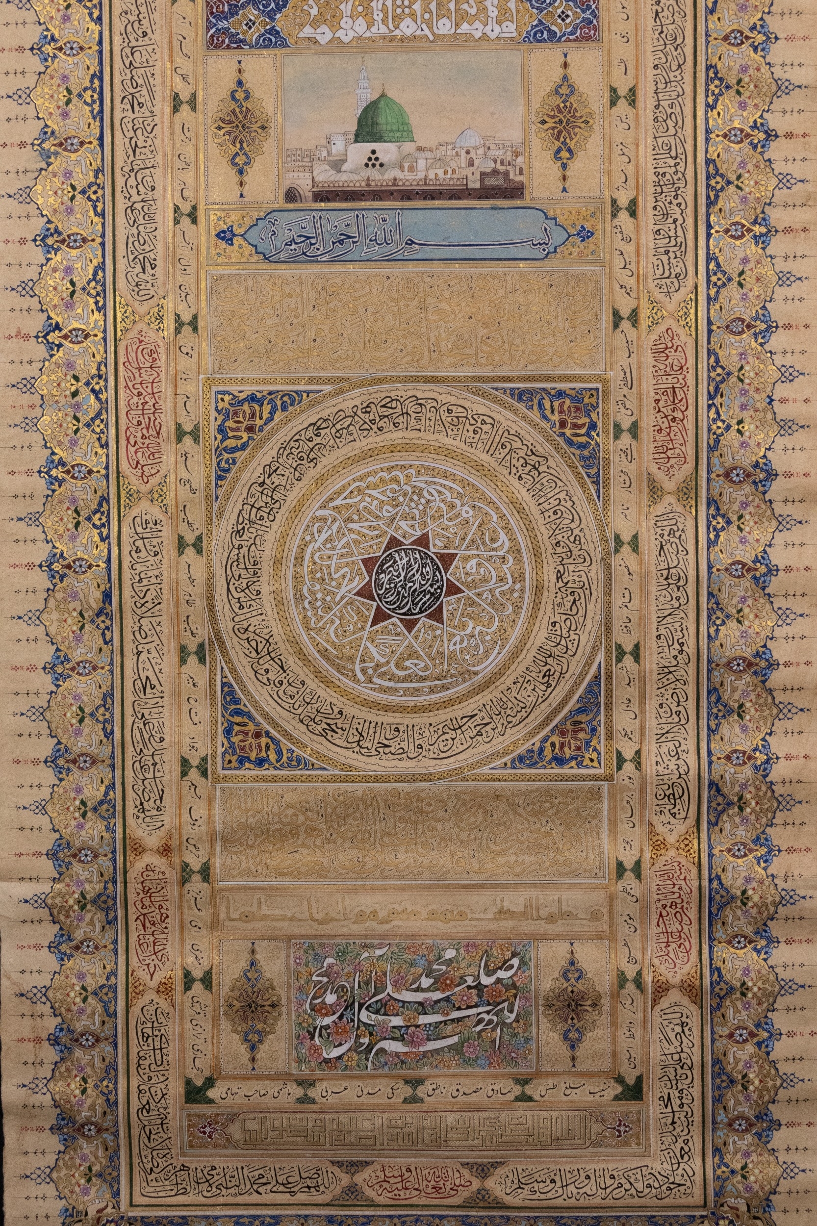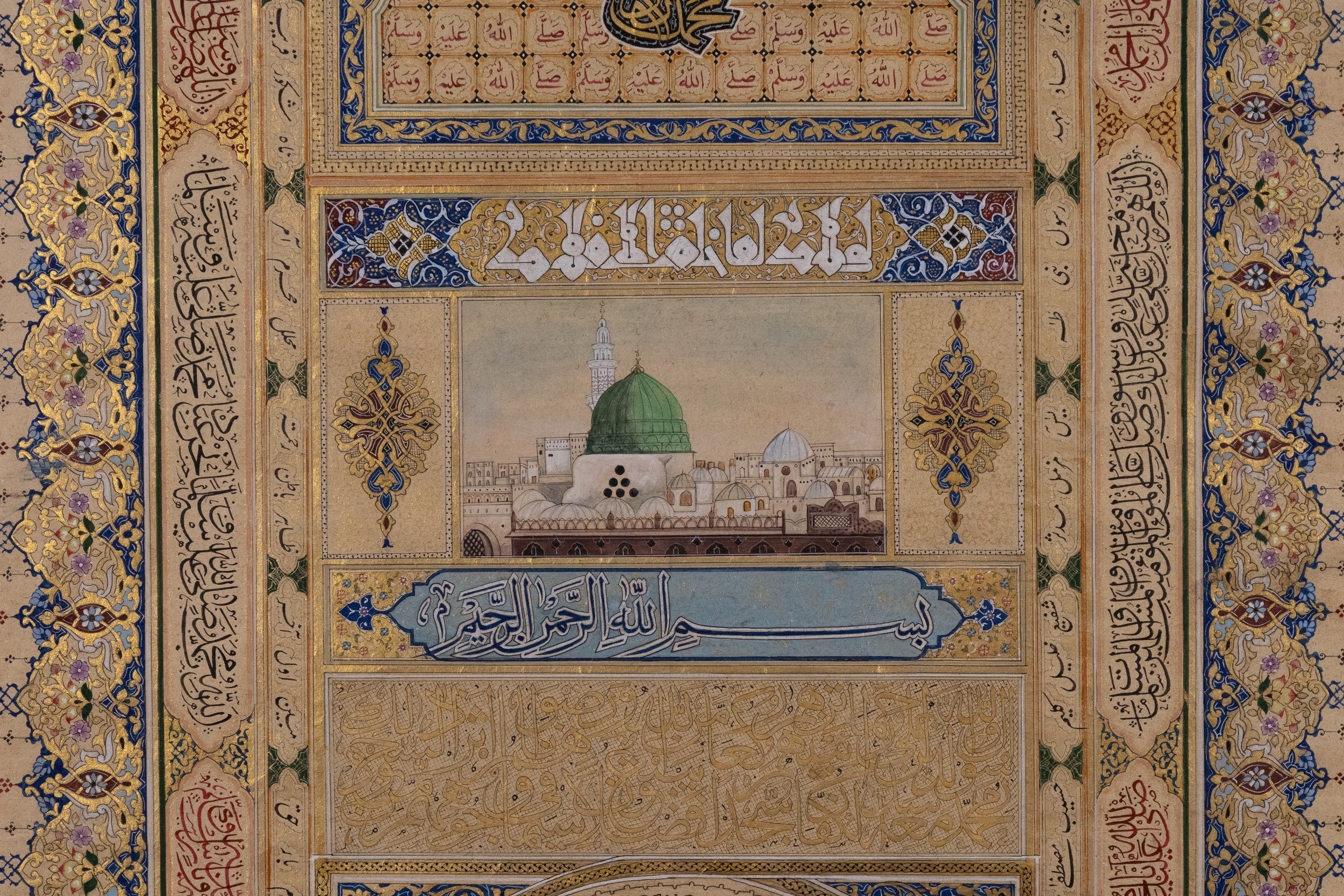 An elaborate and highly detailed large Ottoman calligraphic panel featuring an ornate and multi-register composition. The upper section contains a prominent imperial tughra, likely of an Ottoman sultan, surrounded by intricate floral arabesques. Below, a finely rendered depiction of the Prophet’s Mosque in Medina is framed by Quranic calligraphy and ornamental cartouches. The centrepiece includes a circular geometric calligraphic medallion with meticulously inscribed script radiating from a central seal. Additional inscriptions occupy the margins and lower band, integrating Quranic verses, invocations, and praises for the Prophet Muhammad.