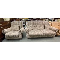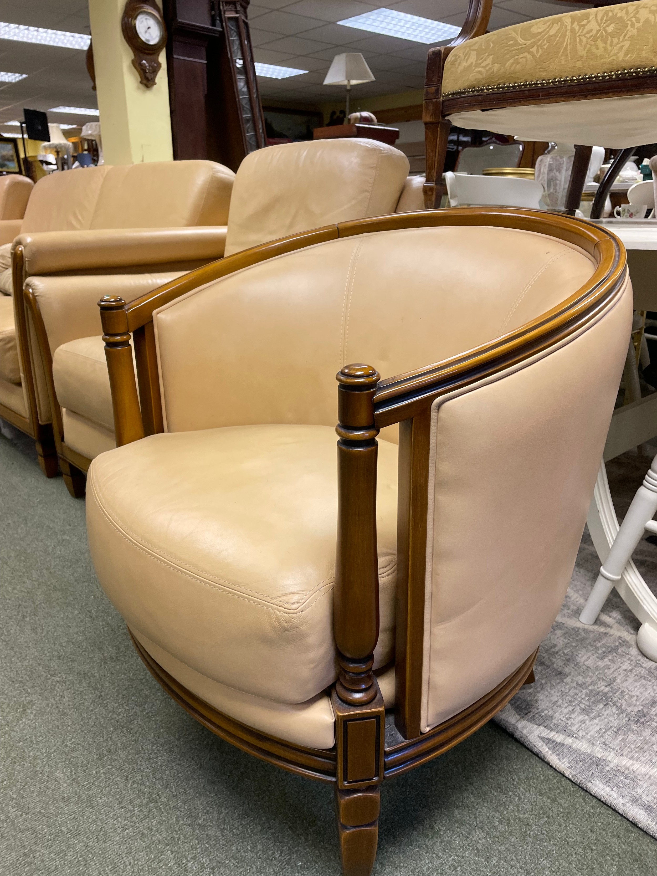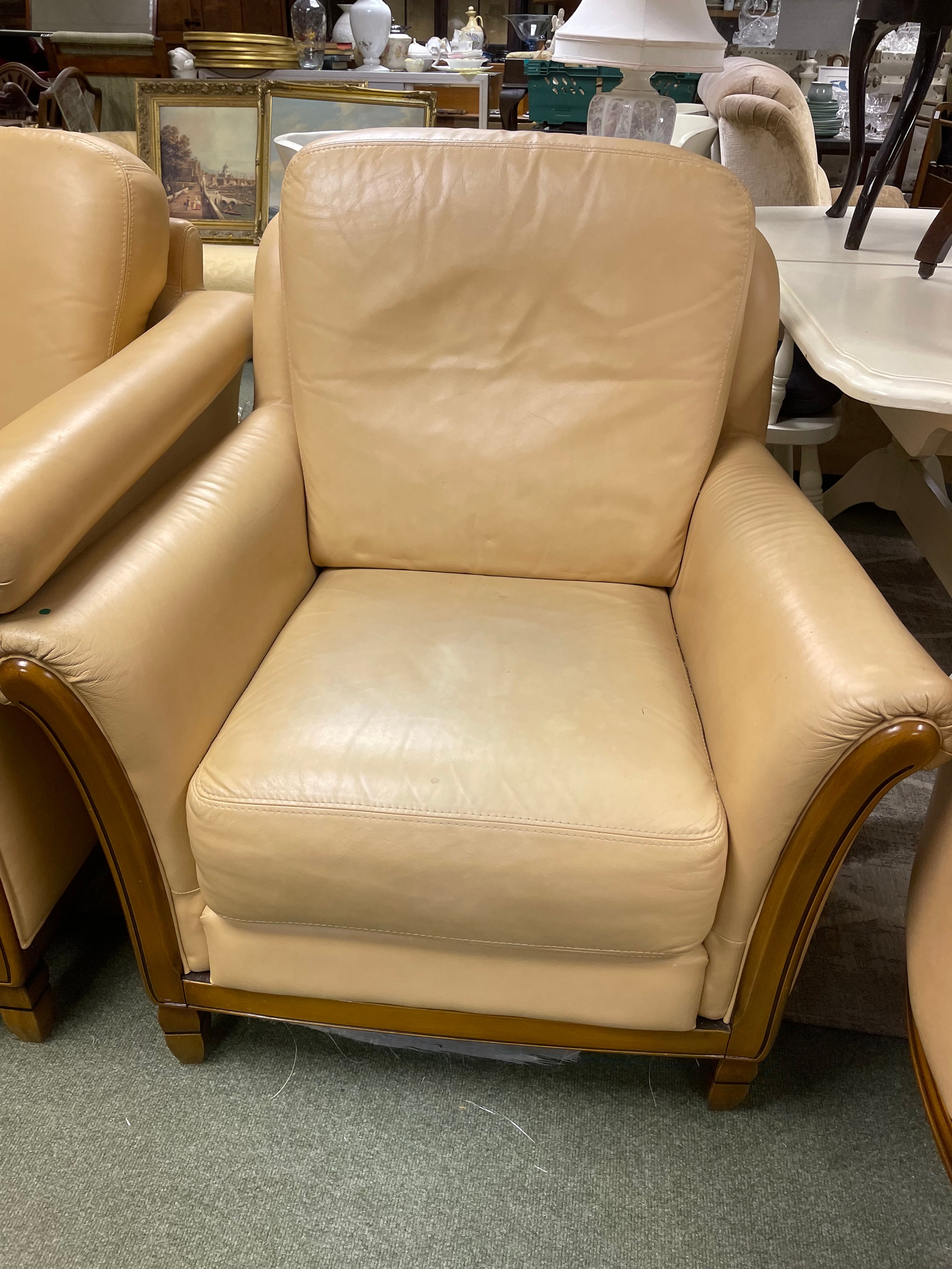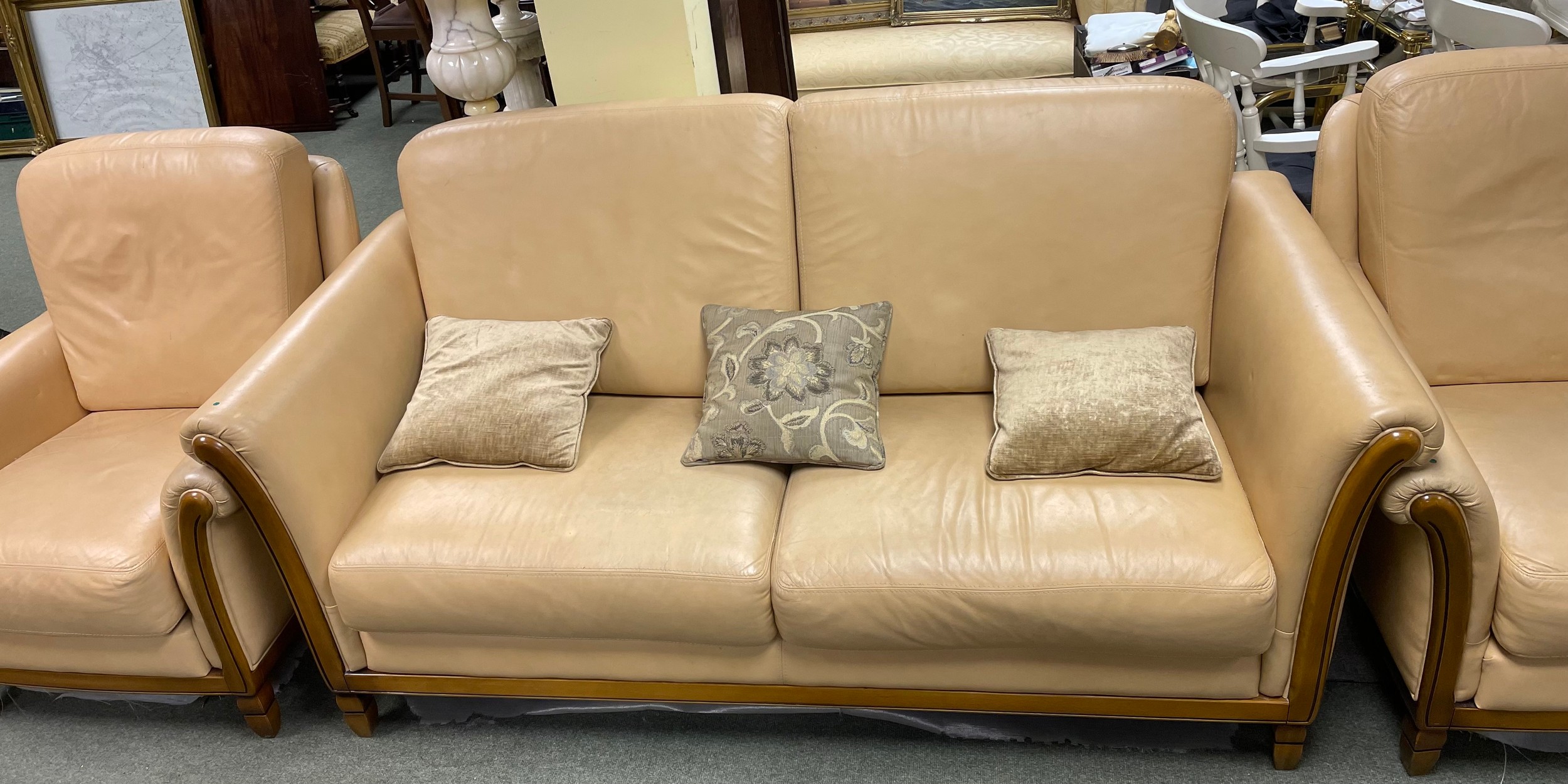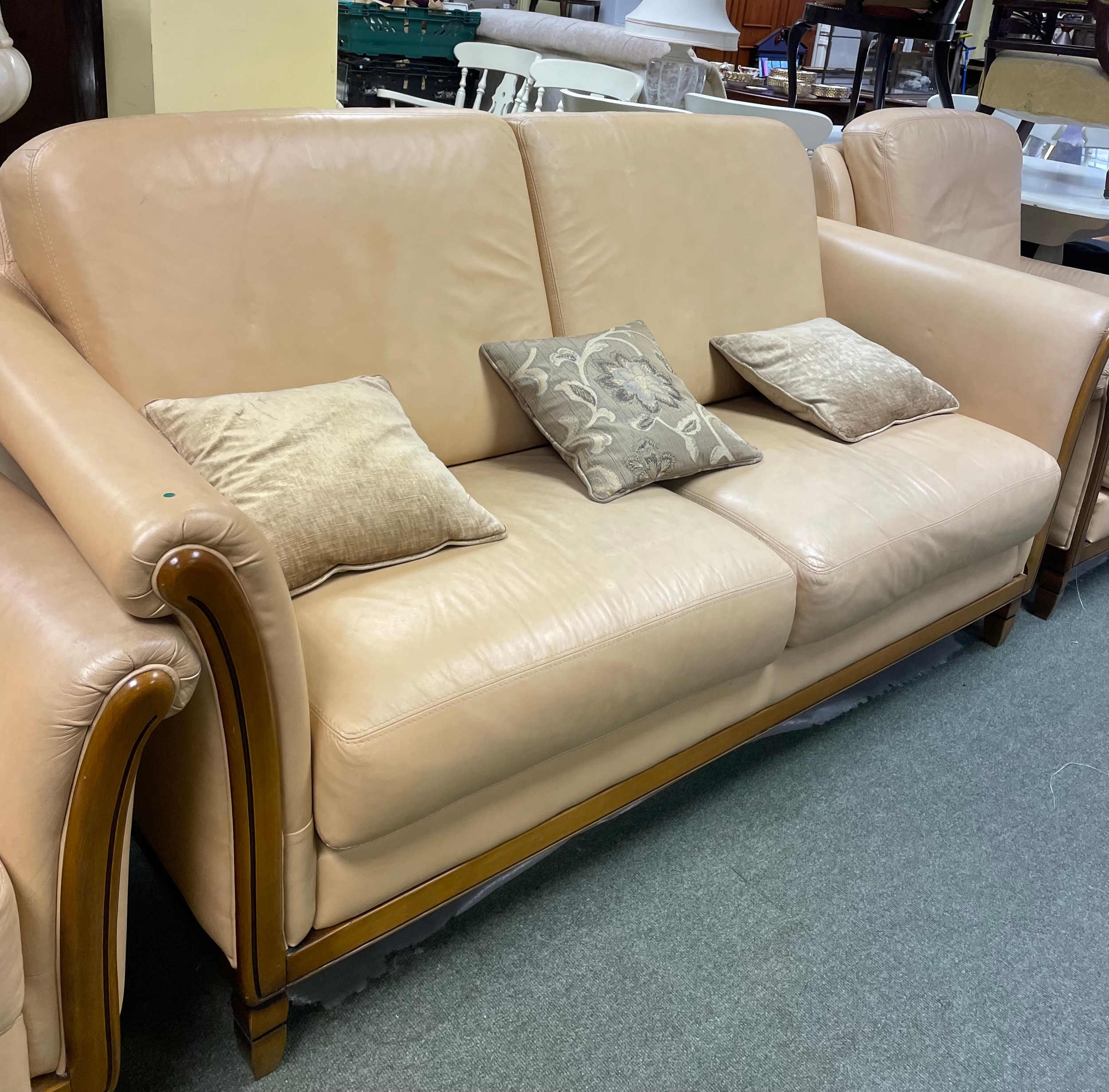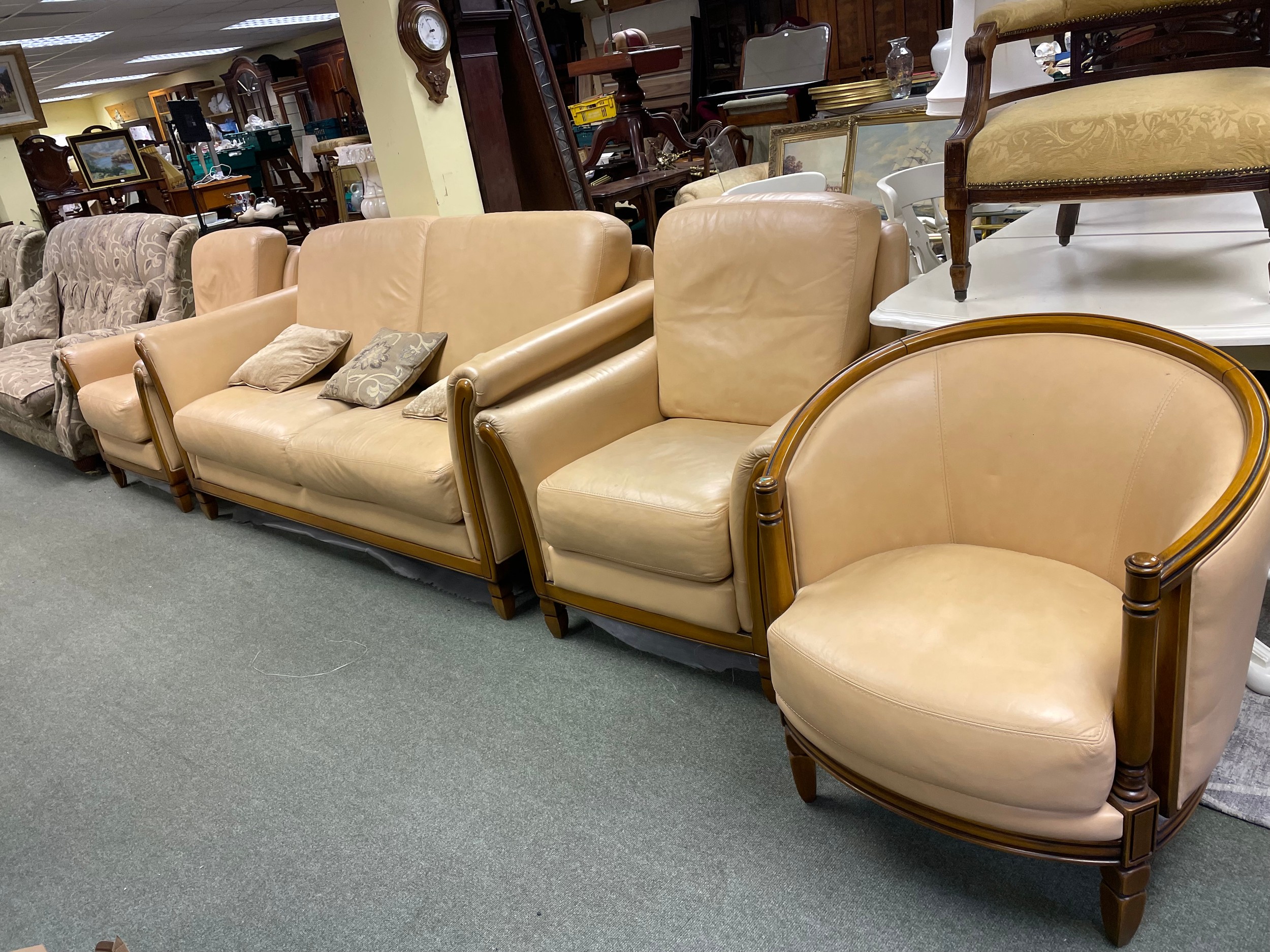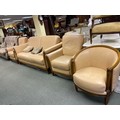 A cream coloured two seater sofa, two matching armchairs and a matching tub chair.