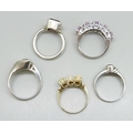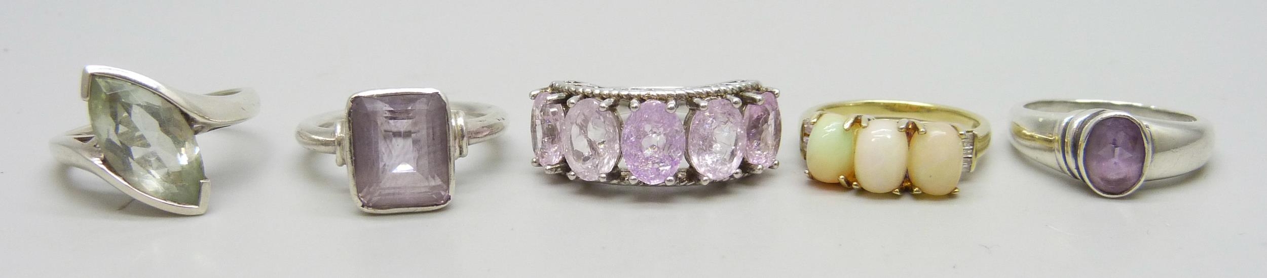 Five silver rings including opal and amethyst, 21g
