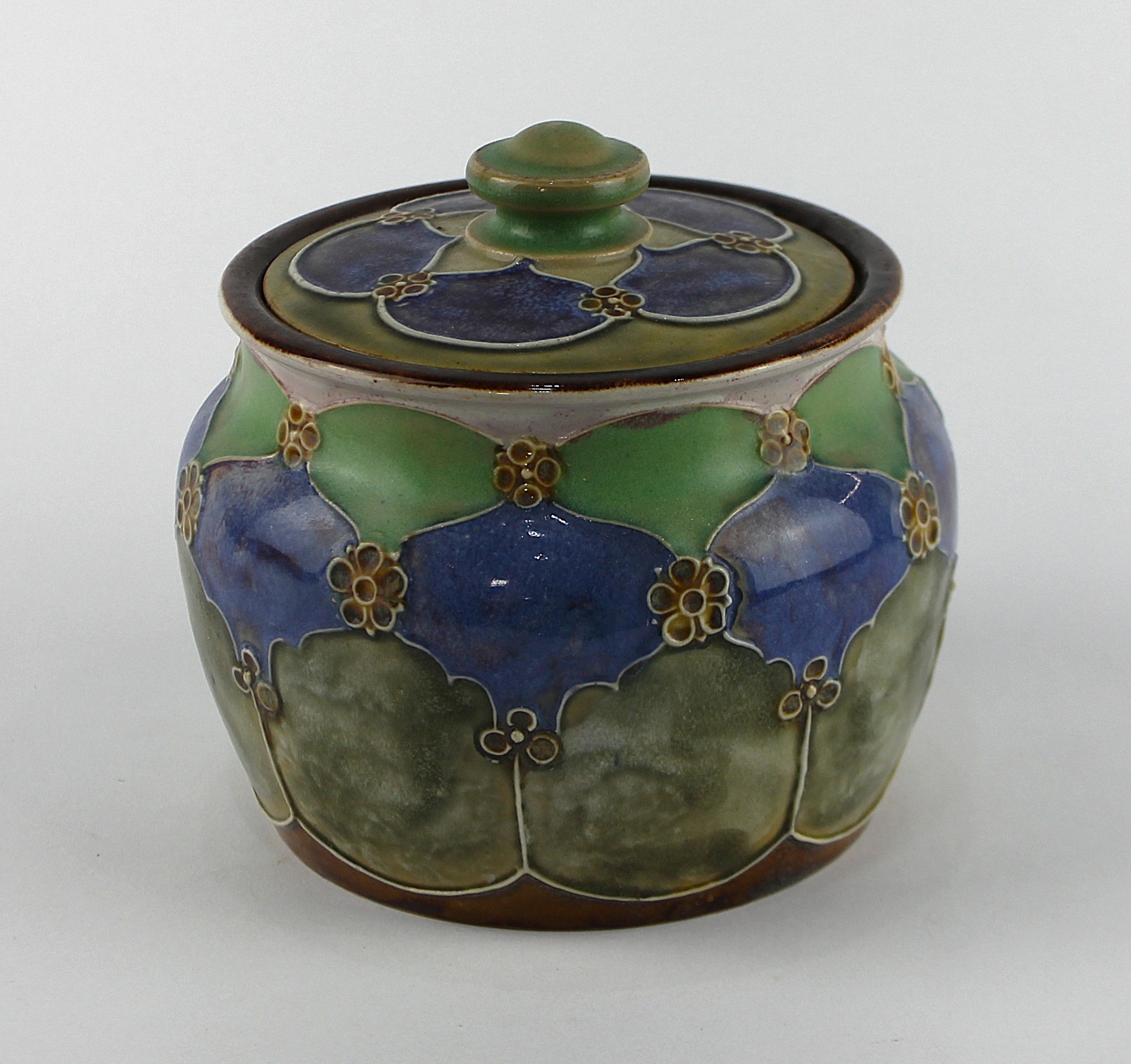 A Royal Doulton stoneware art pottery jar and cover, c.1910 / 1920, various factory / artists marks to underside, 14cm high.
