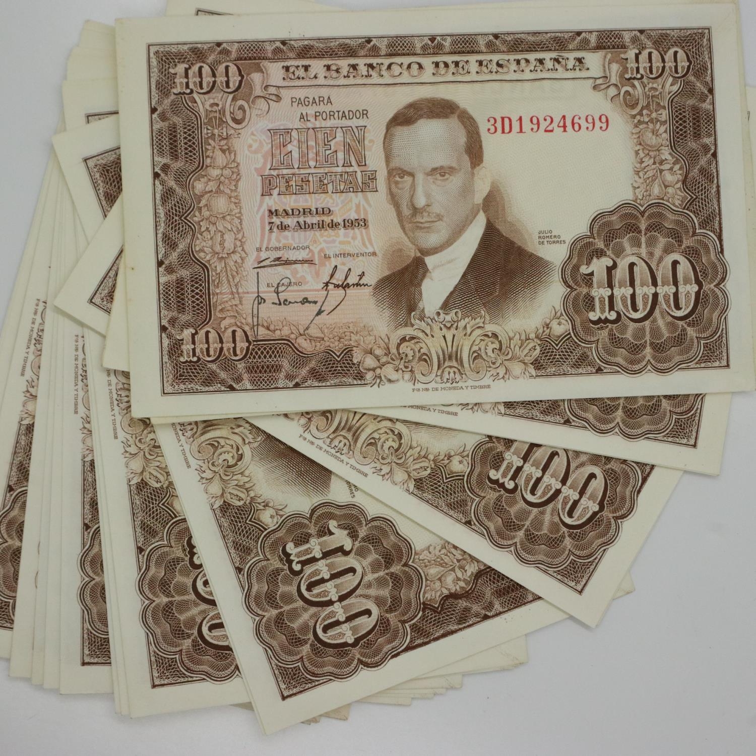 Thirty Spanish 100 pesetas banknotes, mostly sequential, nUNC. UK P&P Group 0 (£6+VAT for the first lot and £1+VAT for subsequent lots)