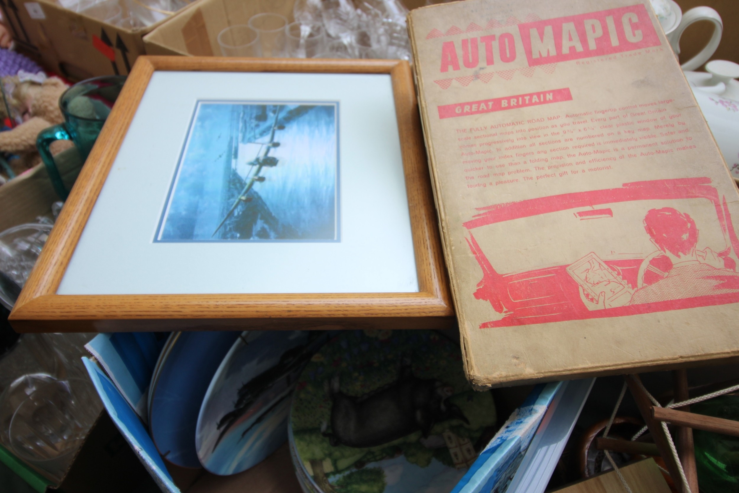 Collection of decorative wall plates including Second World War Bombers together with framed picture of a Lancaster and an automapic road map of vintage era