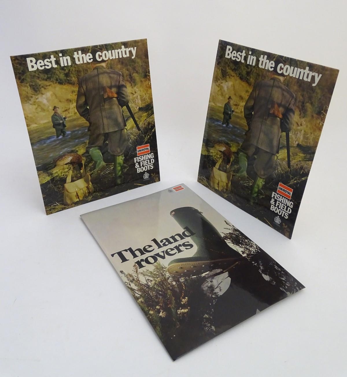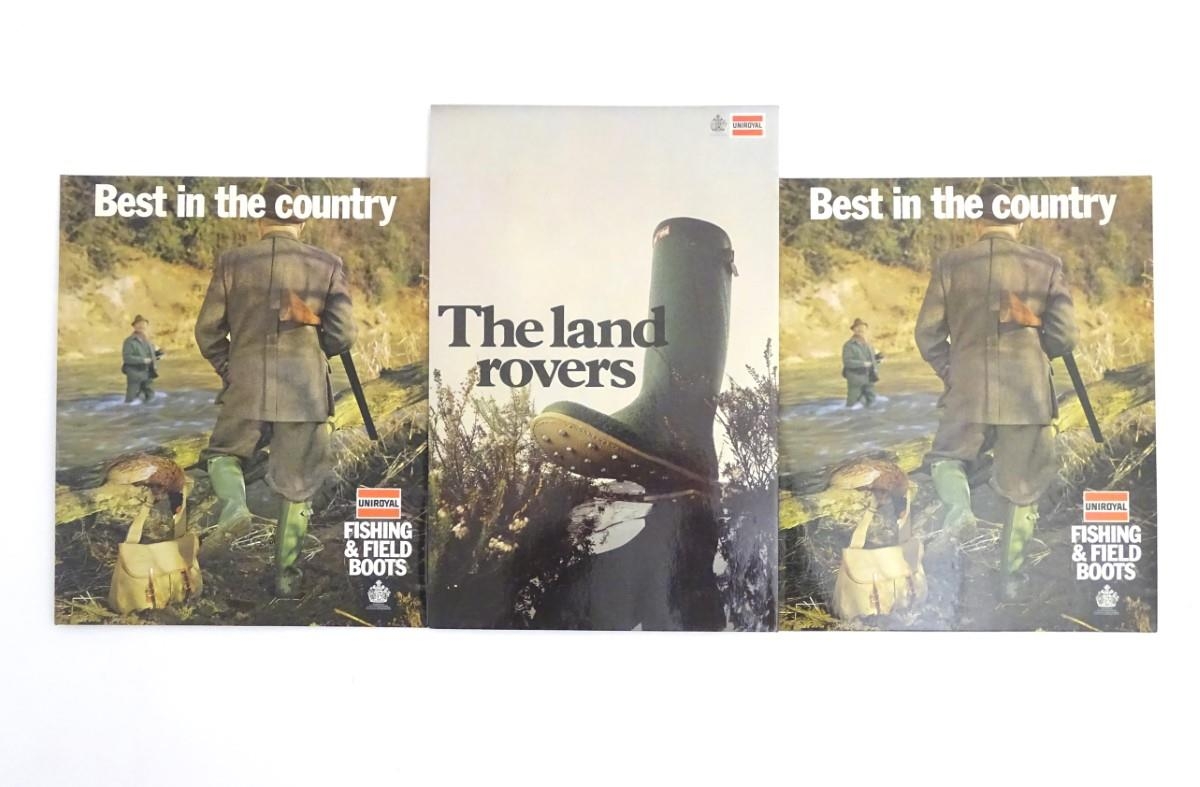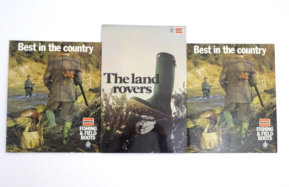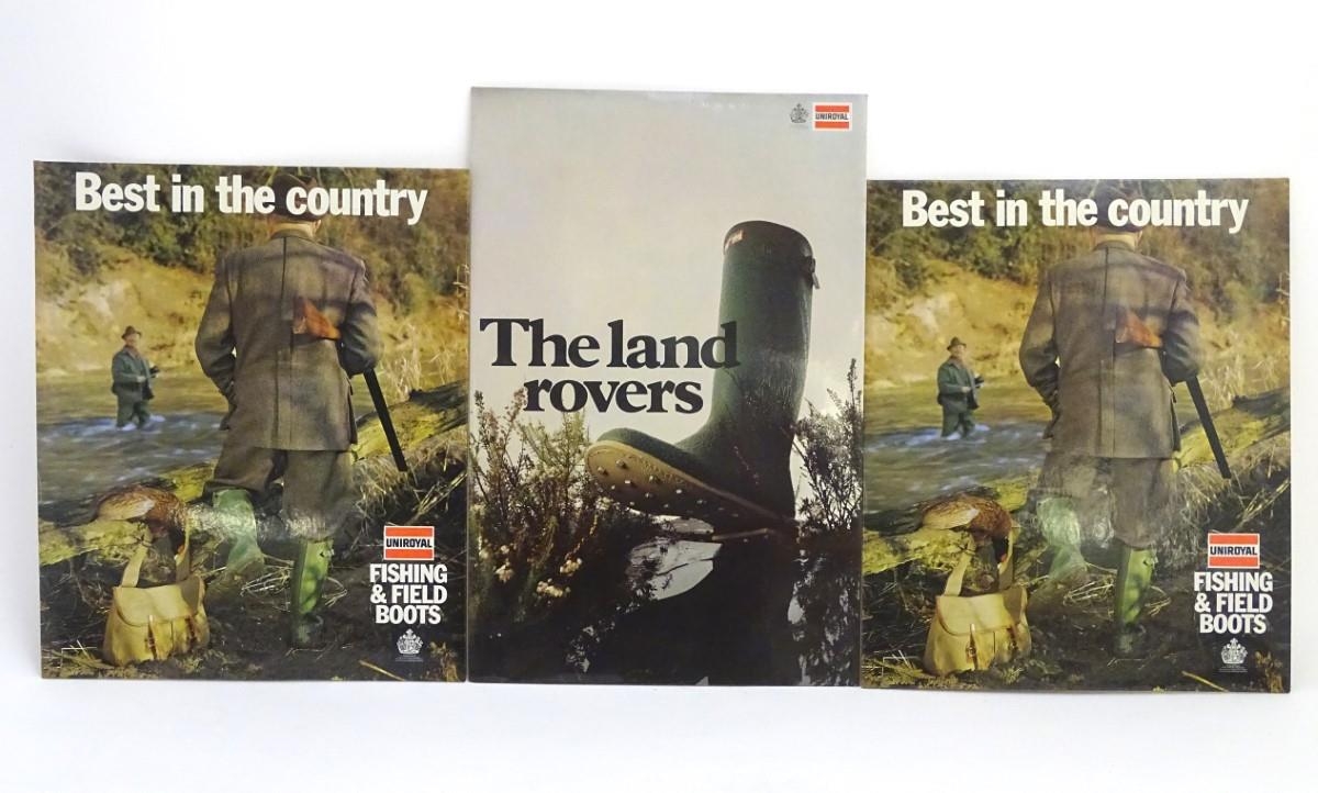 Three shop advertising cards for Uniroyal wellington boots (predecessors of Hunter), depicting fieldsports scenes, the largest 15'' tall, 10'' wide.