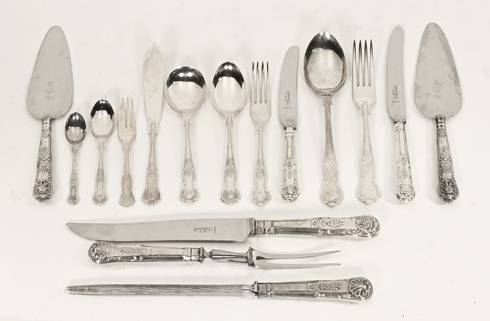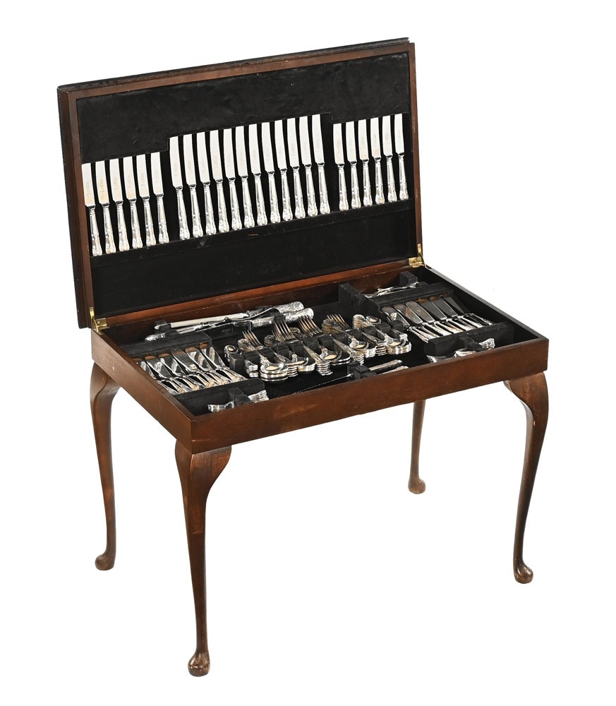 A Chinacraft Limited Sheffield stainless steel and silver plated Kings pattern canteen of cutlery, with two silver handled cake slices, all housed in a leather topped floor standing mahogany canteen. Height 56 cm, width 78 cm, depth 48 cm.