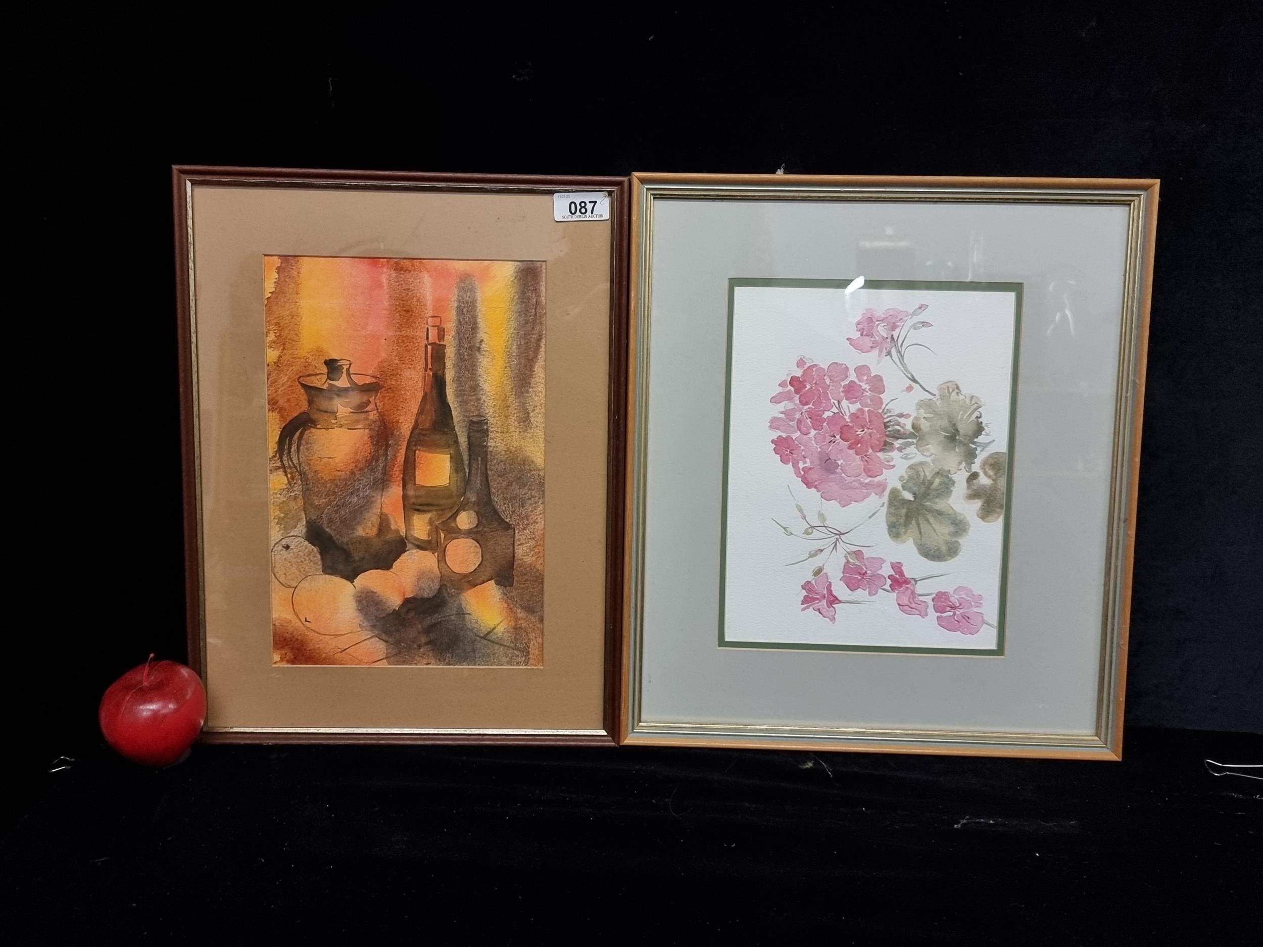 Two original watercolour on paper paintings, one featuring a still life in sepia tones, the other showing a botanic study in blush pink.