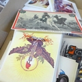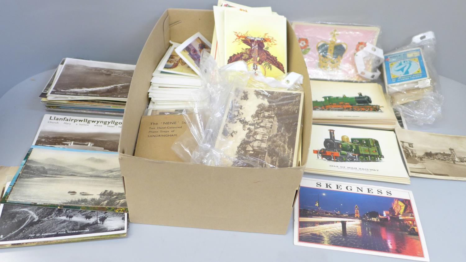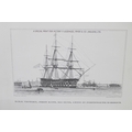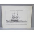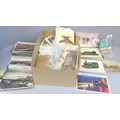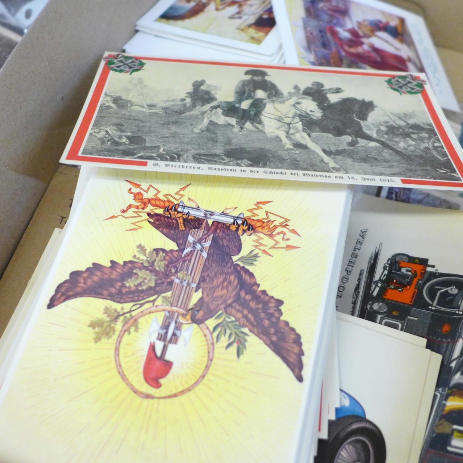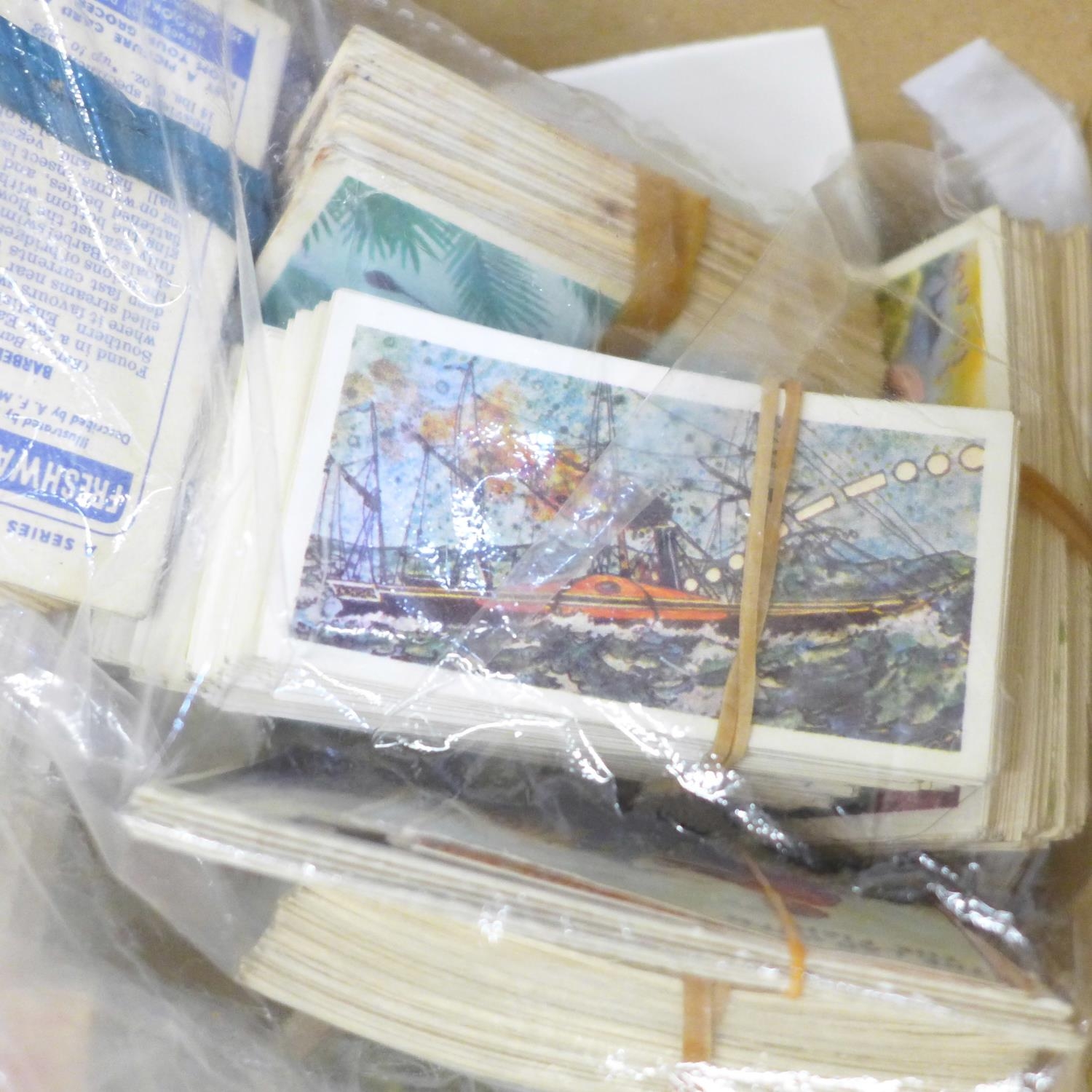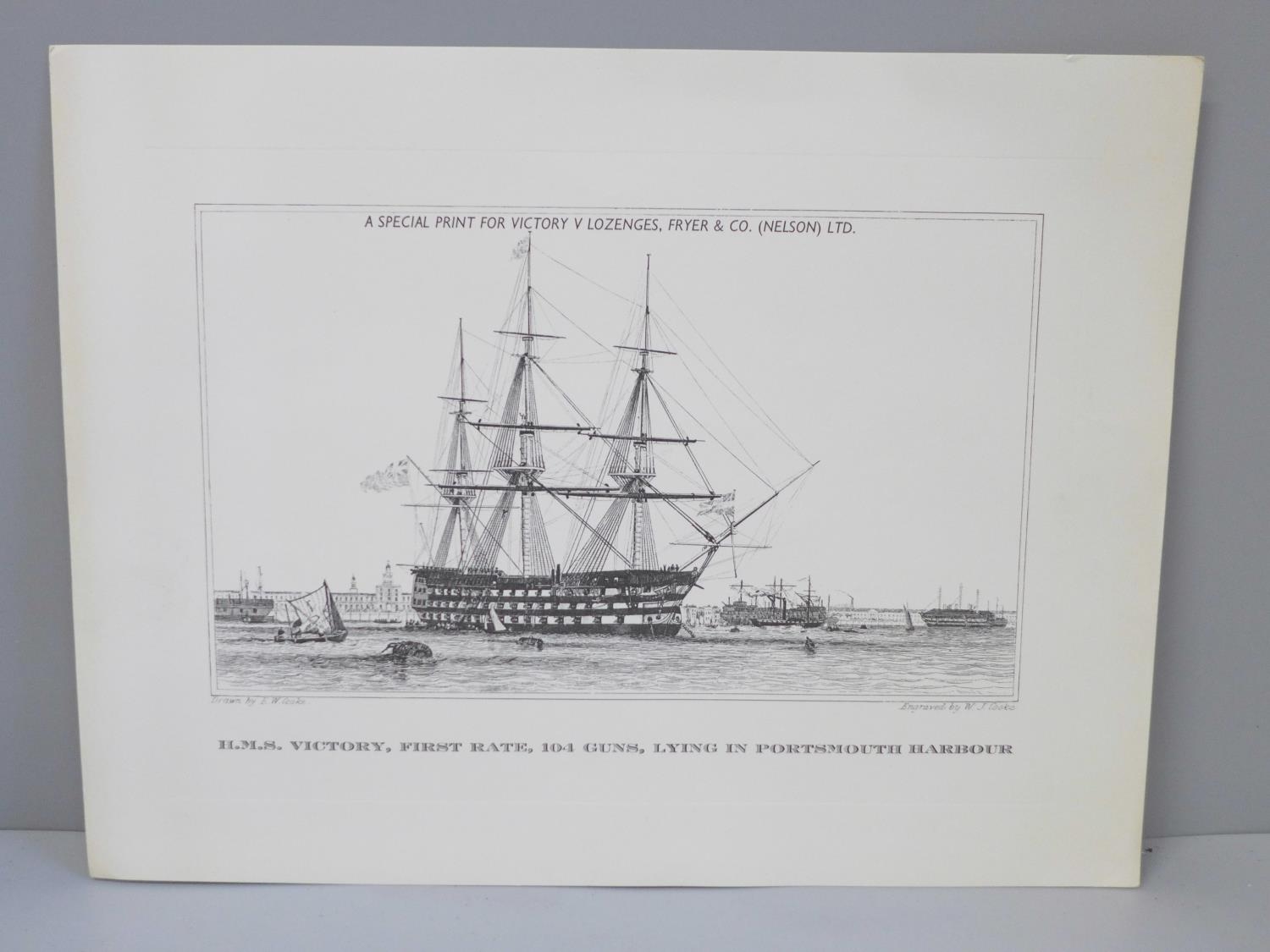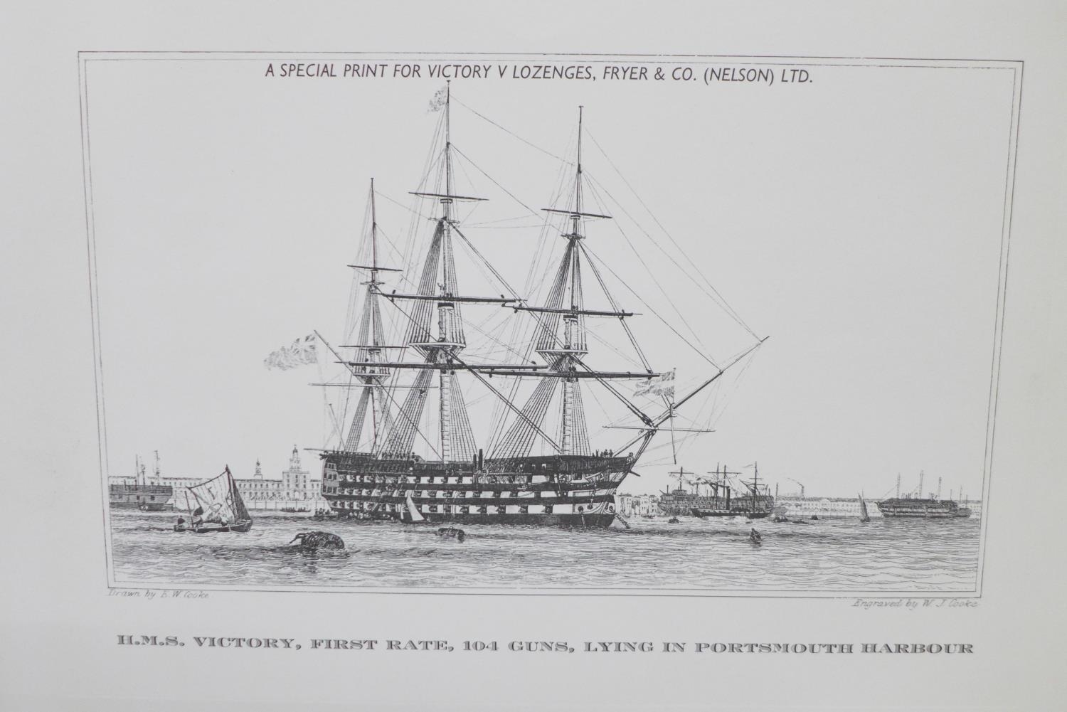 A box of postcards and cigarette cards and a HMS Victory print (produced for Victory V lozenges)