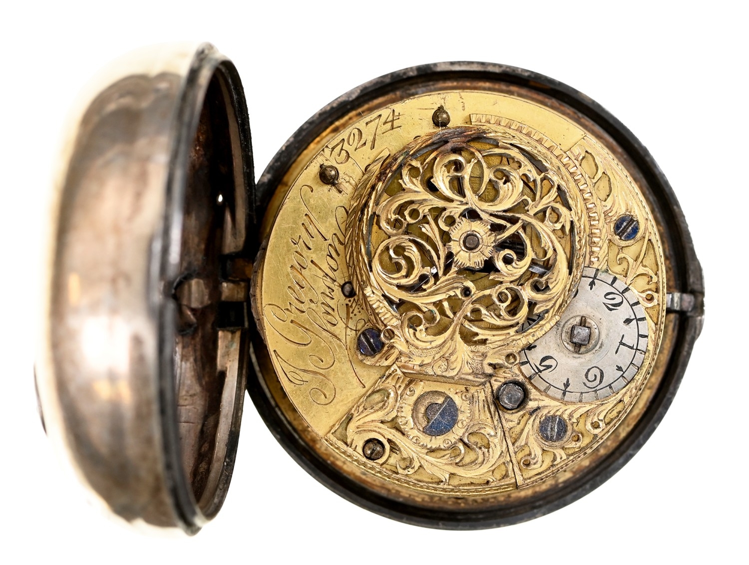 A George III silver verge watch, J Gregory London No 3274, 4.5cm diam, marks rubbed