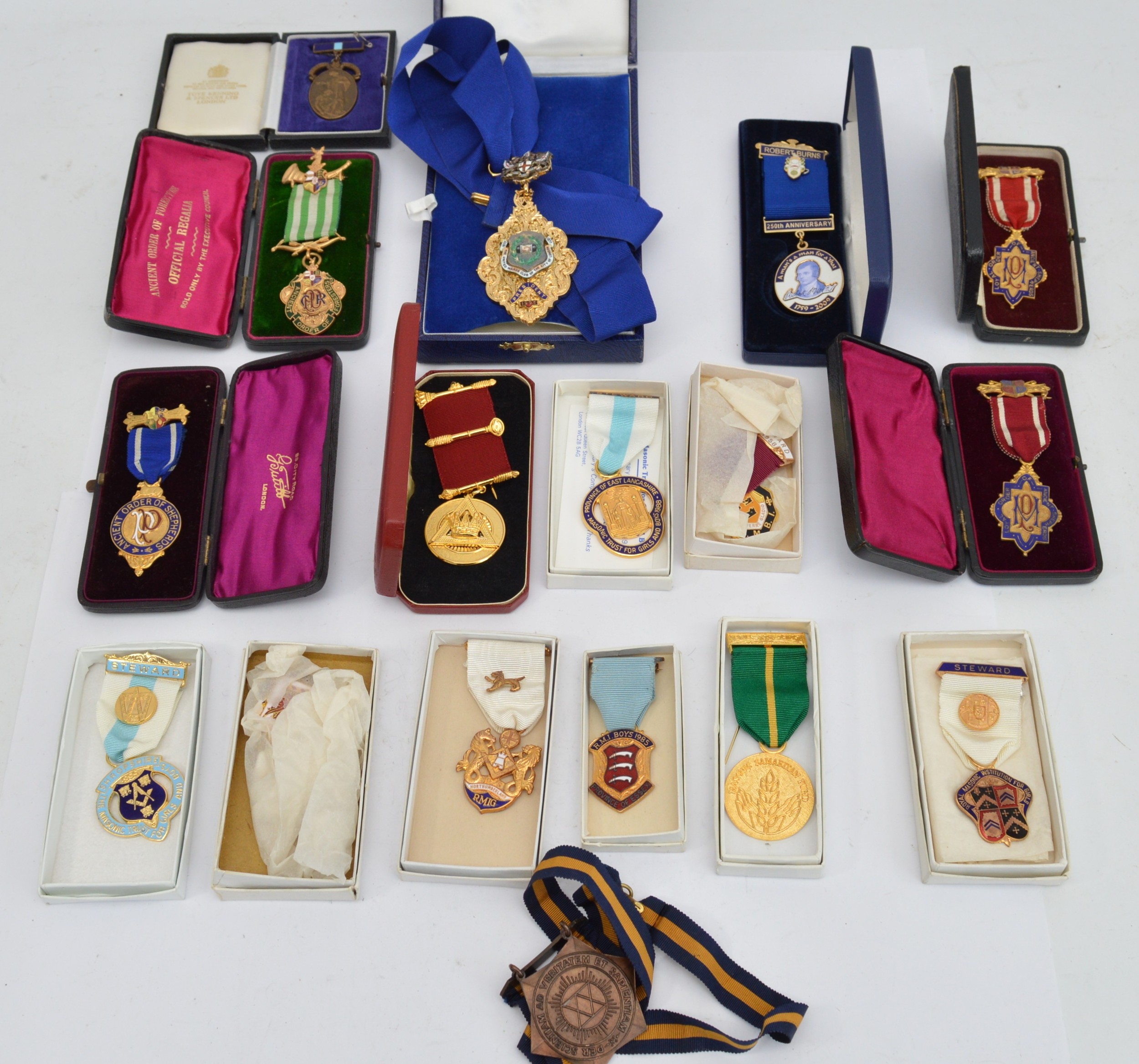 A collection of boxed masonic jewels to include London Lodge, Loyal Order Of Ancient Shepherds and Ancient Order Of Foresters.