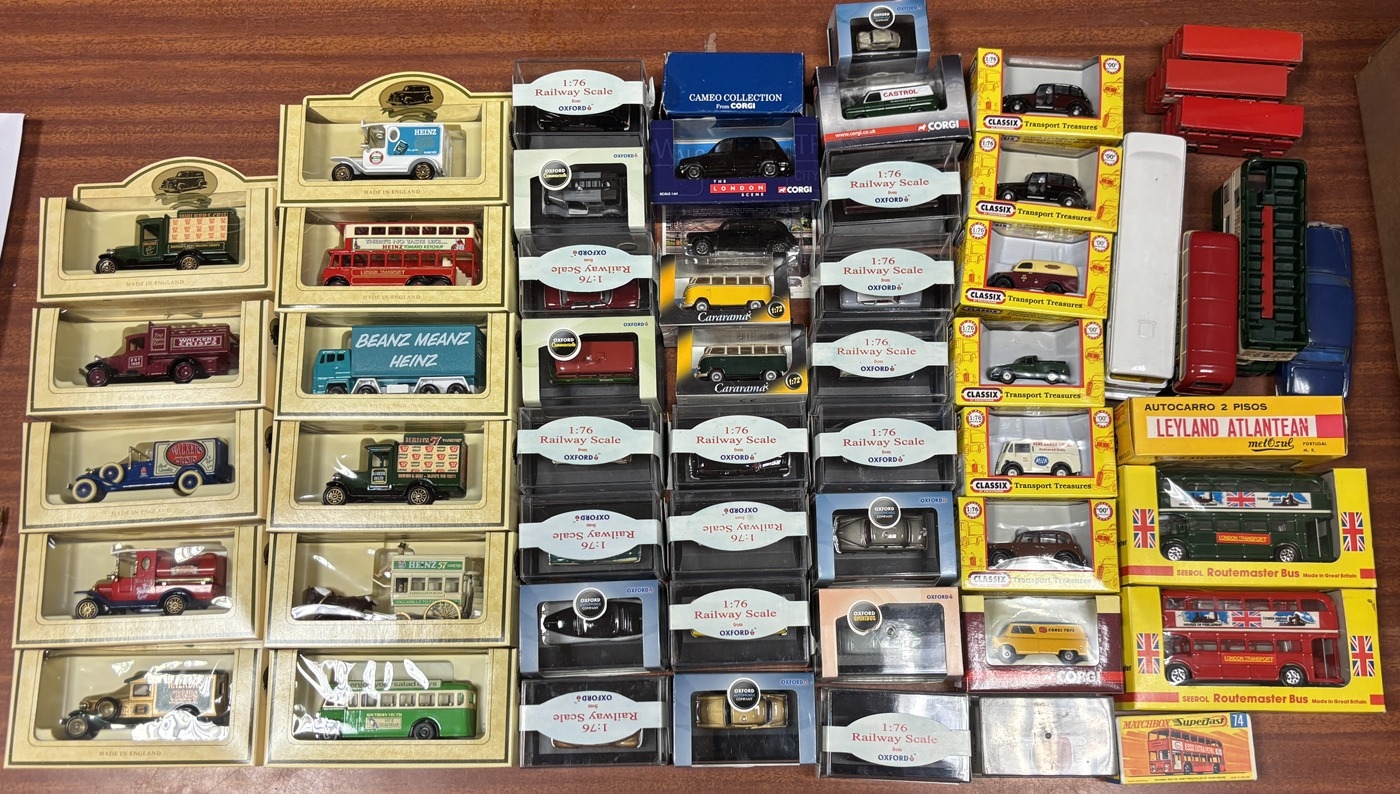 Collection of model vehicles, generally excellent in excellent boxes, including Cararama (2), Corgi (4), Classix (6), Lledo (11), Matchbox, Melosul, Oxford (20) and Routemaster (2). Plus unboxed models (7). Qty 83. (2B)
