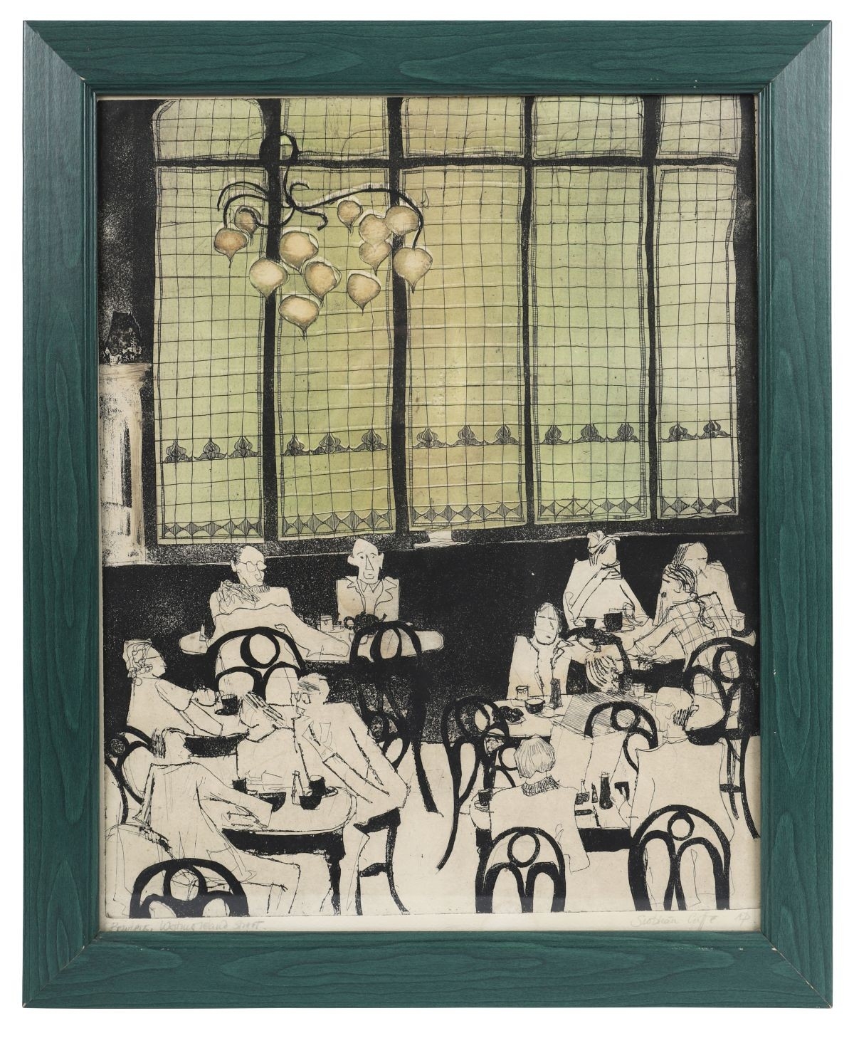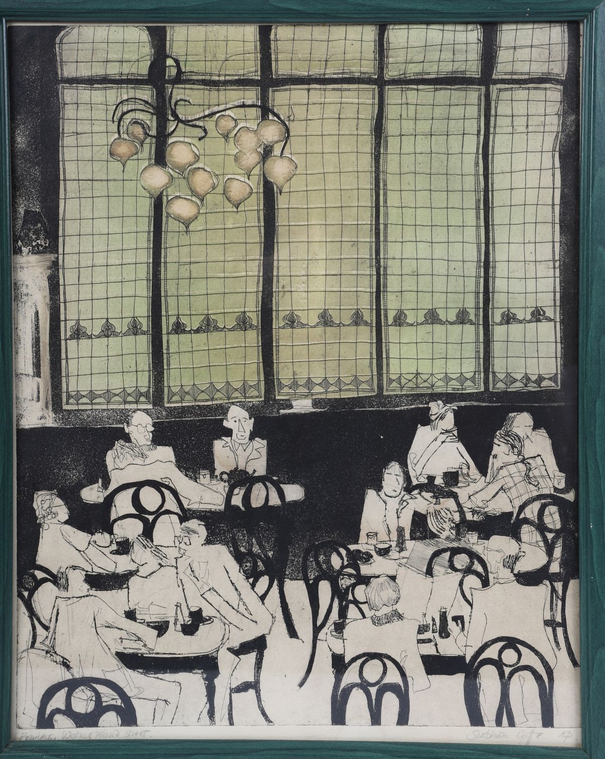 Lithograph depicting the interior of Bewley’s Café, with seated patrons and distinctive stained-glass windows. Signed and inscribed Artist’s Proof by the artist. Image: 50 x 40 cm. Framed: 60 x 48 cm. PICTURES AND PRINTS Thursday 11th December 2025 20:02:16