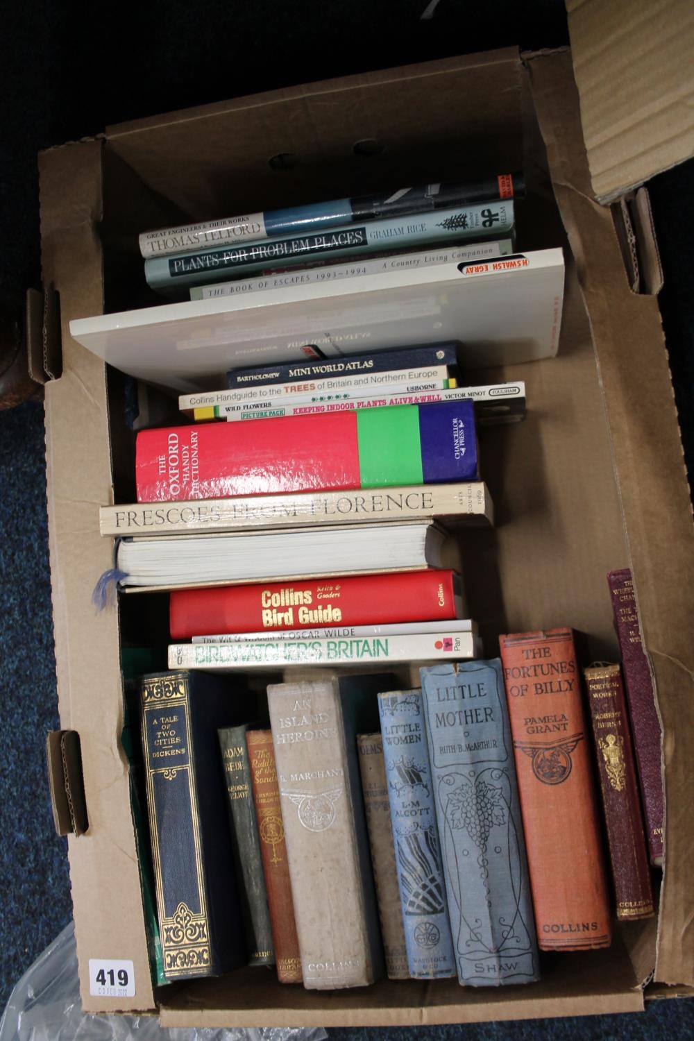 Box containing books to include The Fortune of Billy, Little Women, and others.