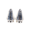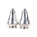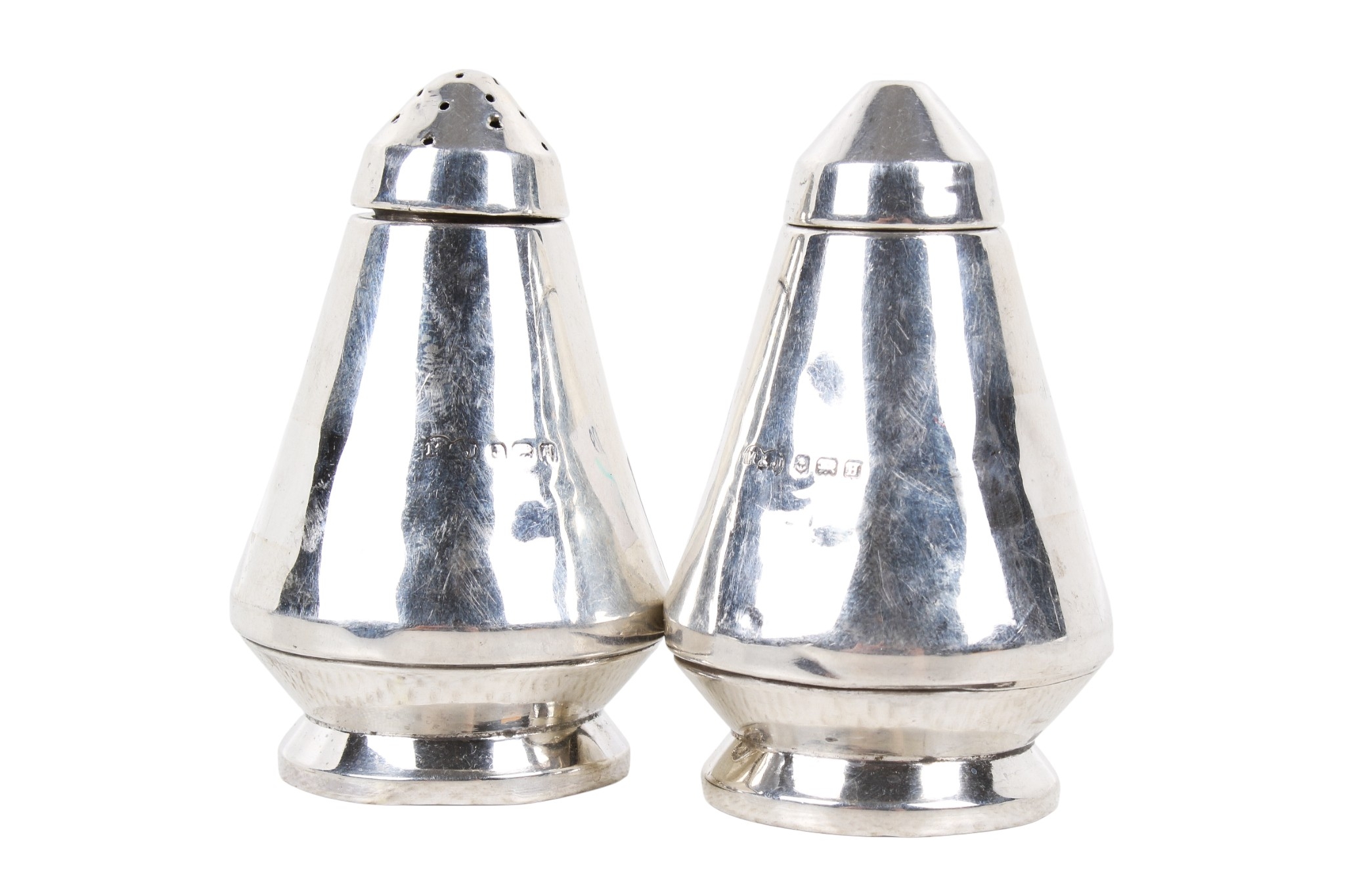 A 20th century silver 'space rocket' salt and pepper set. Of tapered form with circular weighted bases, hallmarked Marson & Jones, Birmingham 1932, height 7.5cm.