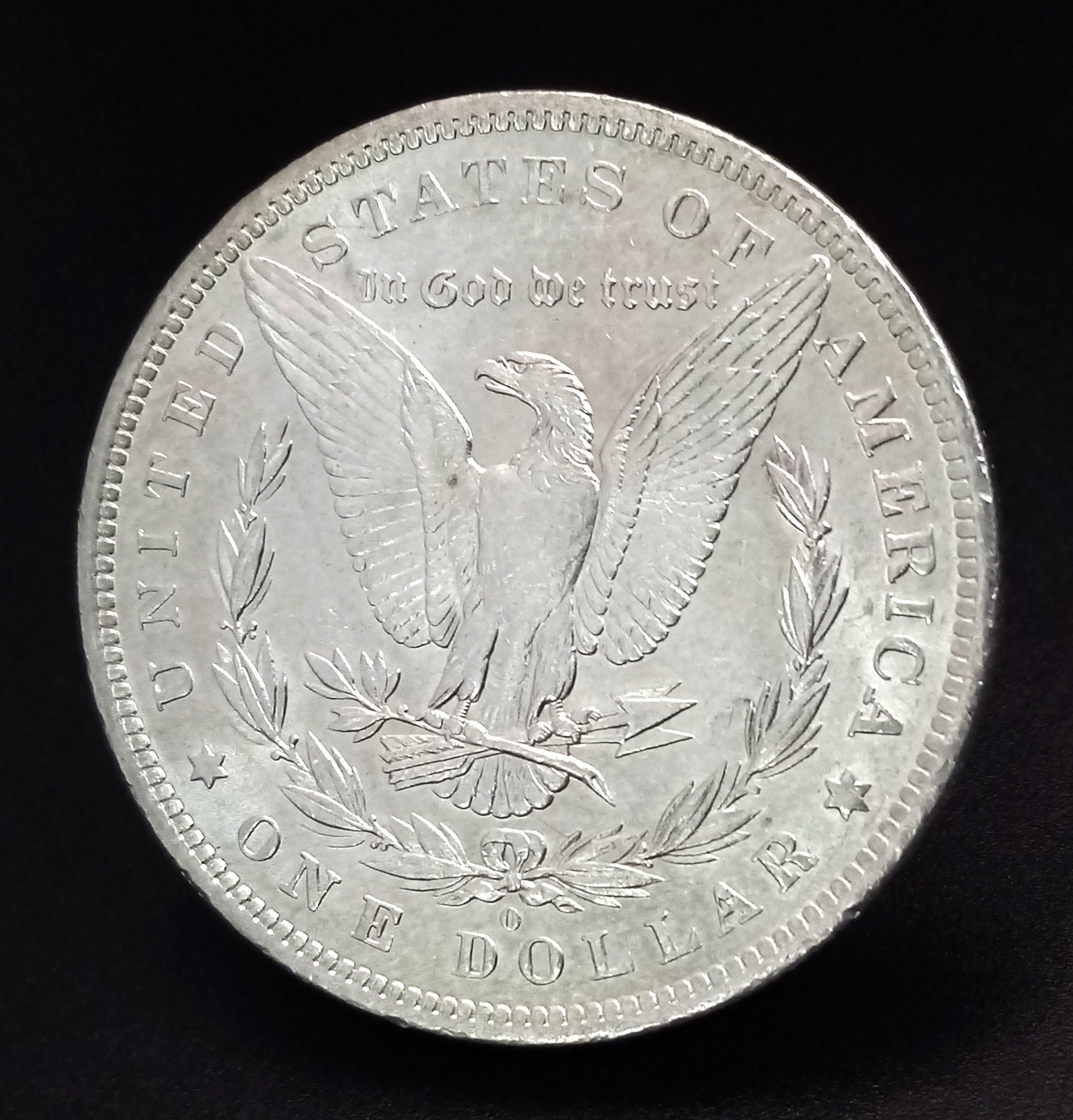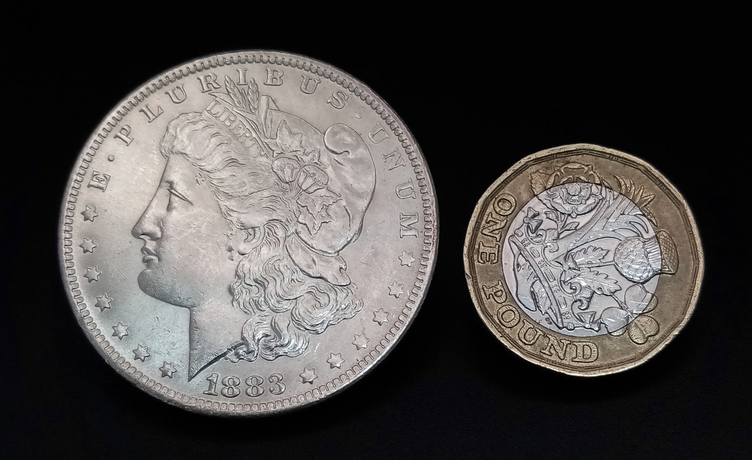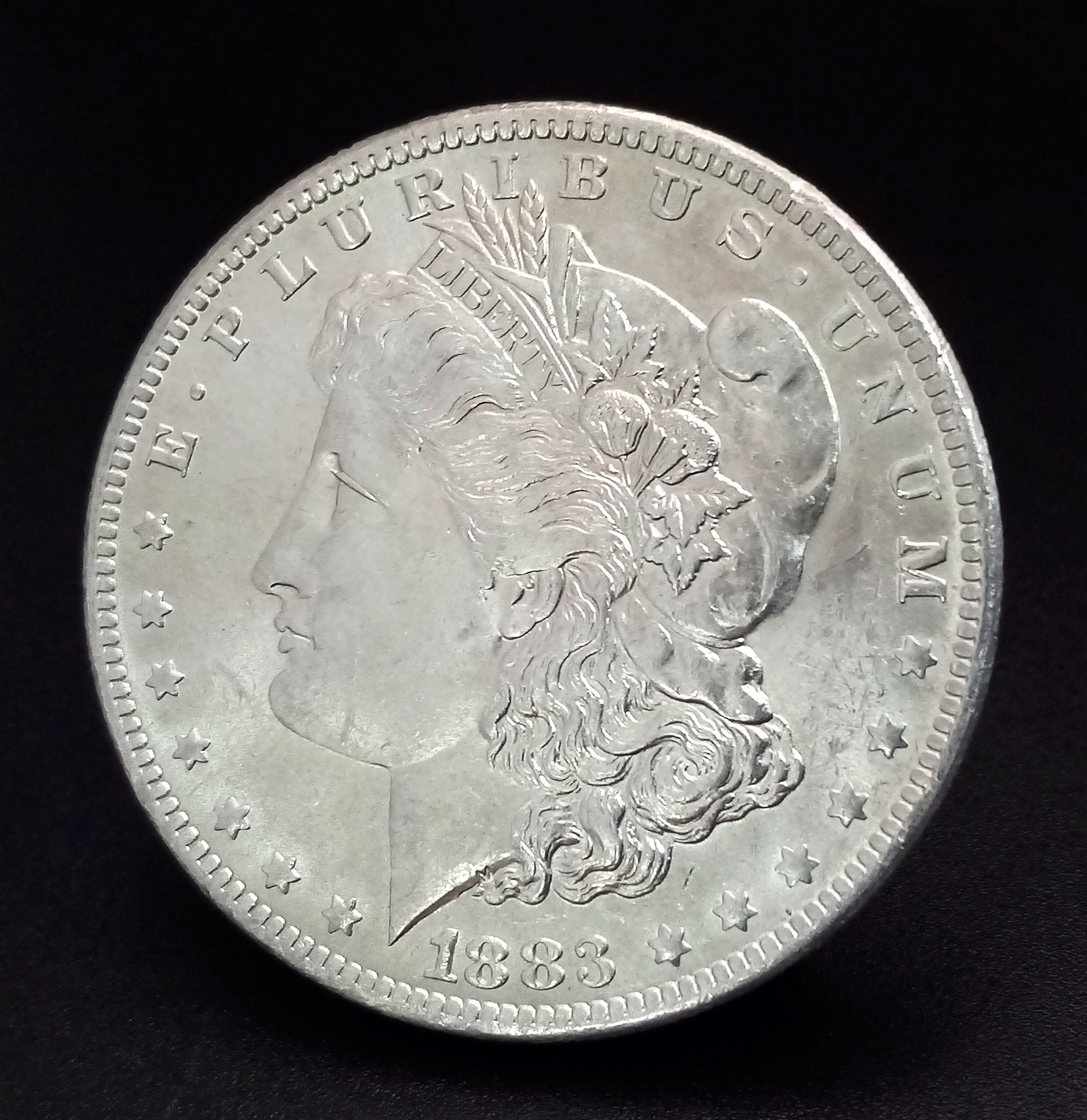 An 1883 Morgan Silver Dollar Coin. About UNC.