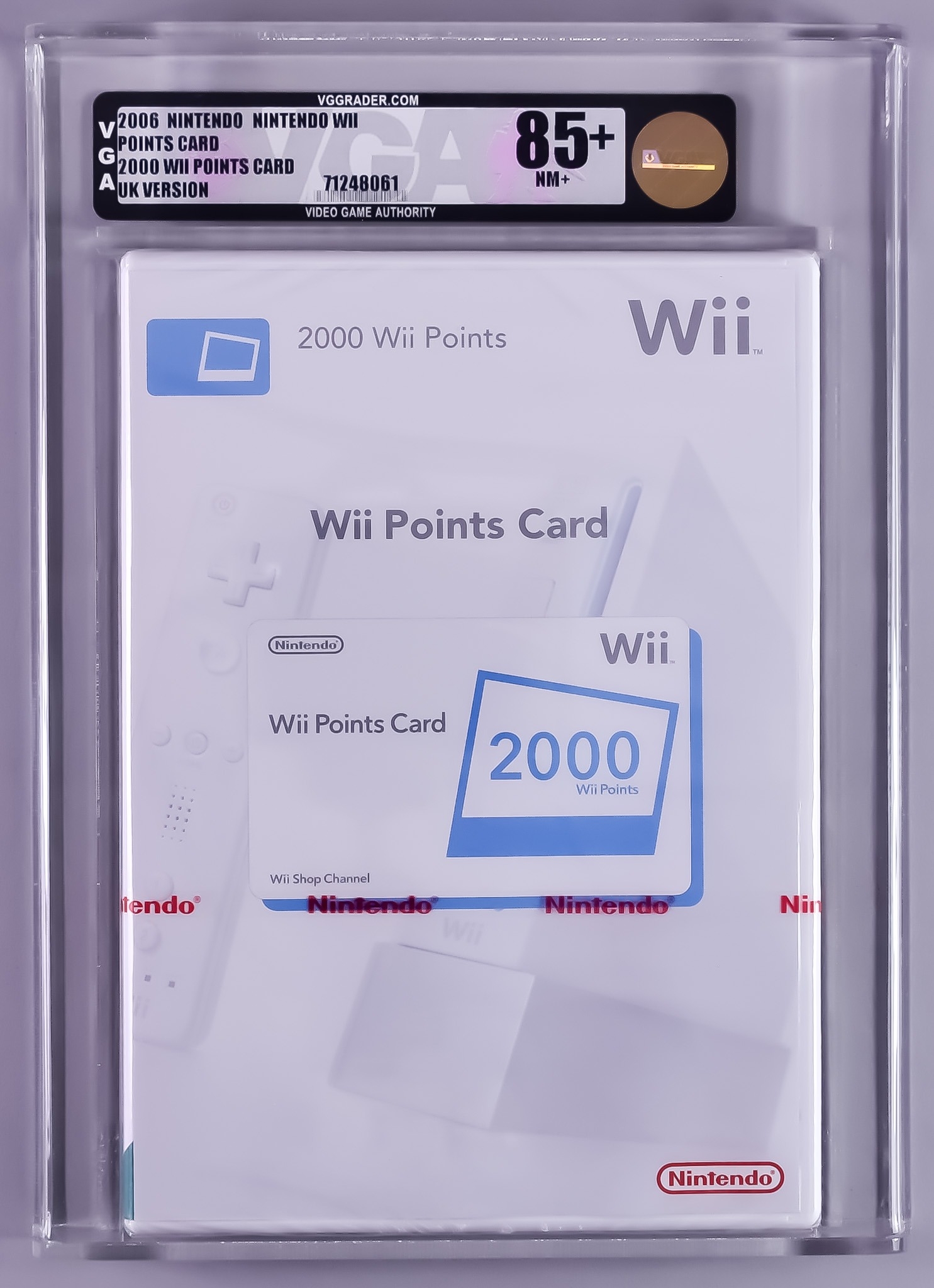 2006 Nintendo Wii – 2000 Wii Points Card – UK Version VGA 85+/NM+, with red Nintendo Strip seal, red label and in rigid Perspex case supplied by VGA at the time of grading
