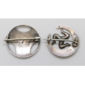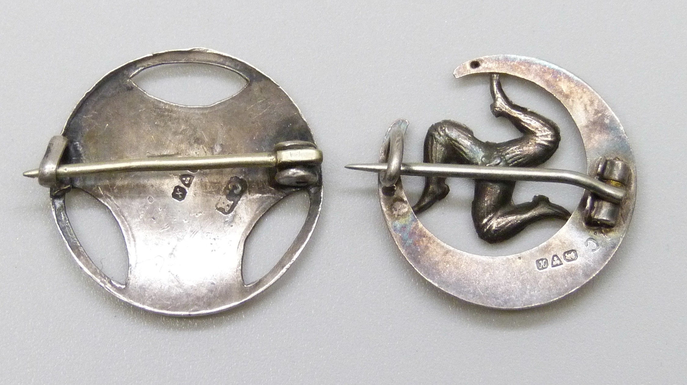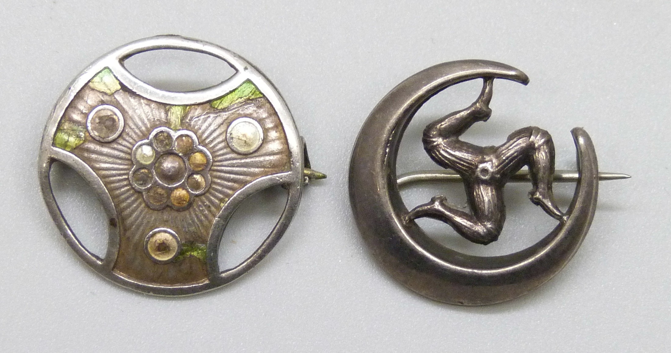 Charles Horner, a silver floral design brooch, lacking enamel, Chester, 1913, 2cm, and a silver Isle of Man triskelion brooch, possibly ALC, Chester, 1908