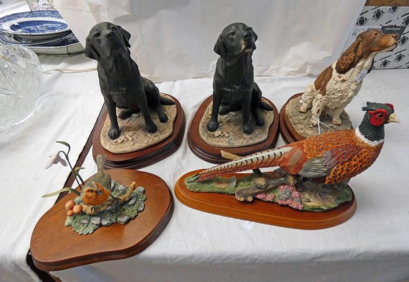 FIVE BORDER FINE ARTS FIGURES INCLUDING MT03B - ENGLISH SPRINGER SPANIEL, A1475 - PHEASANT, 2 X MTO1B - LABRADOR AND ROBIN