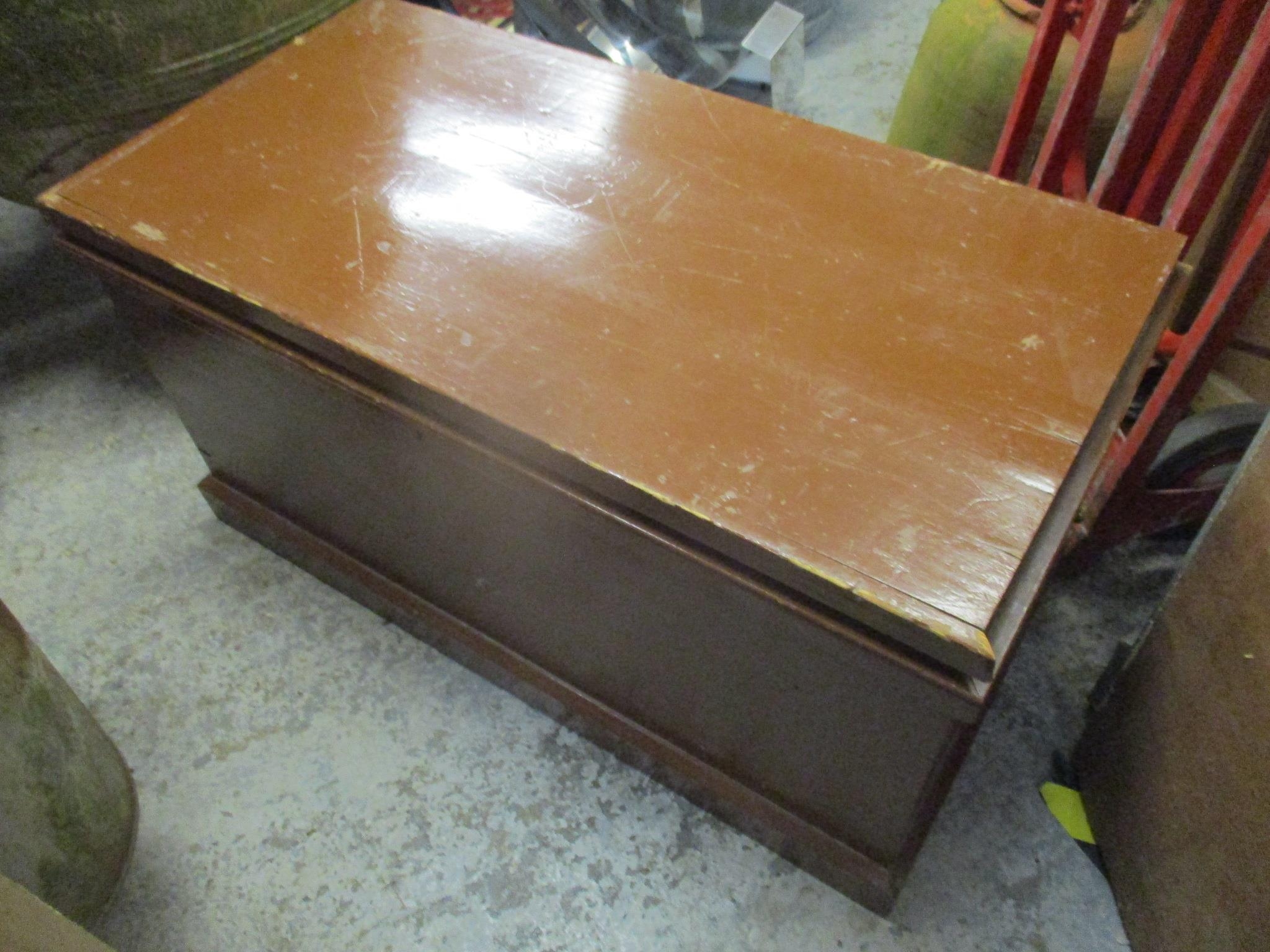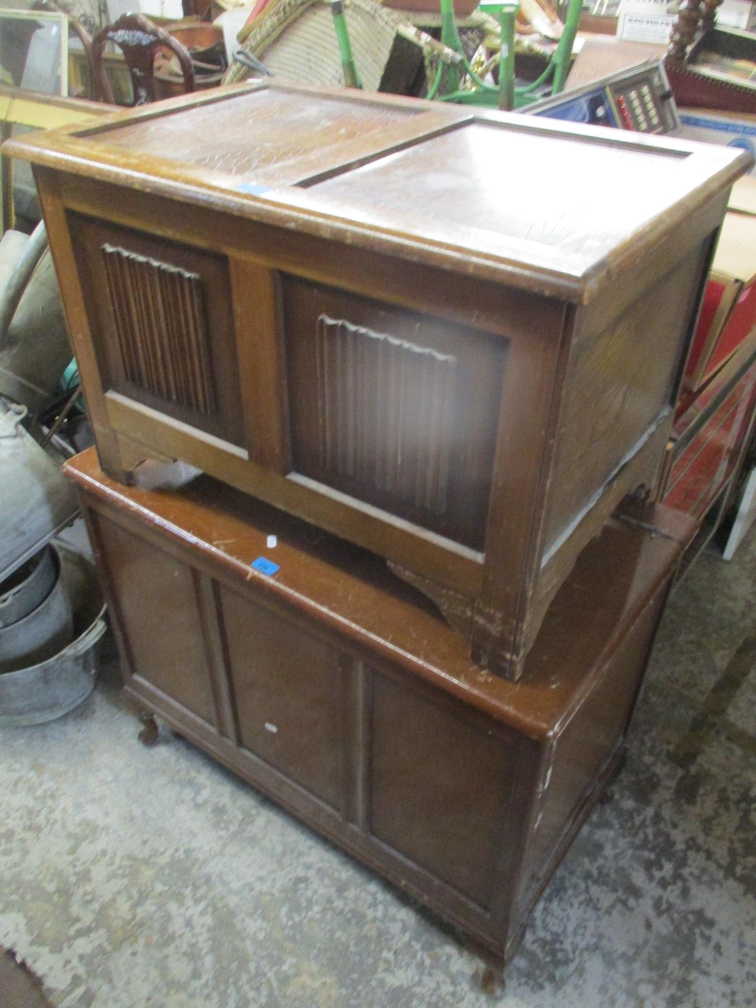 Two oak coffers to include a mid 20th century oak example with linenfold decoration 52.5cm h x 78.5cm w, together with a pine twin handled trunk
