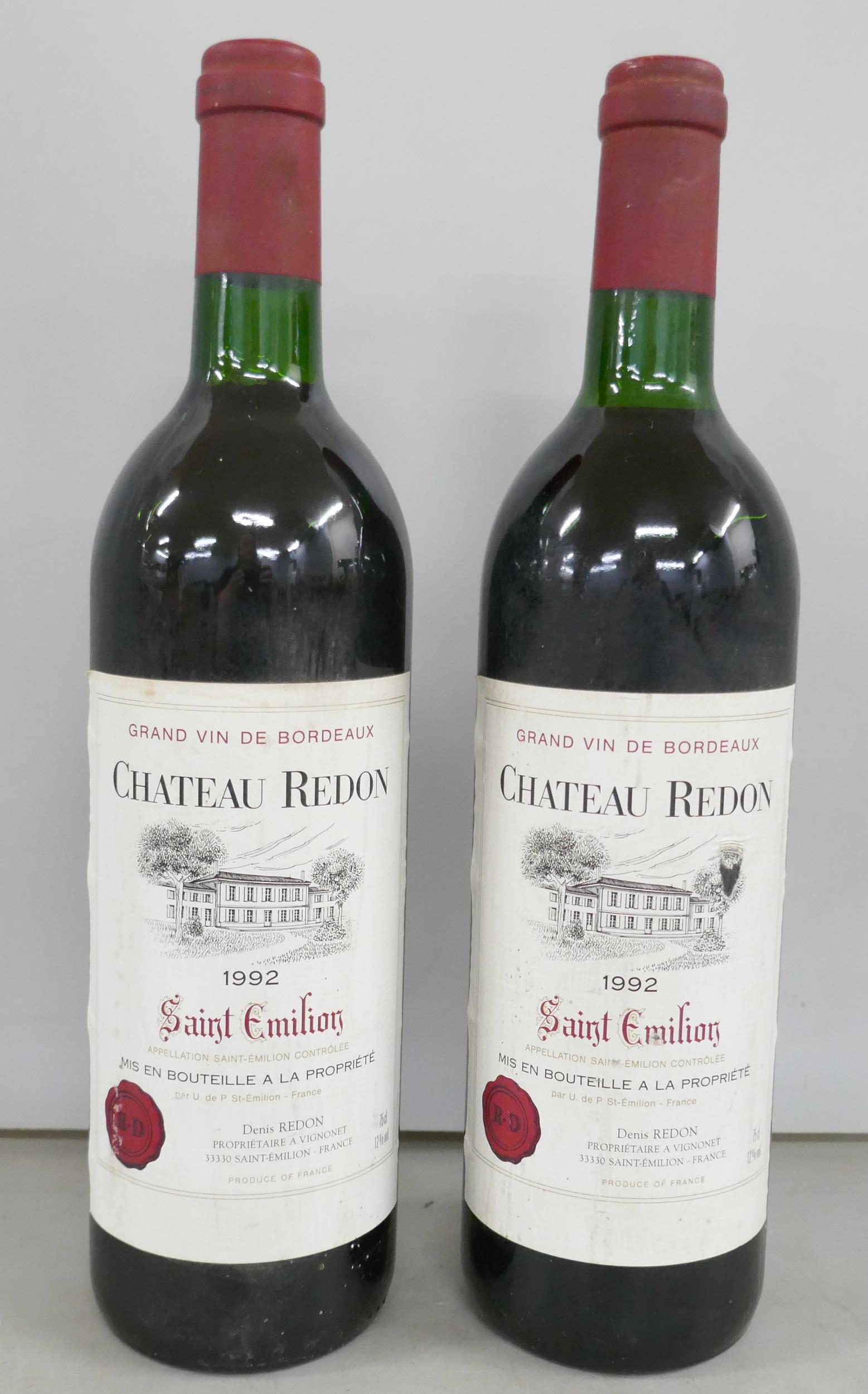 Two bottles of red wine, Chateau Redon 1992 Saint Emilion