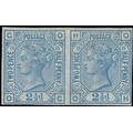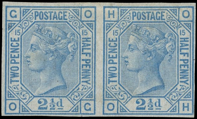 1880 2½d Blue Colour Trial Pl.15 (Wmk. Orb upright). Very fine unused o.g. imperforate horizontal pair (close at right) lettered OG-OH, printed in a distinctly paler greenish-blue shade compared to the issued colour. Scarce. SG142. Cat. £8000
