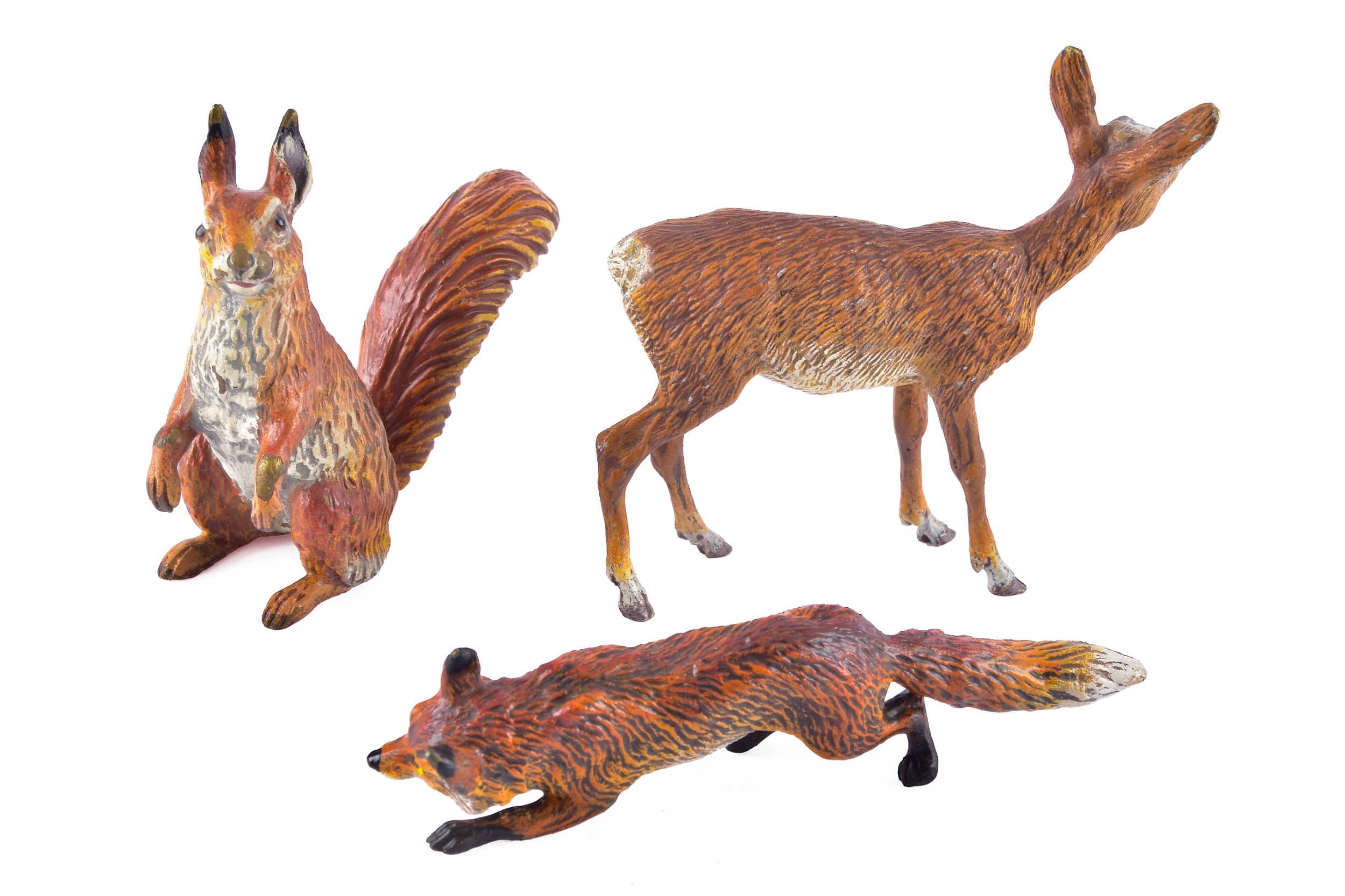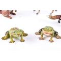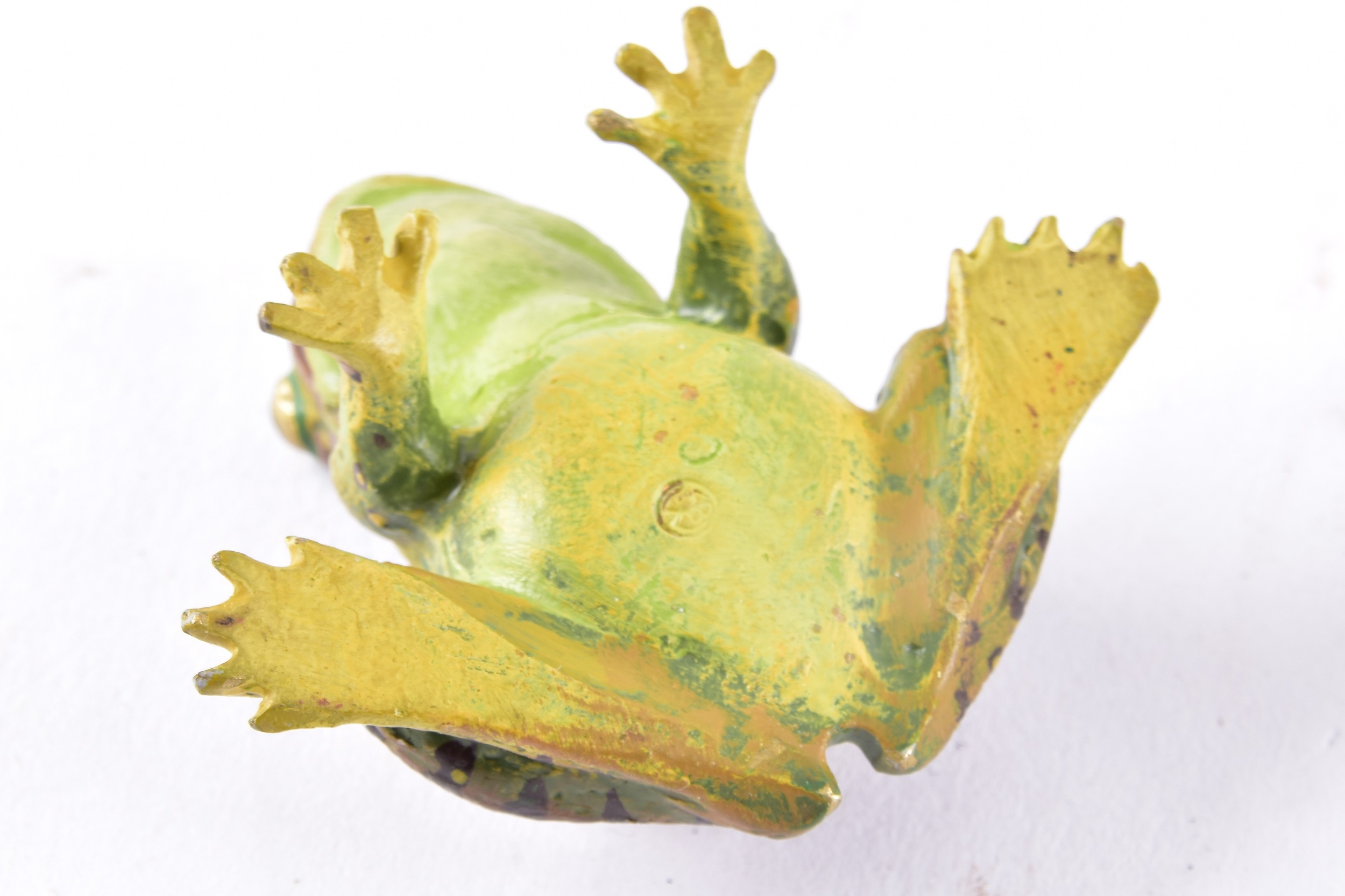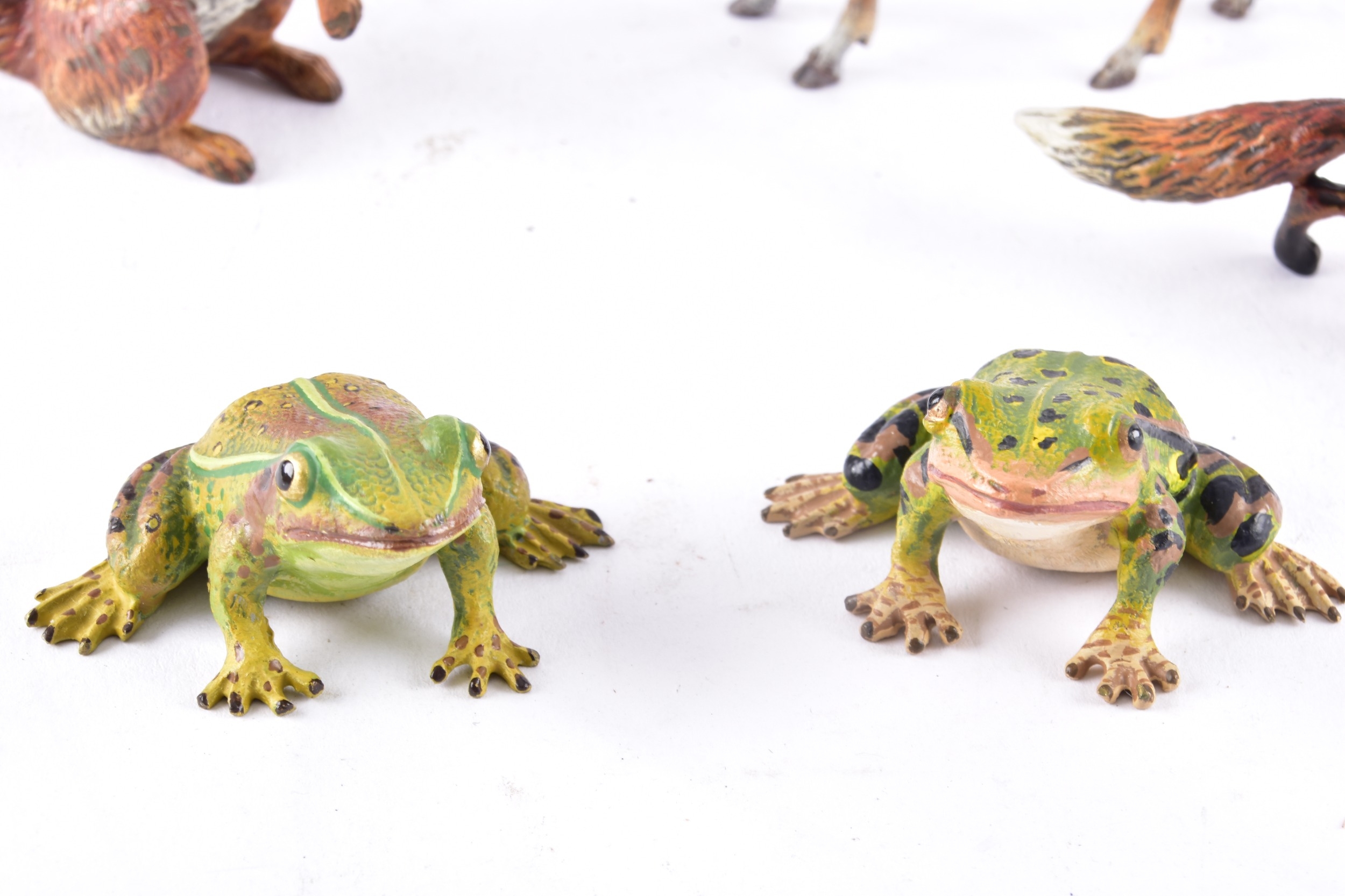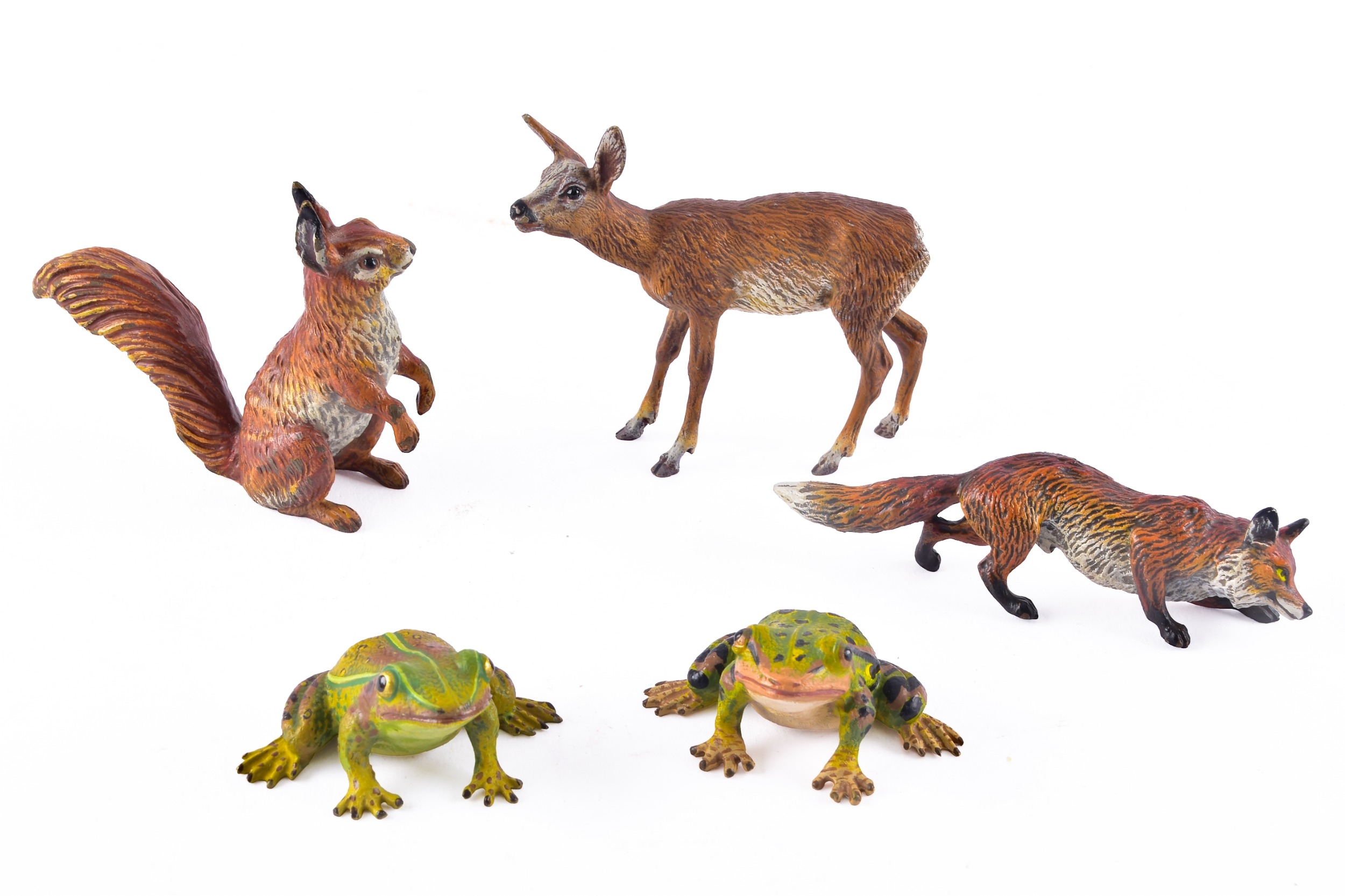 A collection of Mappin & Webb bronze animals, including a pair of bronze frogs, together with a bronze deer, fox and squirrel, largest 7 x 7.5 cm (deer).