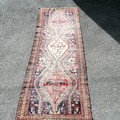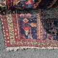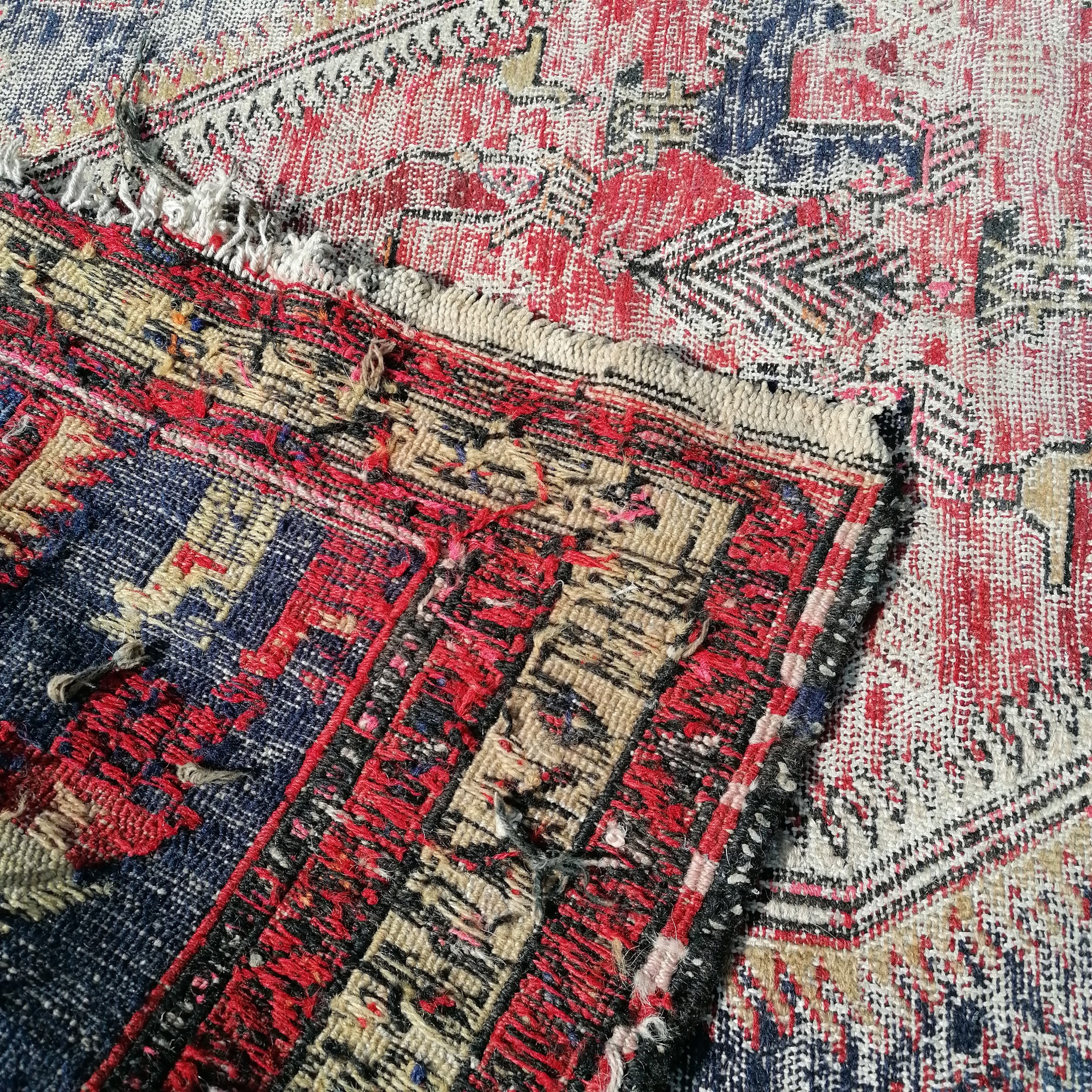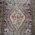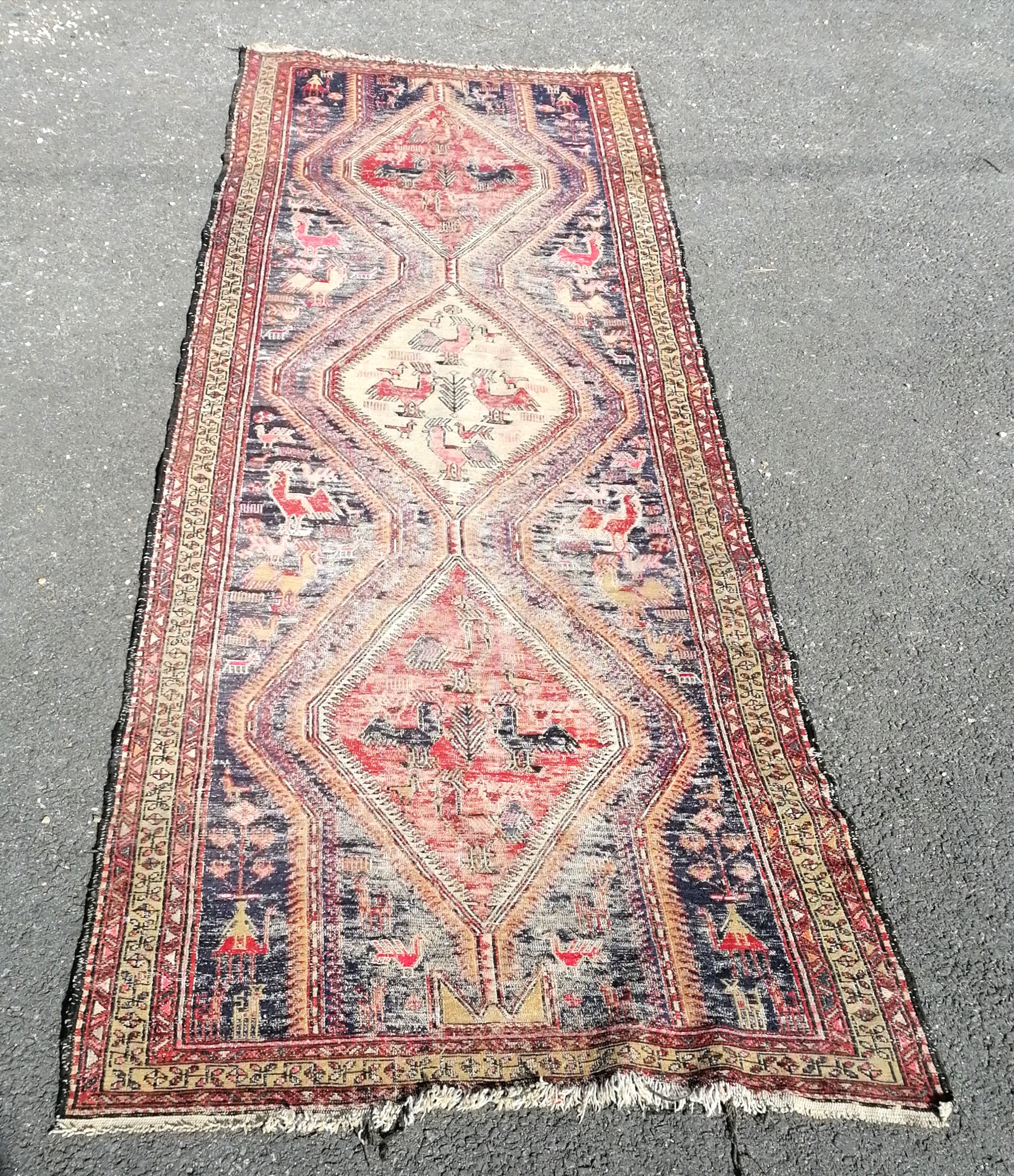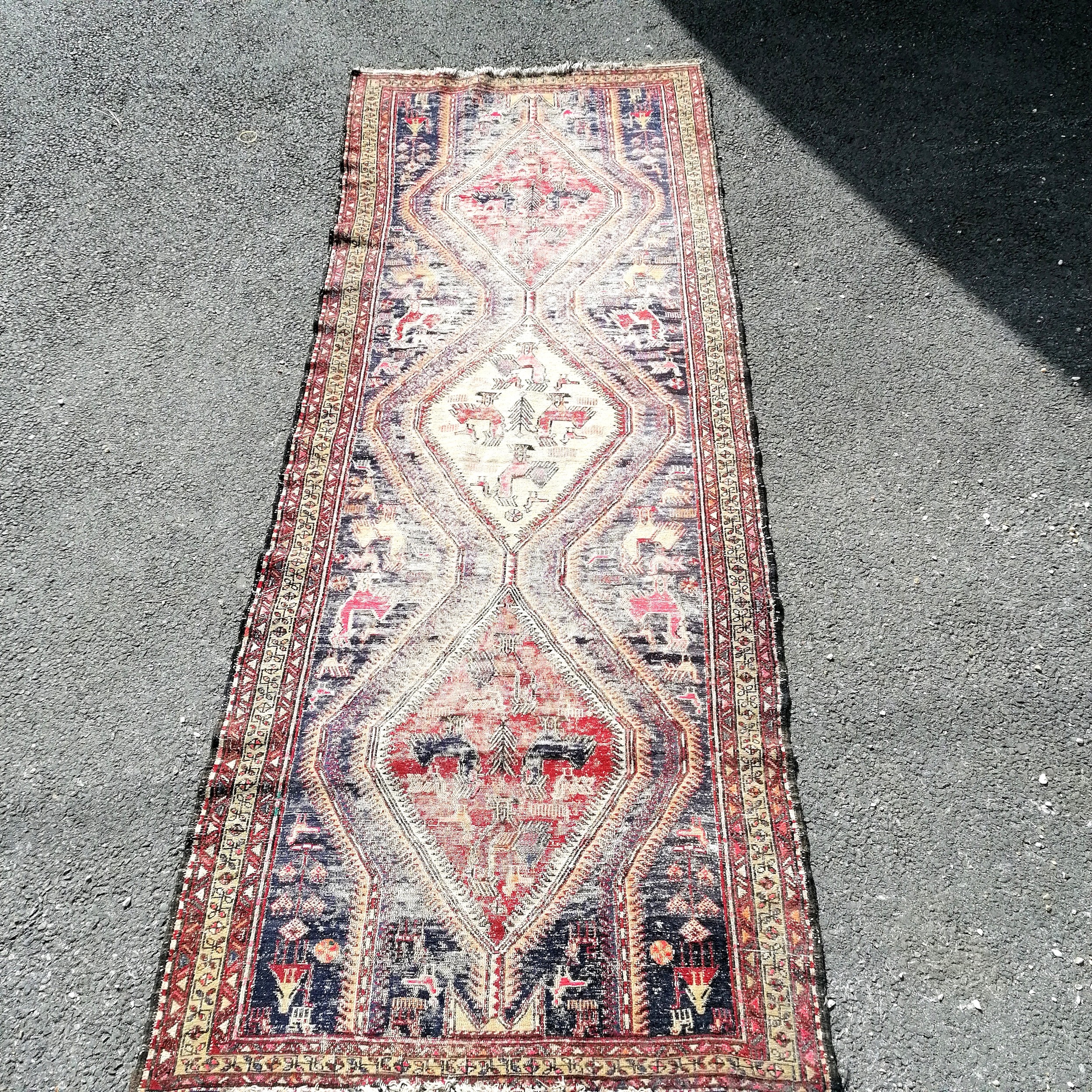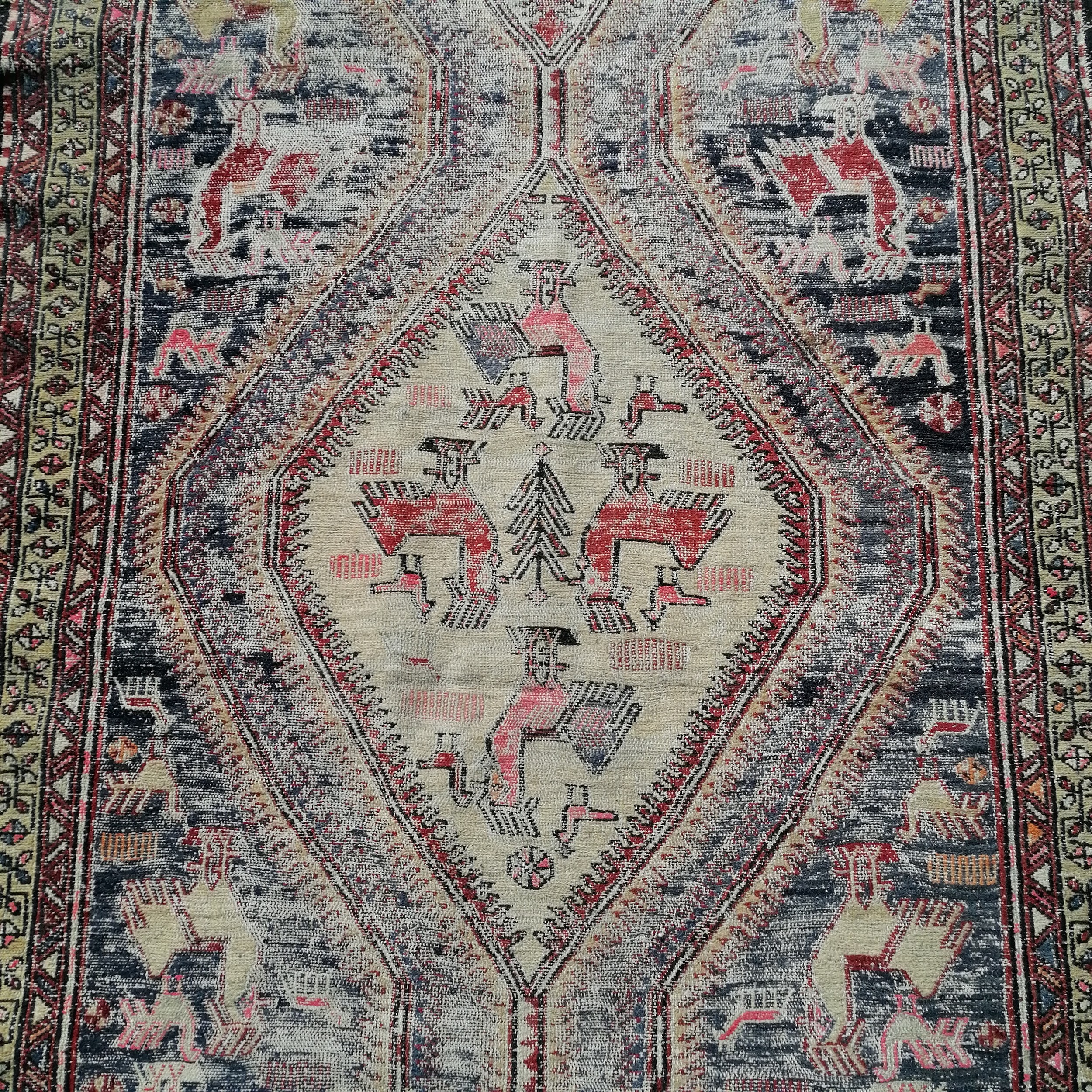 Antique blue grounded wool rug with animal and figural detail 305cm x 115cm - has obvious wear