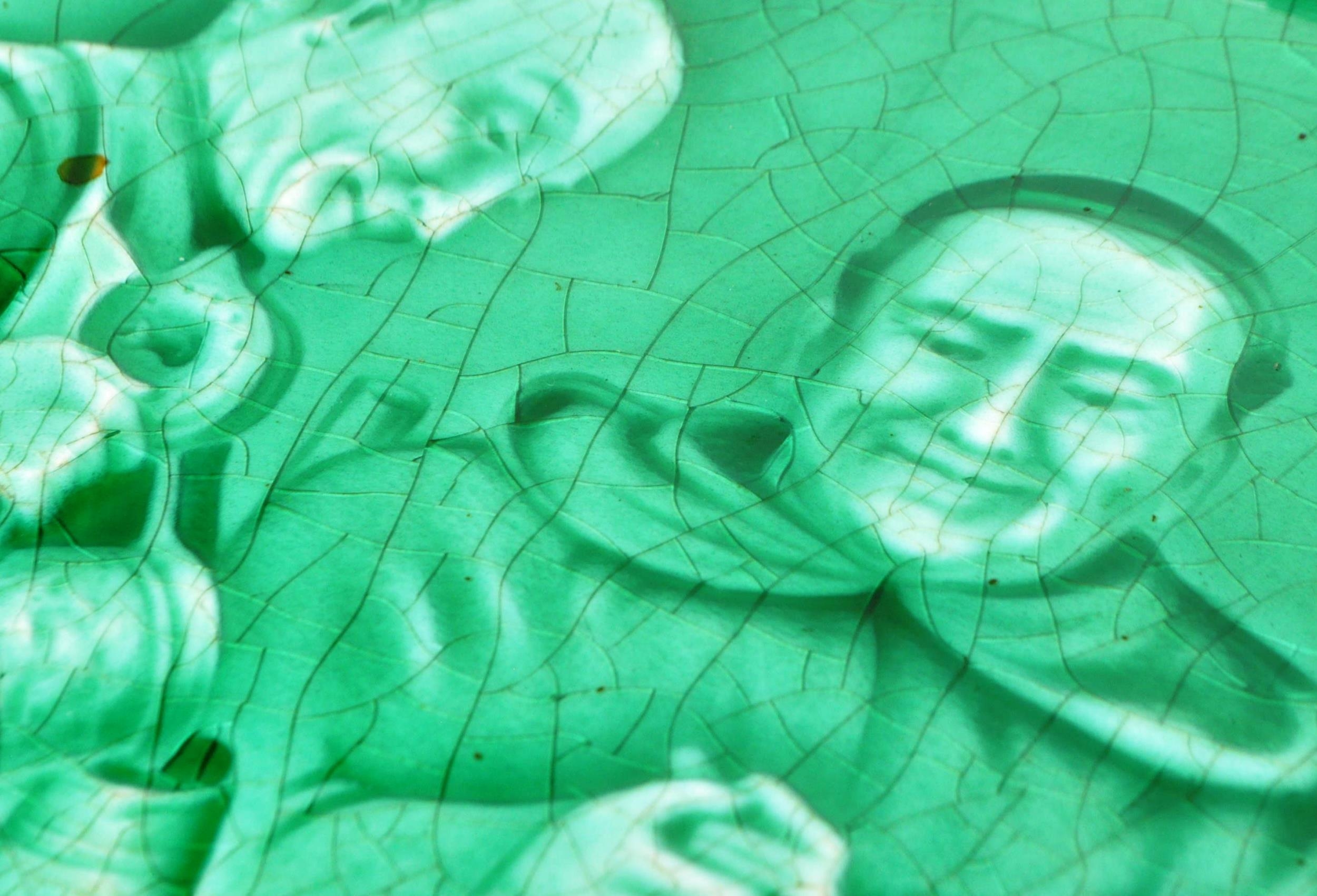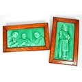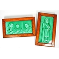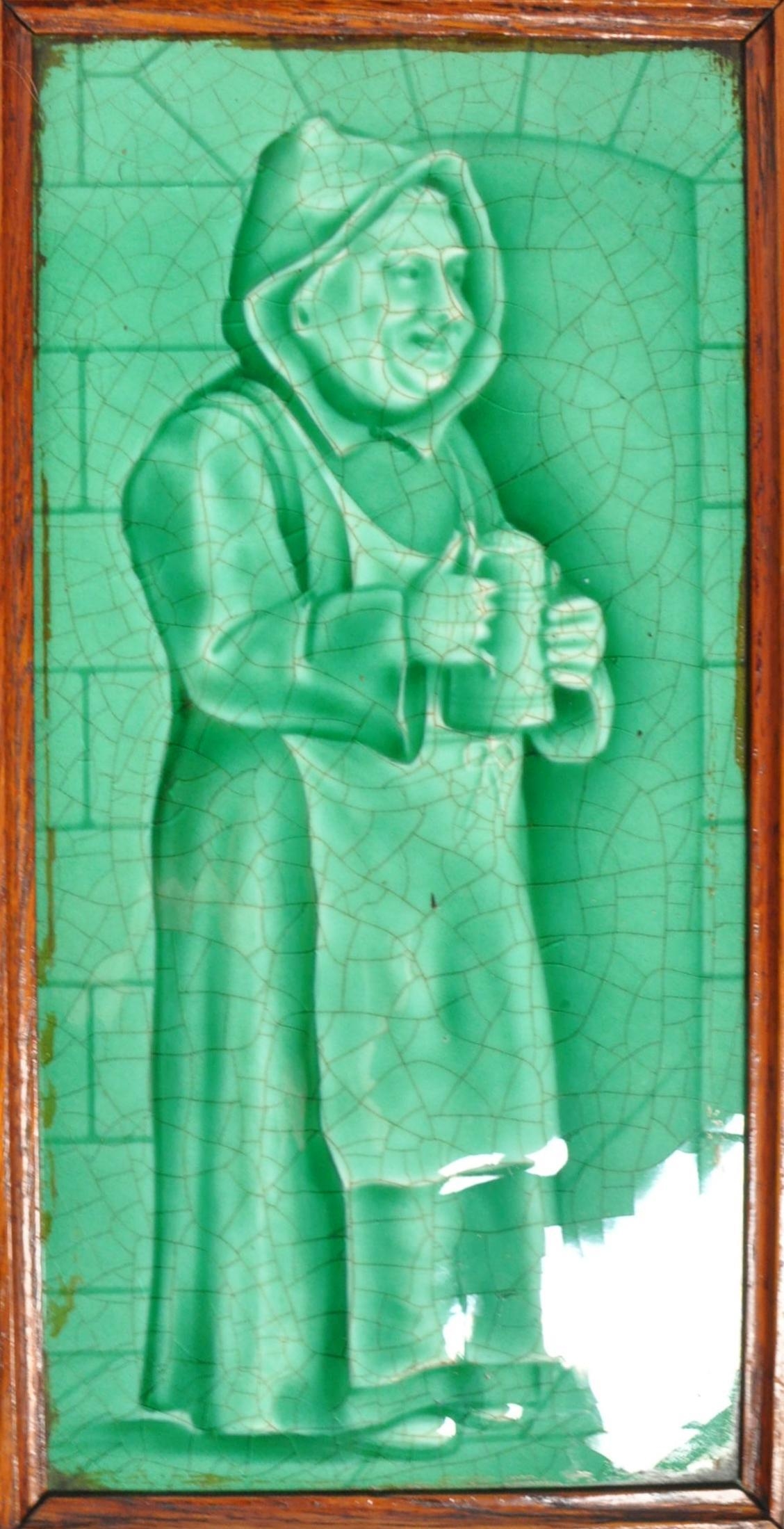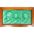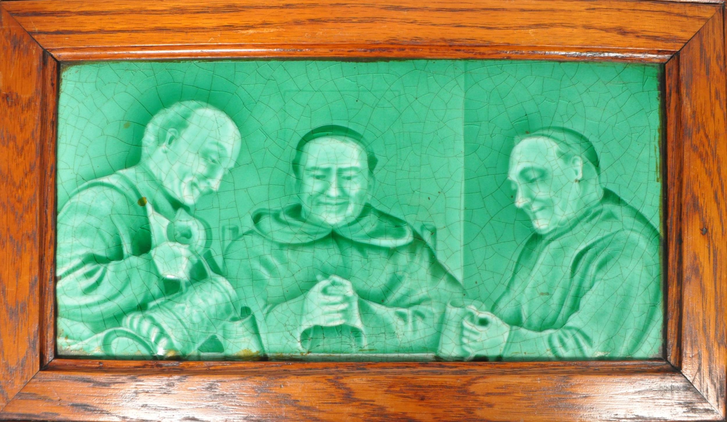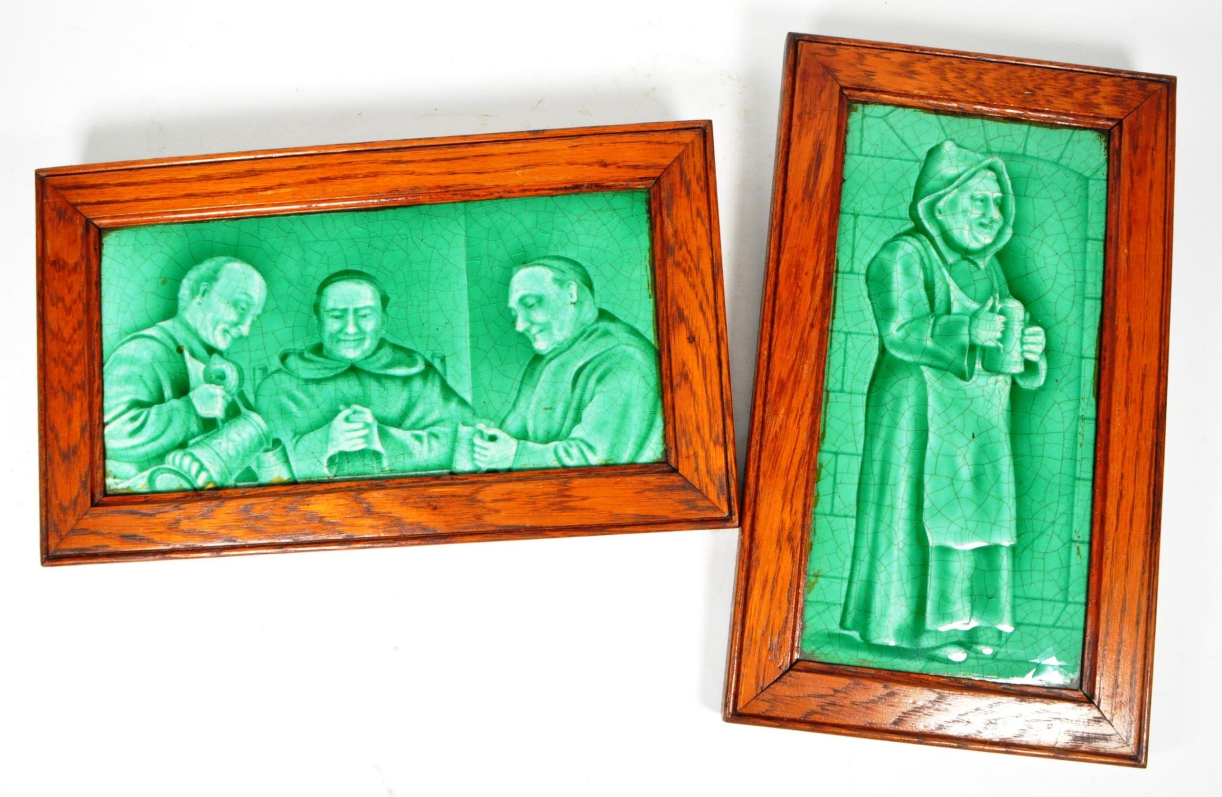 Sherwin & Cotton - Two early 20th century Sherwin and Cotton glazed tiles. The tiles each depicting monks, featuring green glaze. Each in oak wood frame.