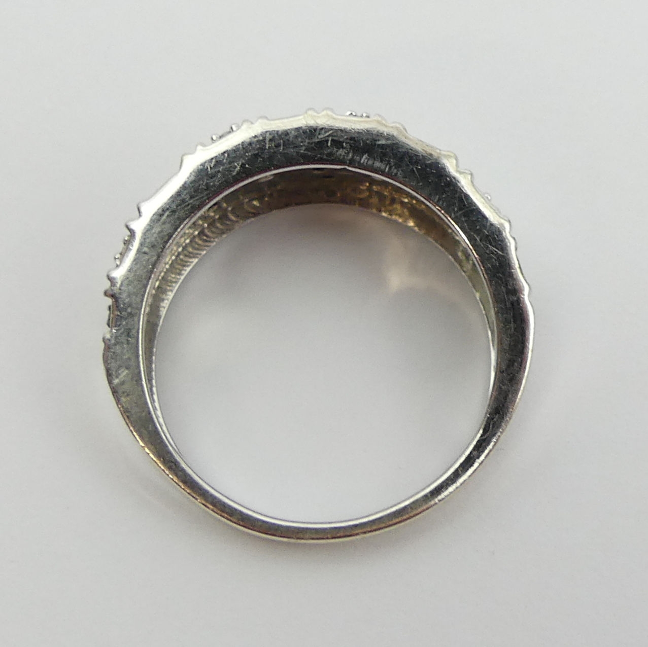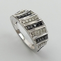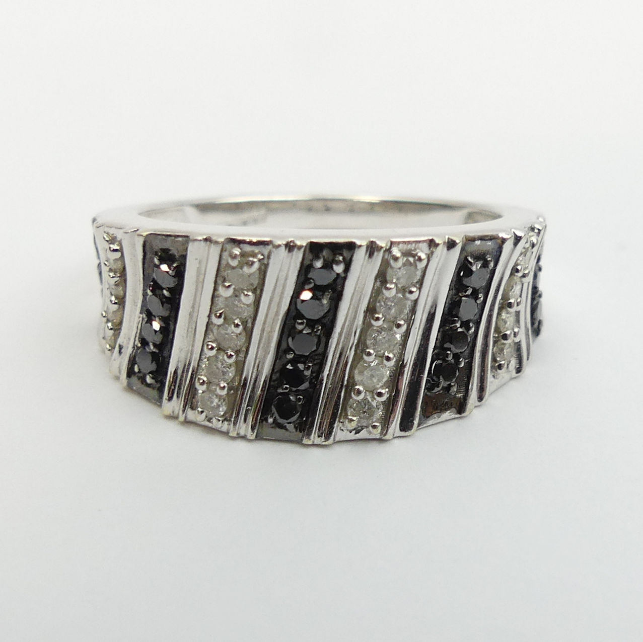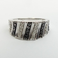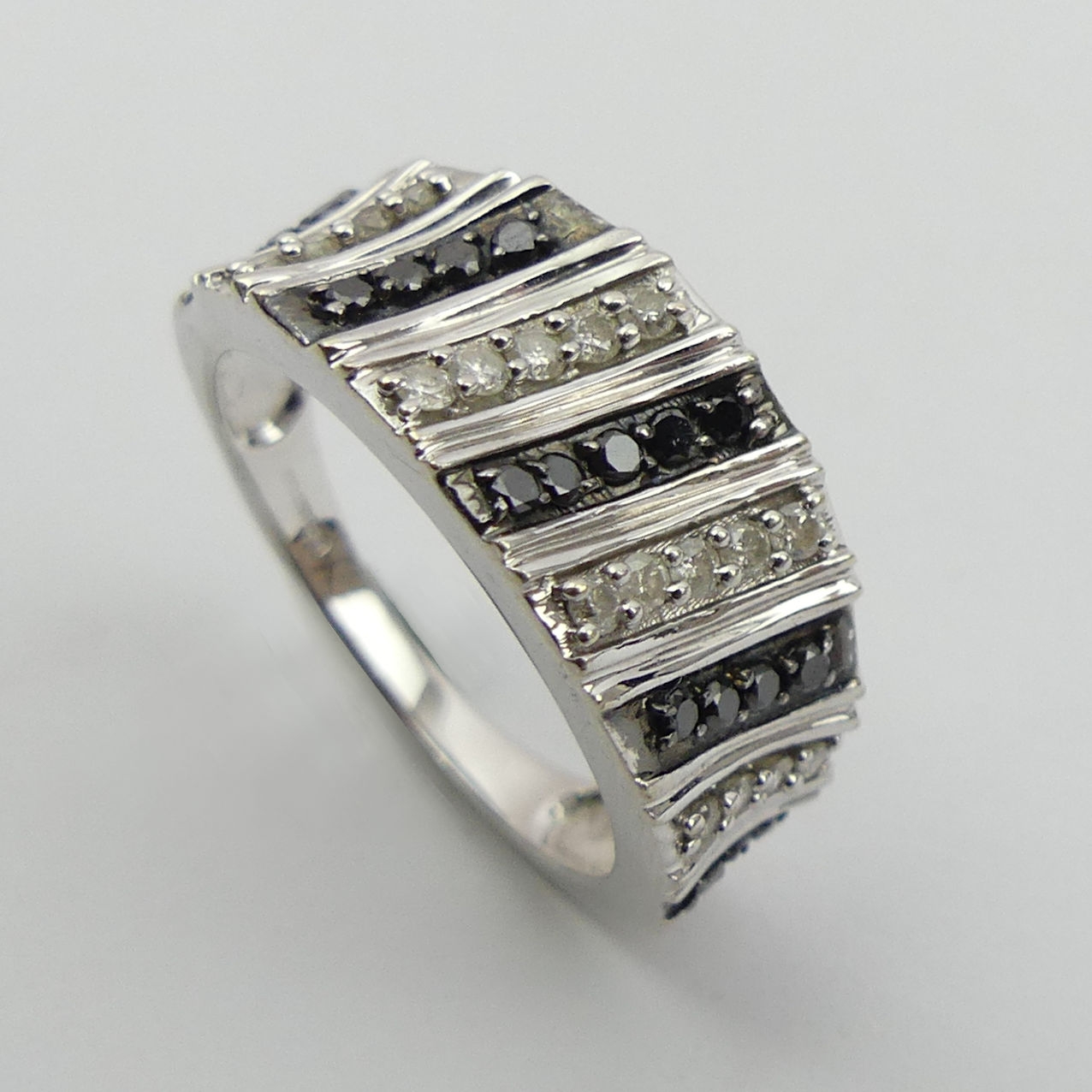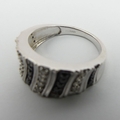 9ct gold black and white diamond set ring, 4.1 grams. Size N, 9 mm wide. UK Postage £12.
