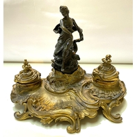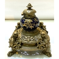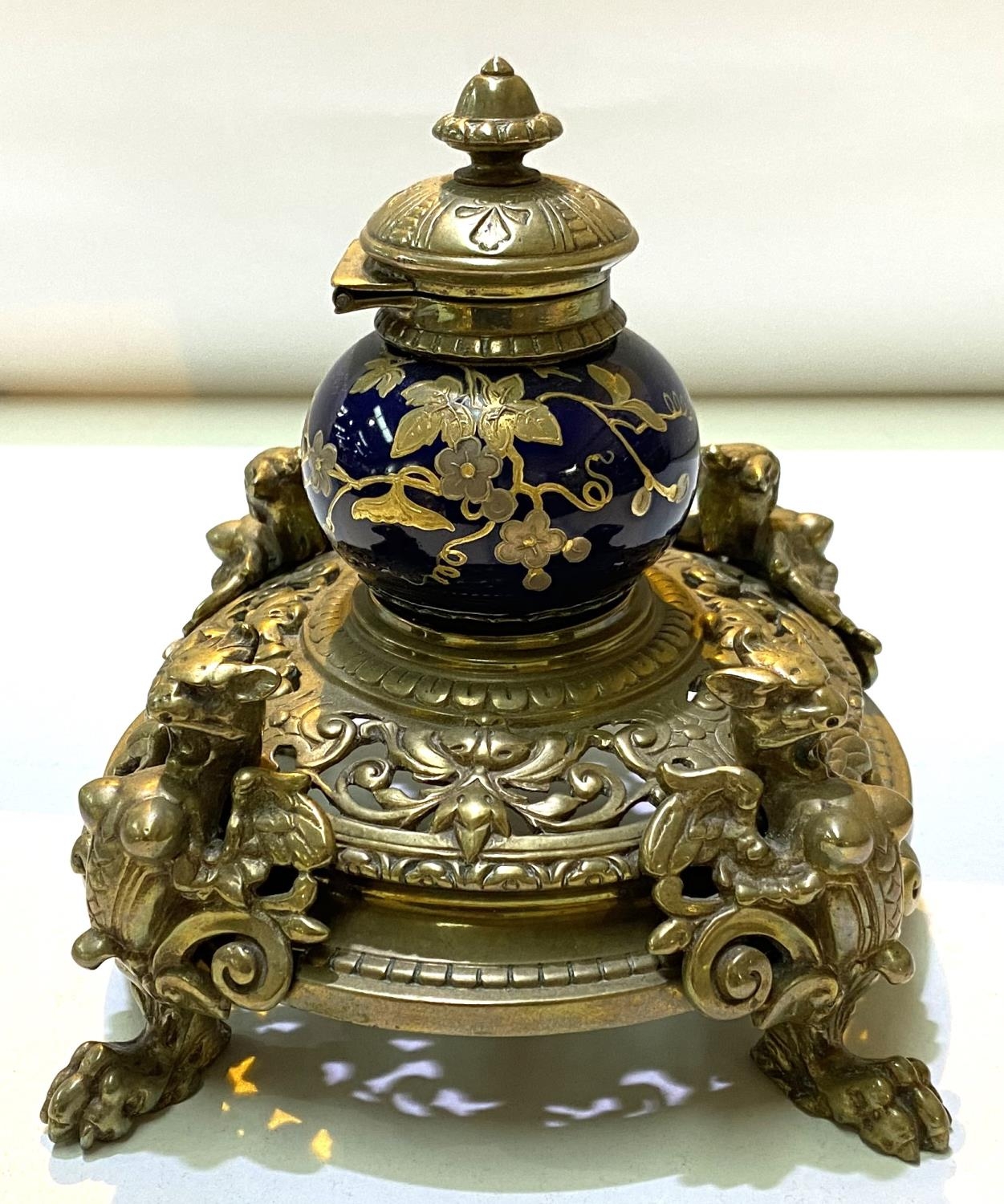 A French brass and ceramic inkwell, blue ground with gilt highlights, mythical beasts to each corner