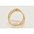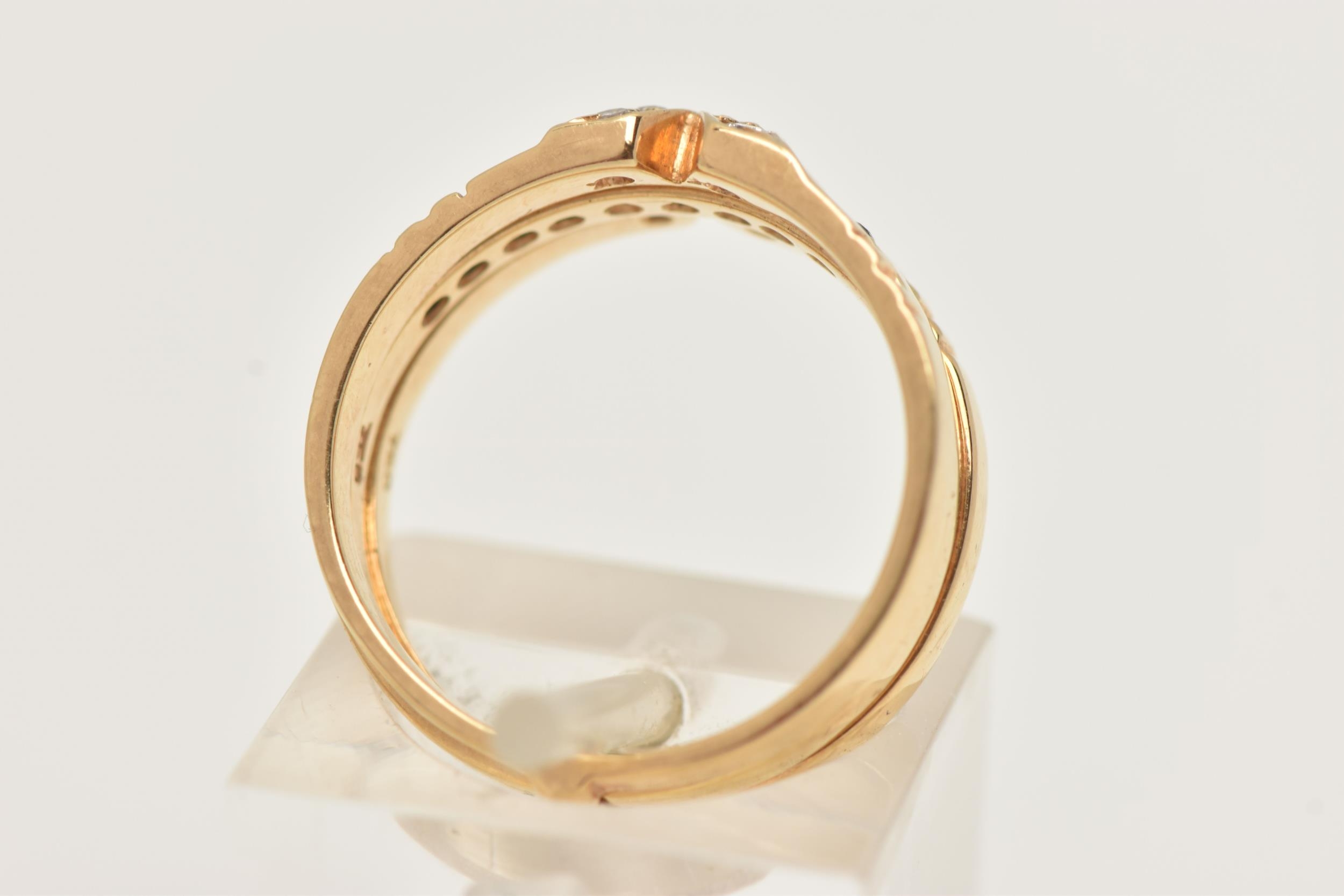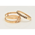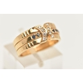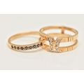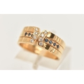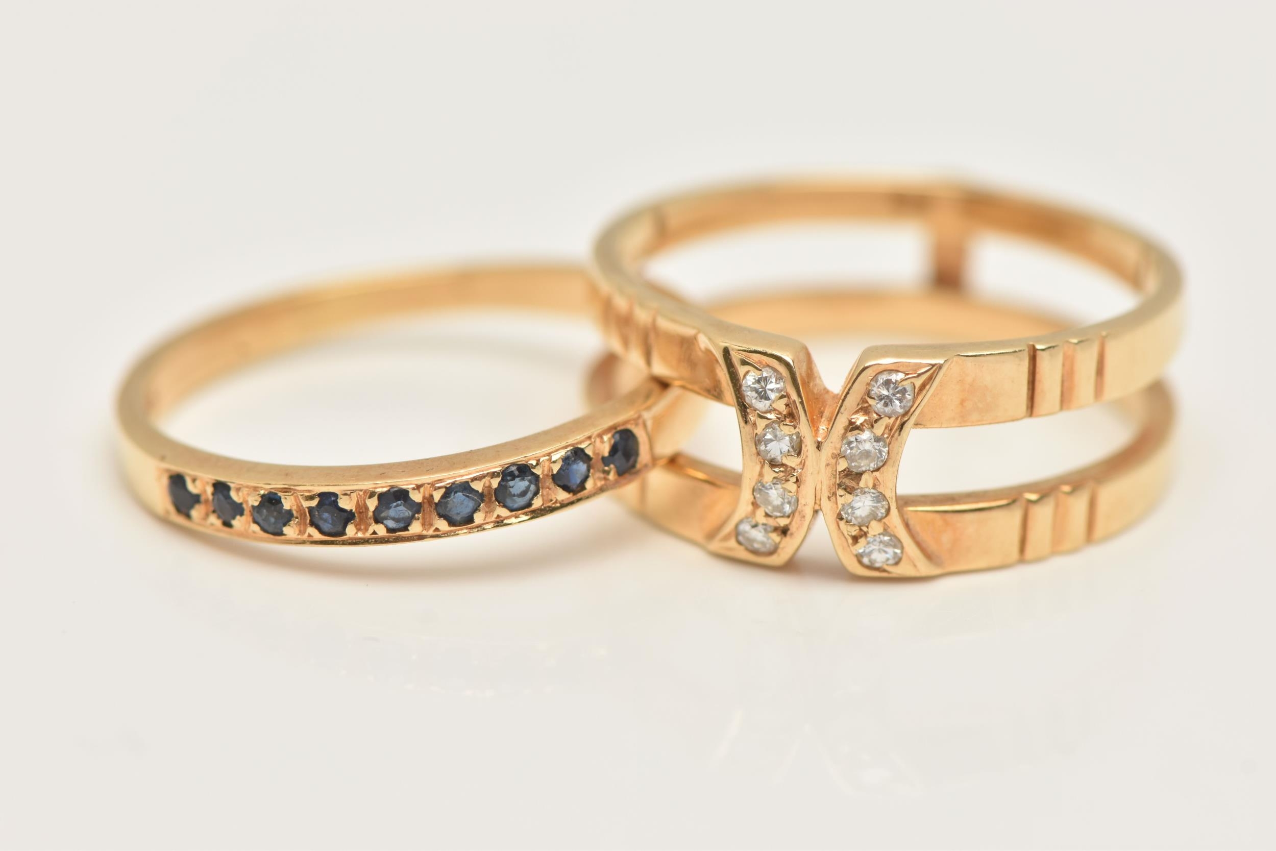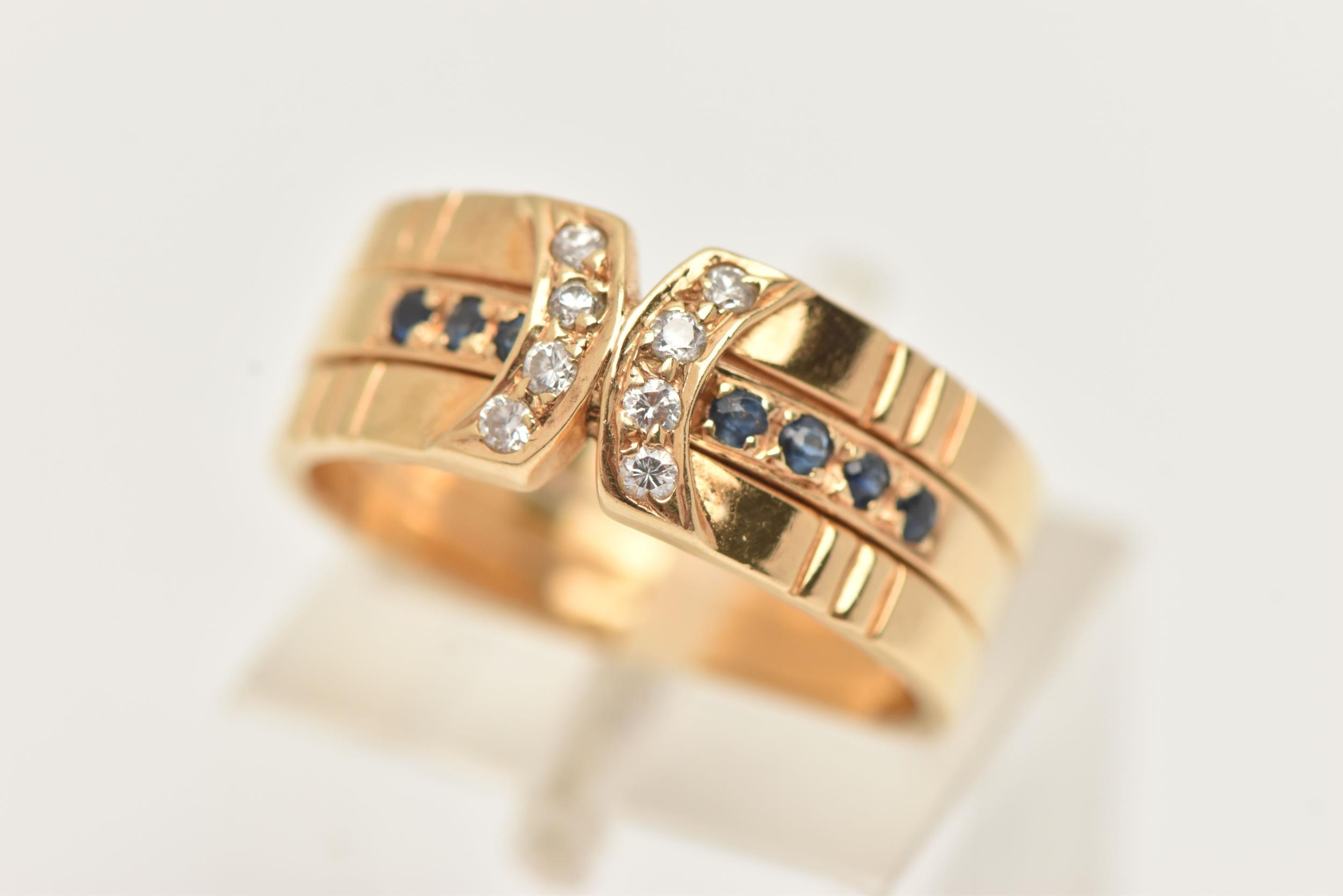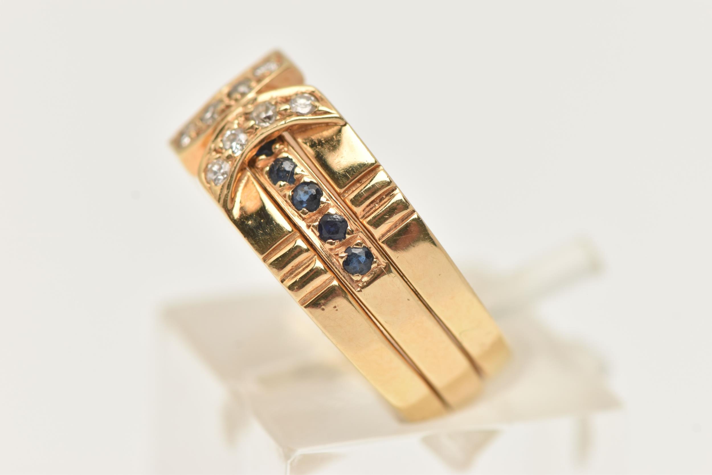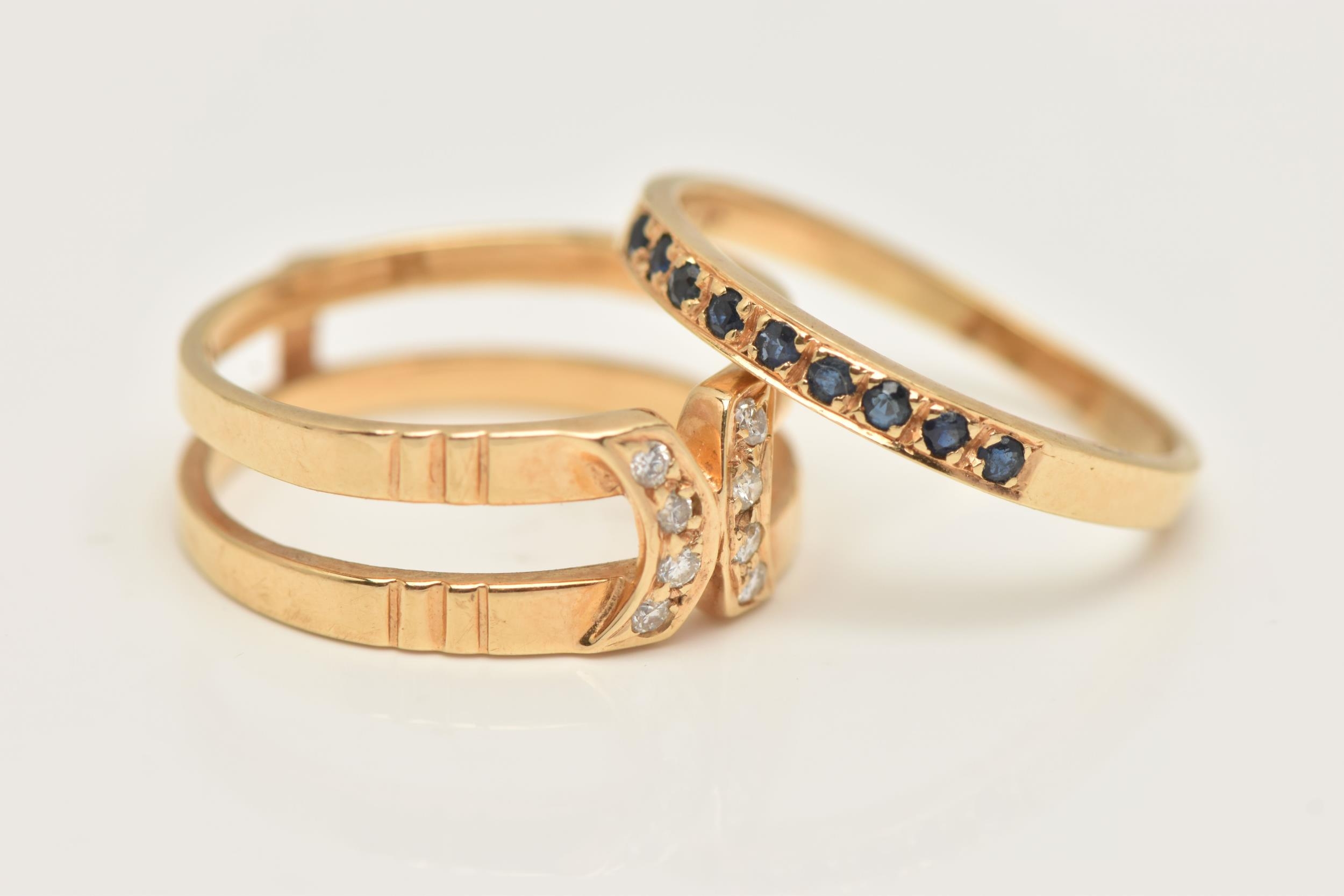 A YELLOW METAL DIAMOND AND SAPPHIRE SET RING, three bands with the centre able to rotate set with a row of small circular cut blue sapphires, between to polished bands, with two curved rows of diamonds, stamped 18k 750, ring size leading edge L, approximate gross weight 5.9 grams (condition report: general light wear, the middle ring can be removed and both can be worn as two separate rings)