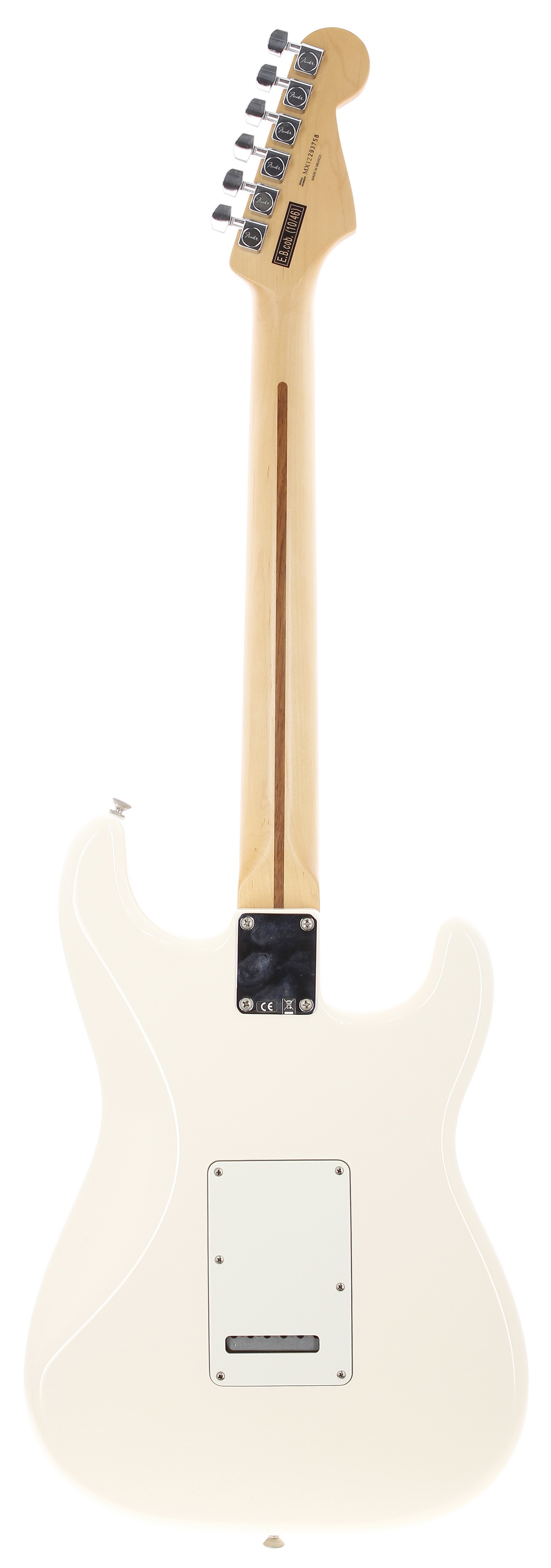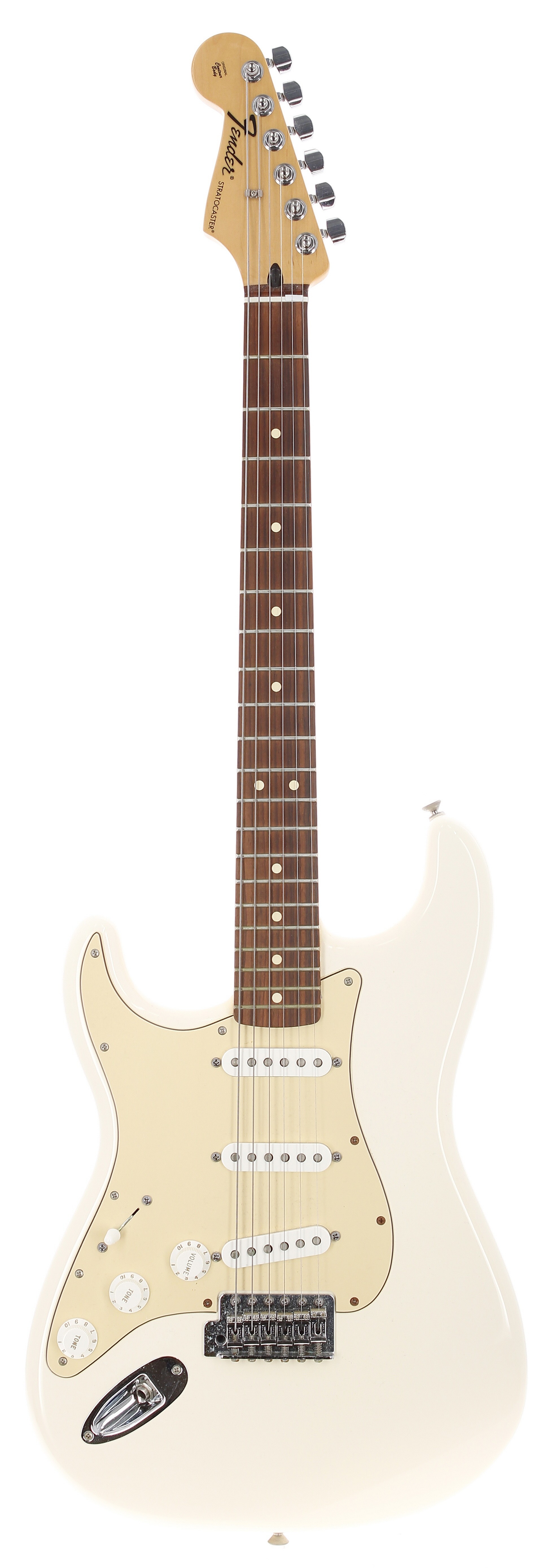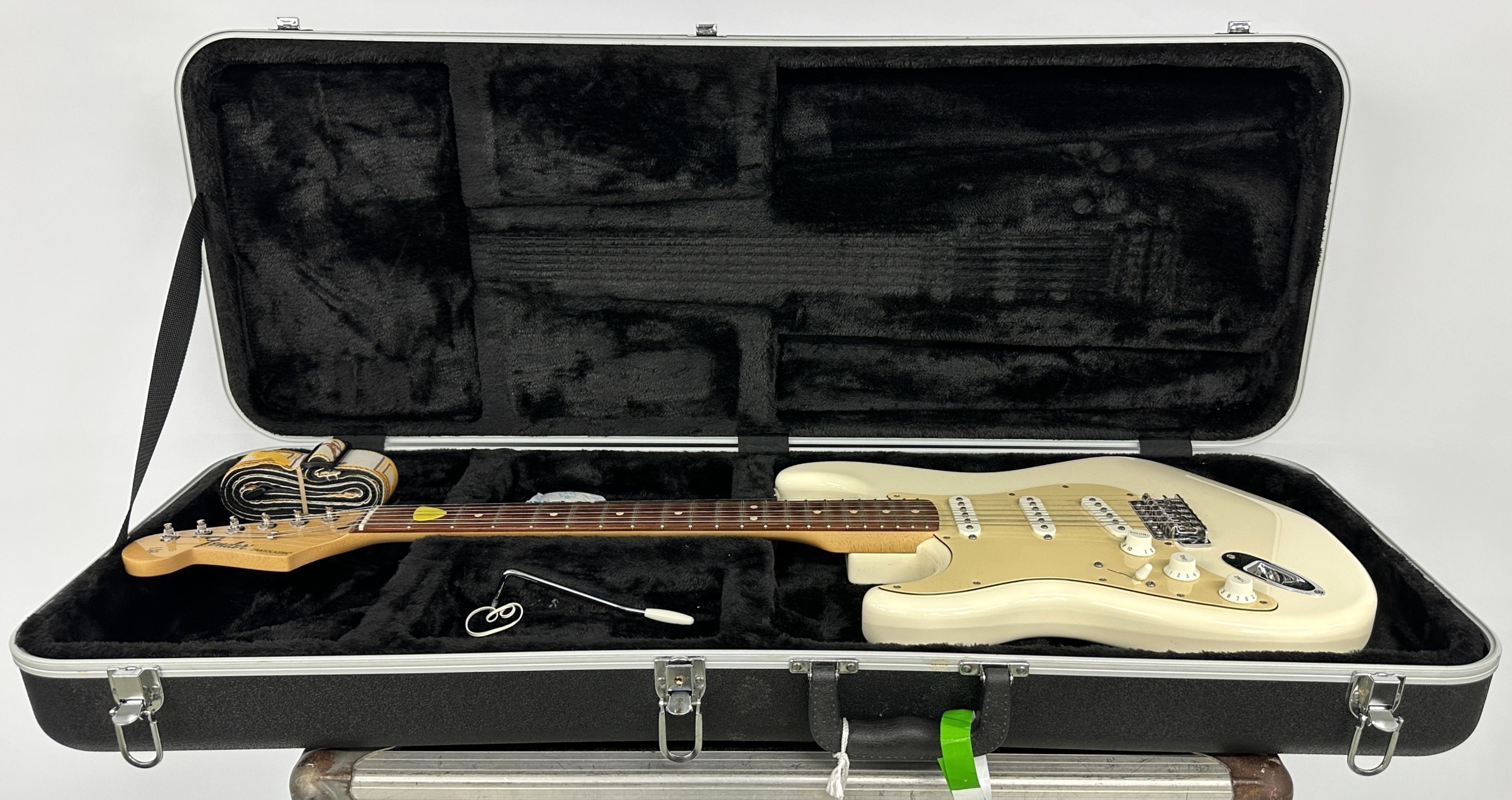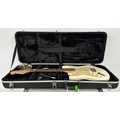 2012 Fender Standard Stratocaster left-handed electric guitar, made in Mexico; Body: Arctic white finished alder; Neck: maple; Fretboard: rosewood; Frets: good, some oxidisation to upper frets; Electrics: working; Hardware: off-white three-ply guard installed, some rusting to smaller metal screws; Case: hard case; Weight: 3.68kg; Overall condition: good