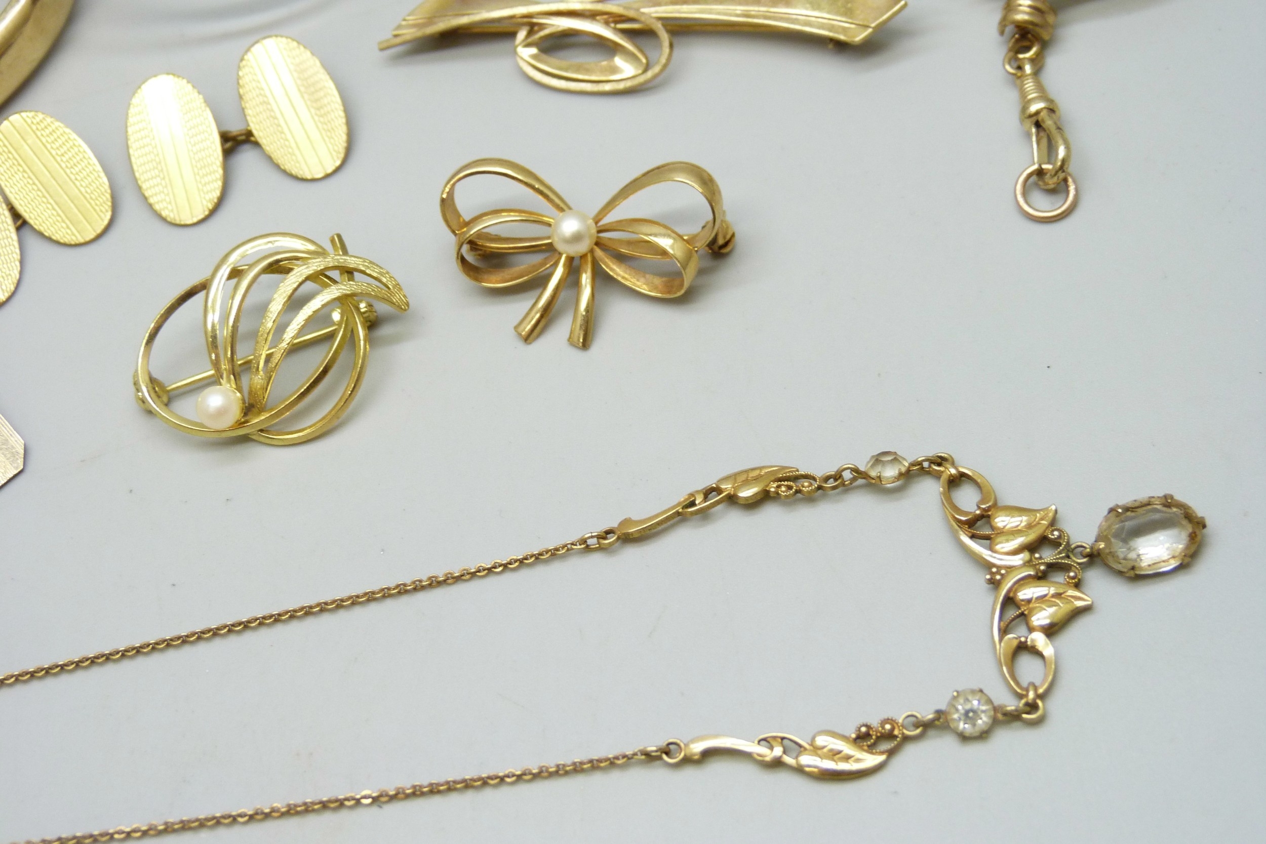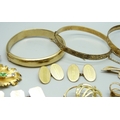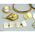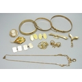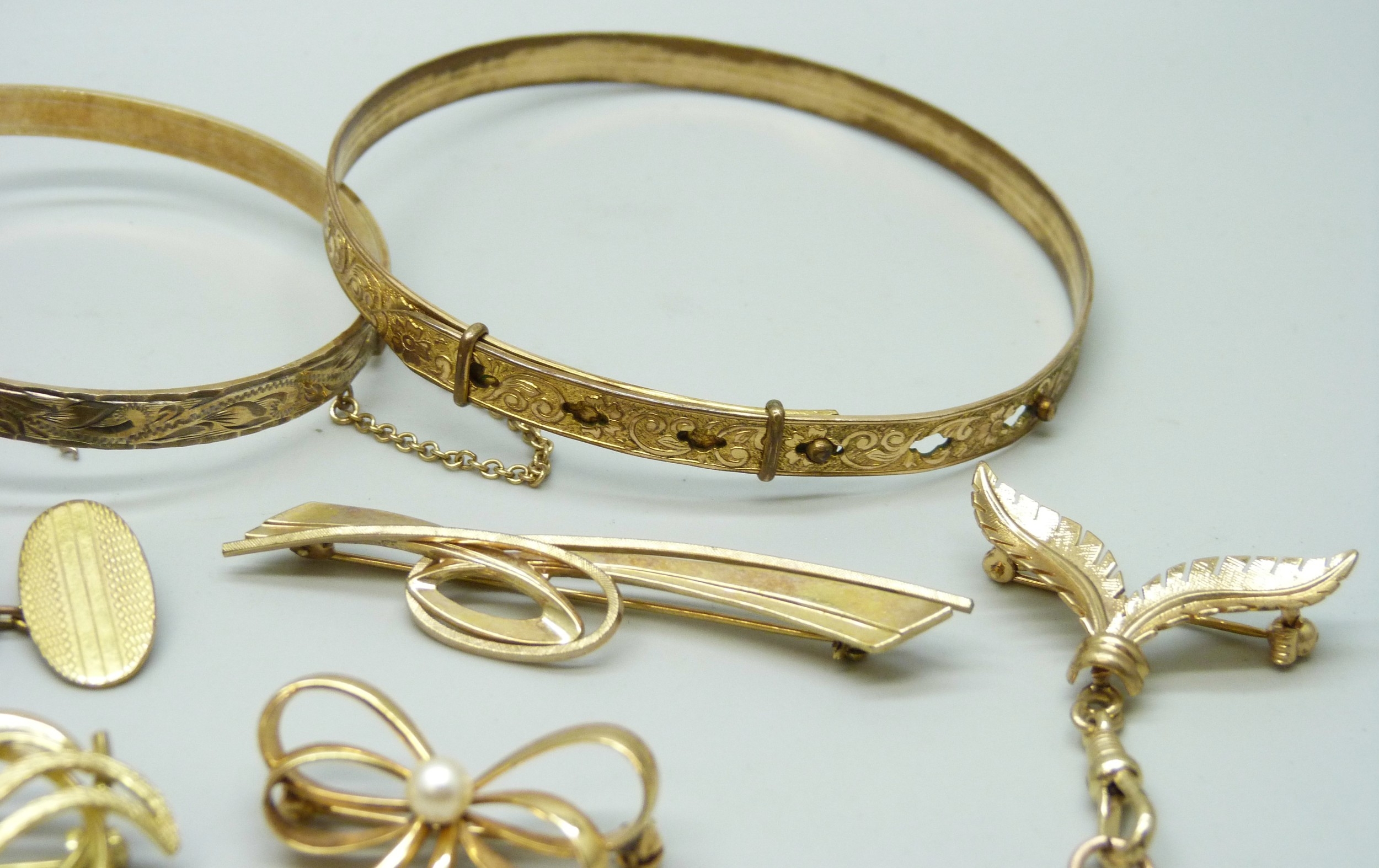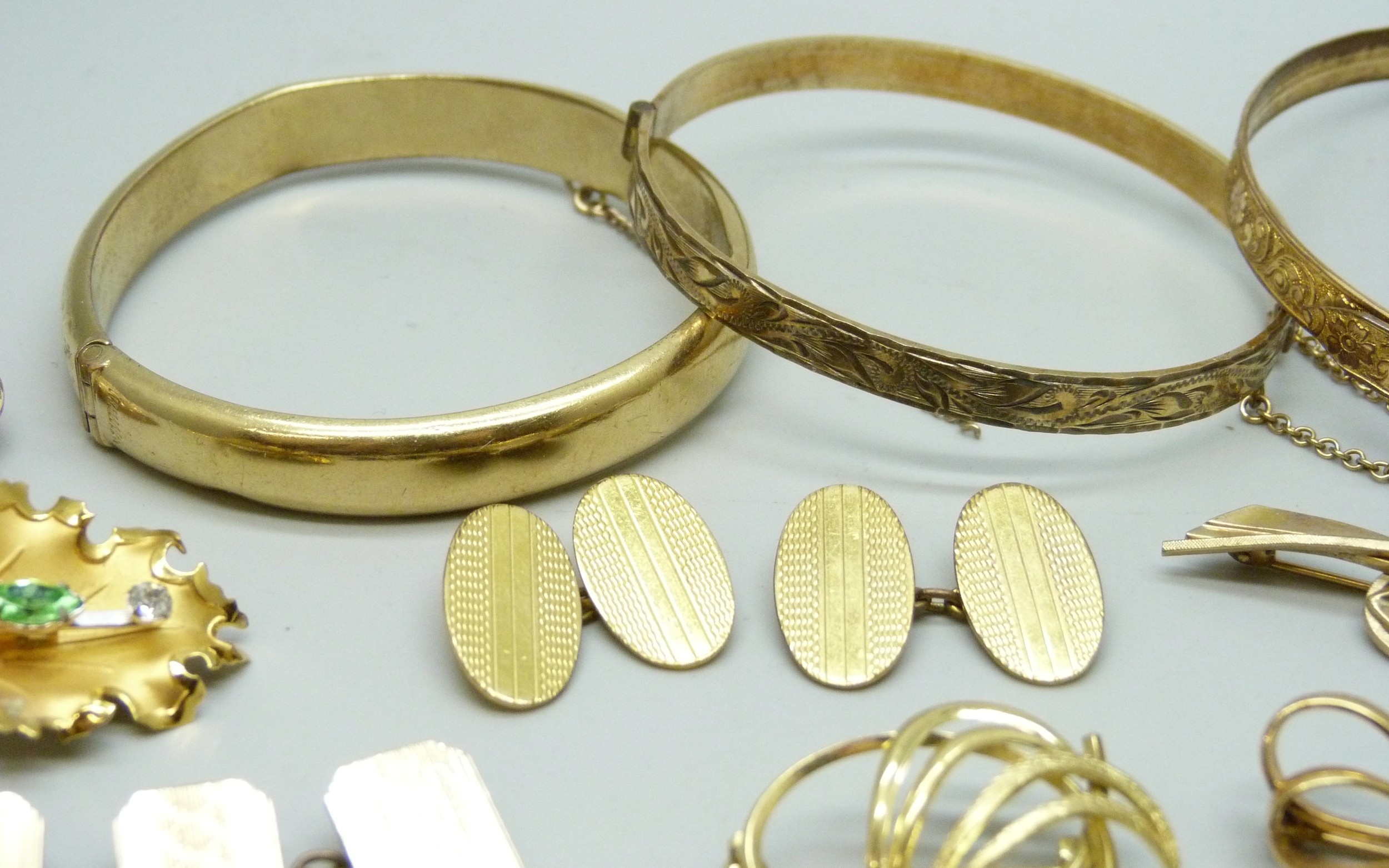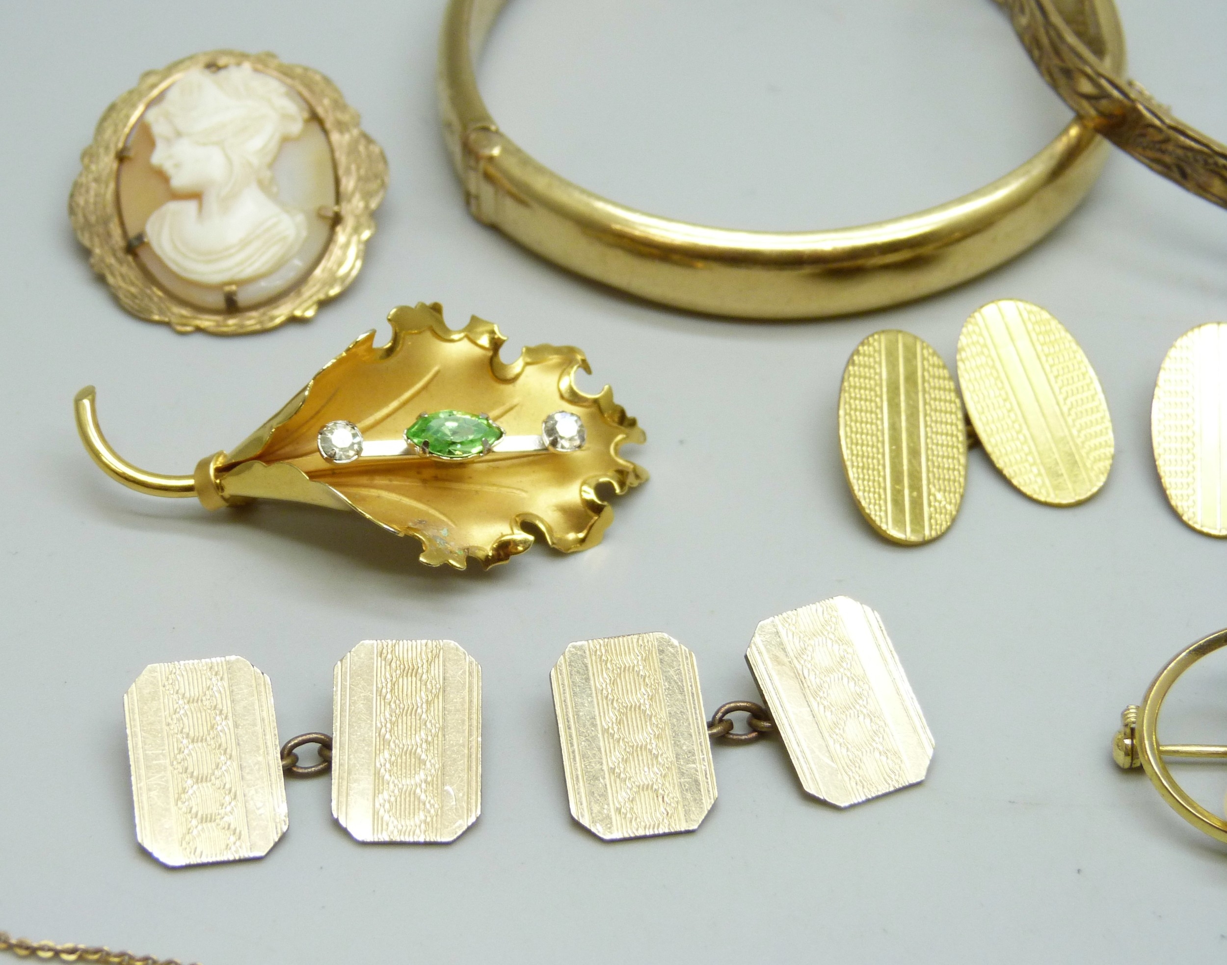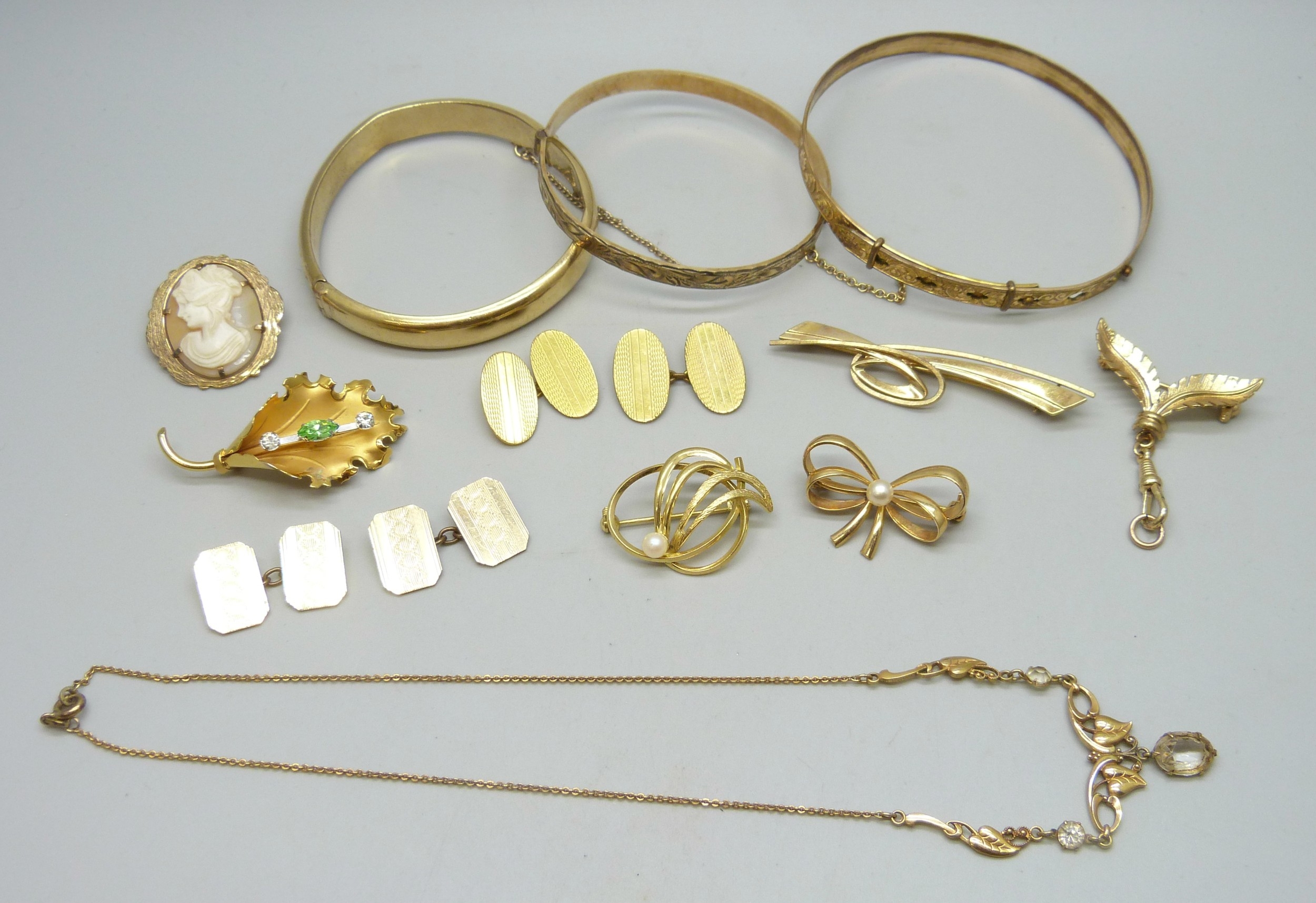 Three rolled gold bangles, a rolled gold cameo brooch, a rolled gold lead brooch, a pair of rolled gold cufflinks, a pair of 12ct gold back and front cufflinks, and other gold plated jewellery, 72g total