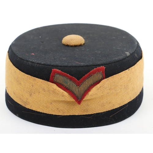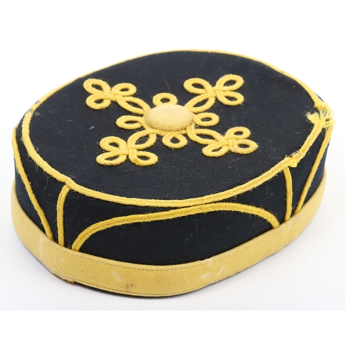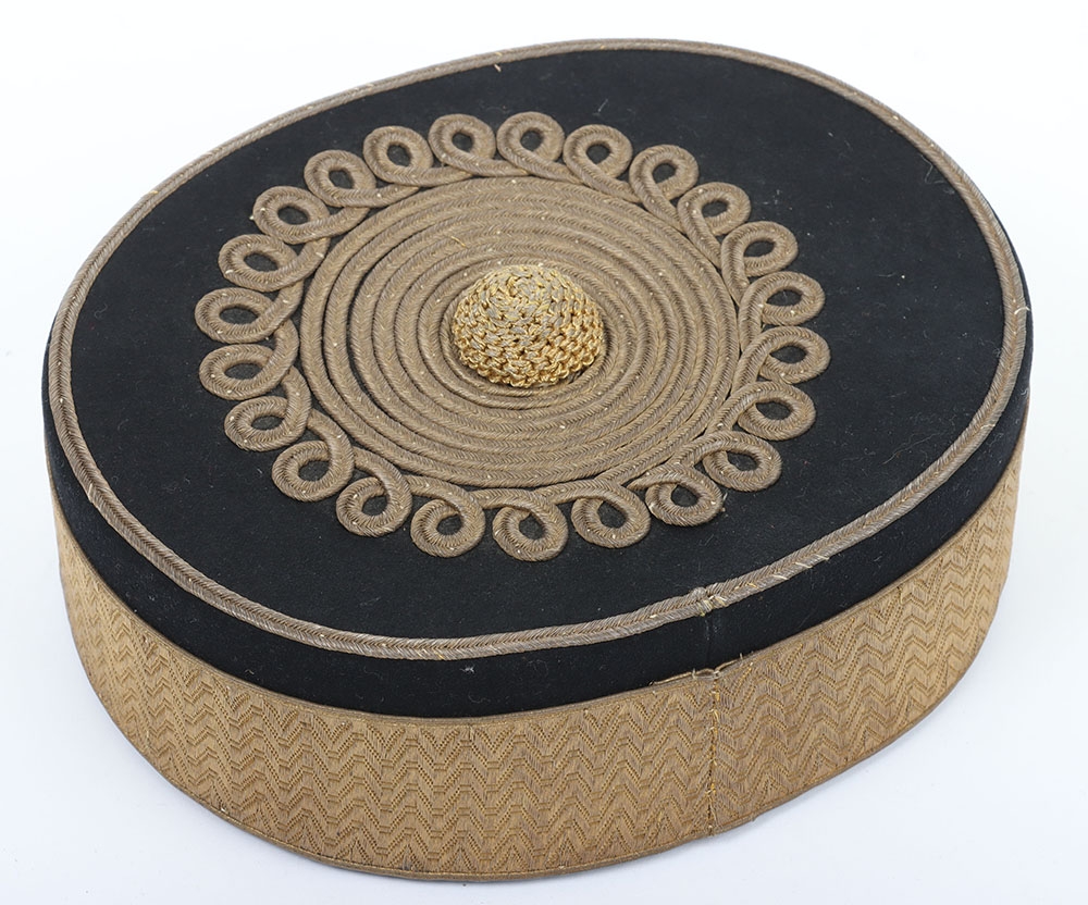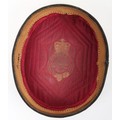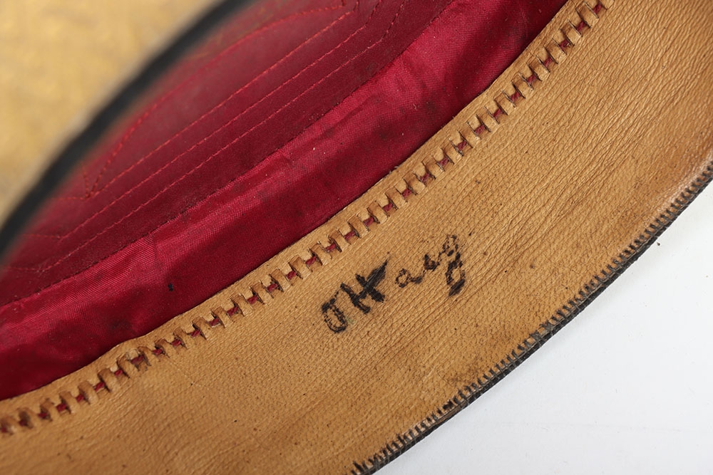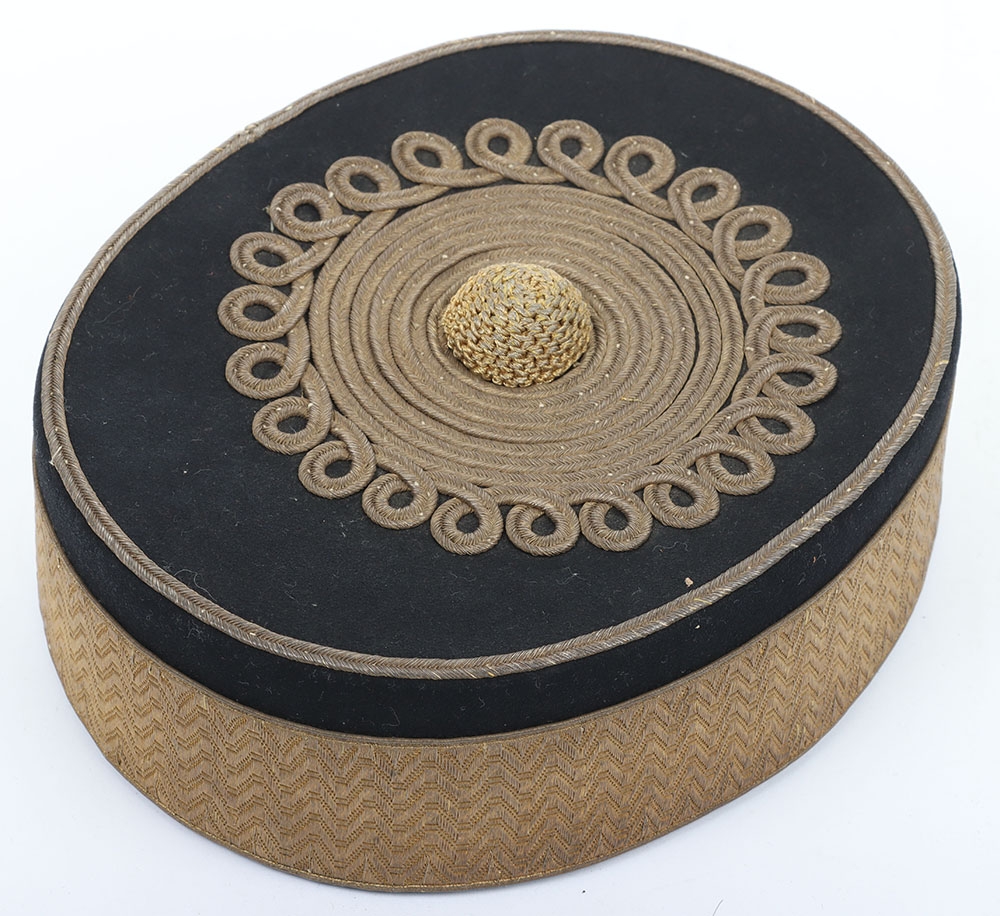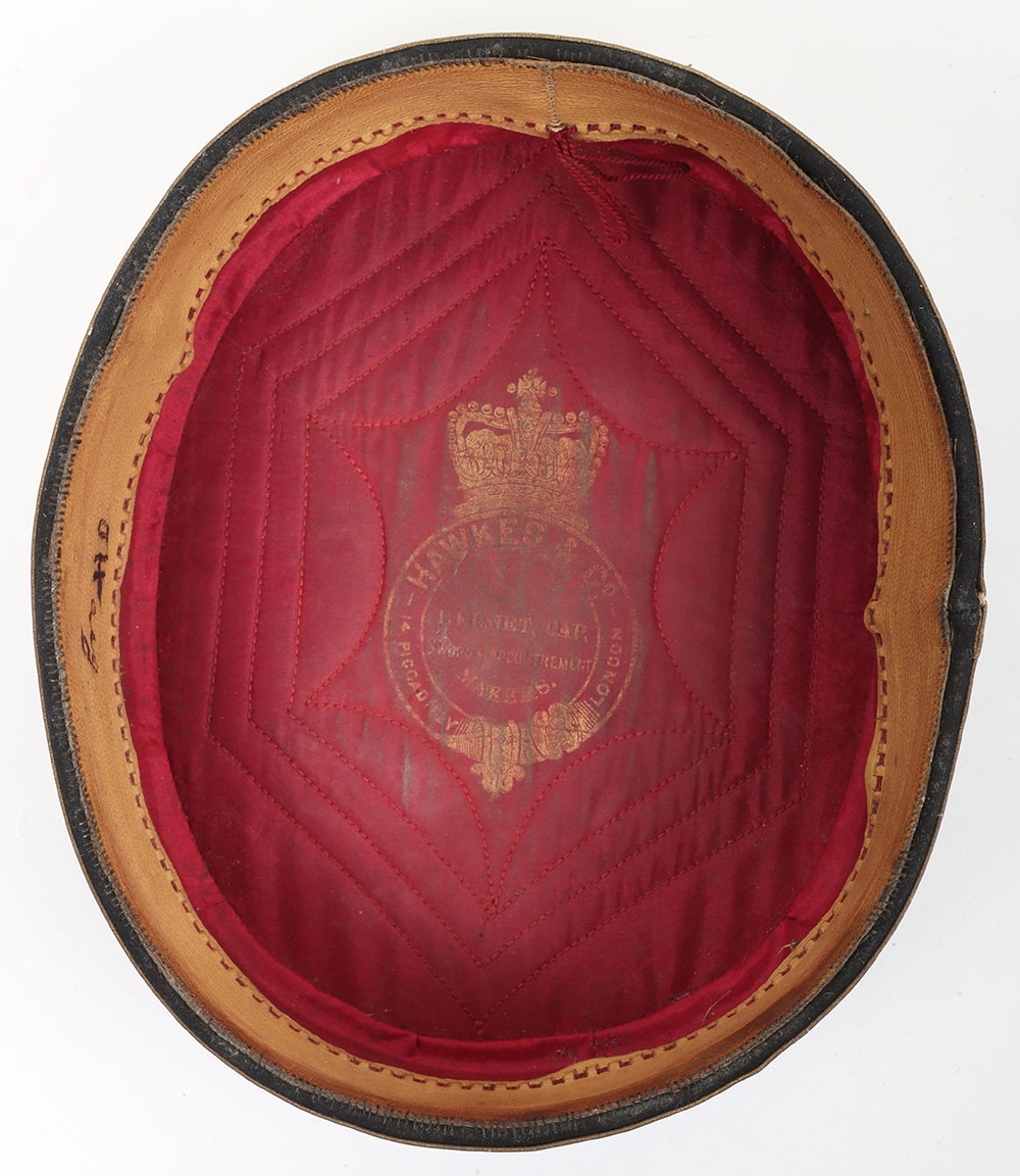 Hussar Officers Pill Box Cap. Made by Hawkes & co from dark blue cloth, with gilt lace to sides and embroidery to top. Crimson lining with leather band. In generally near very good condition, but with stitching fault to headband and replacement netted button.